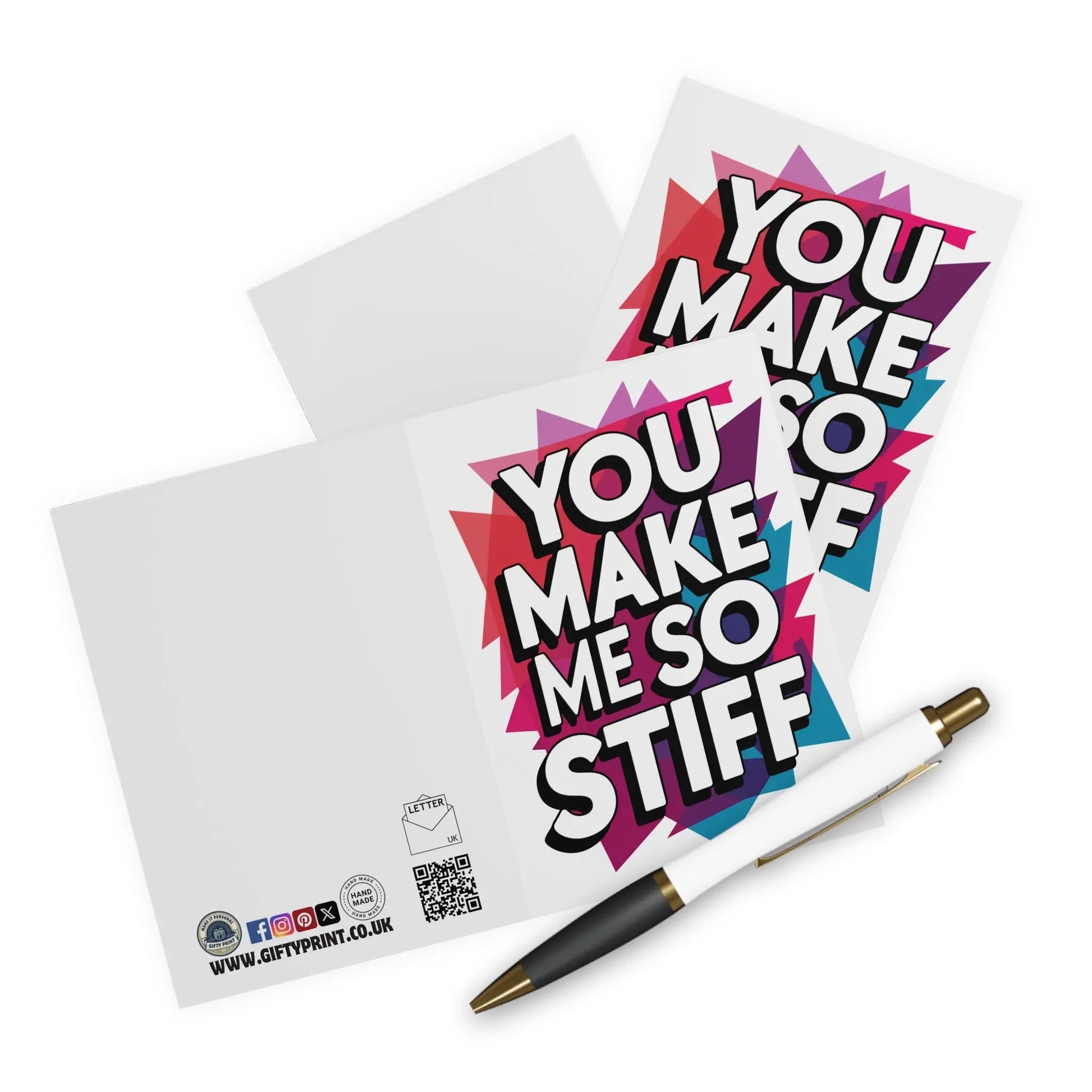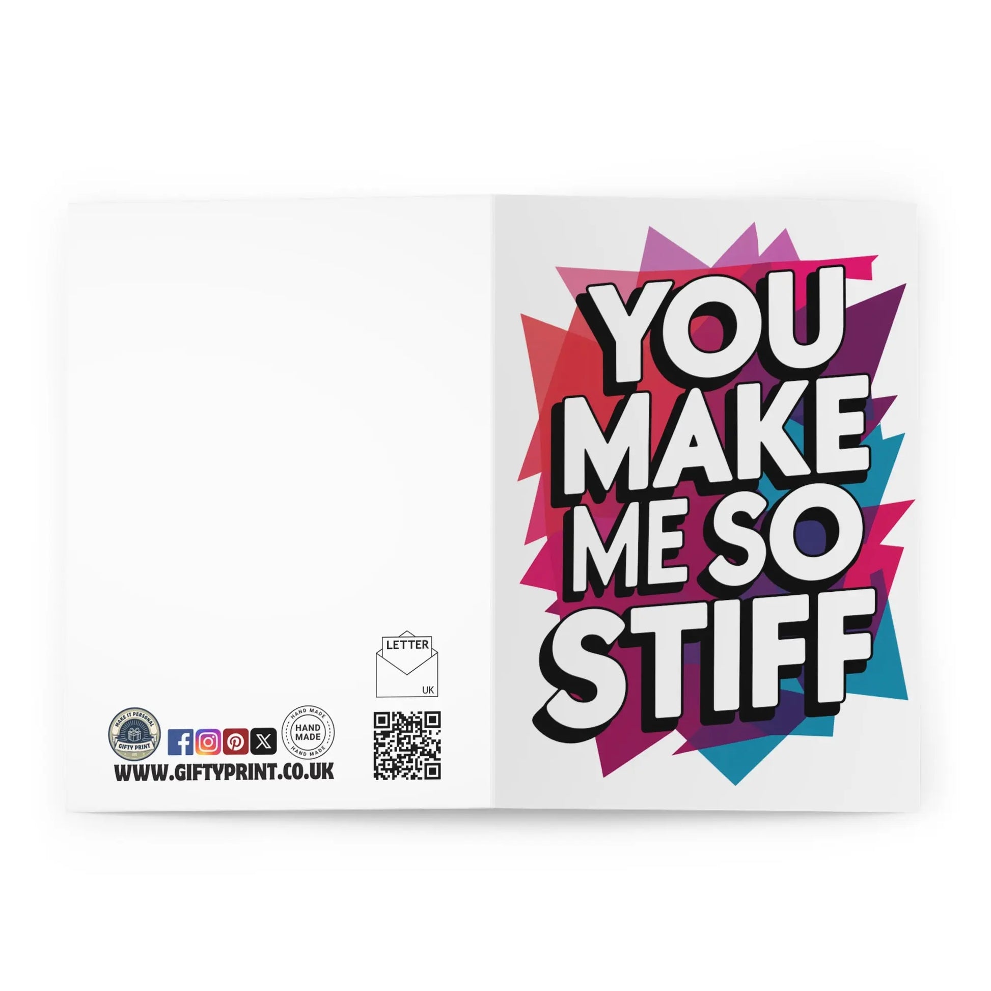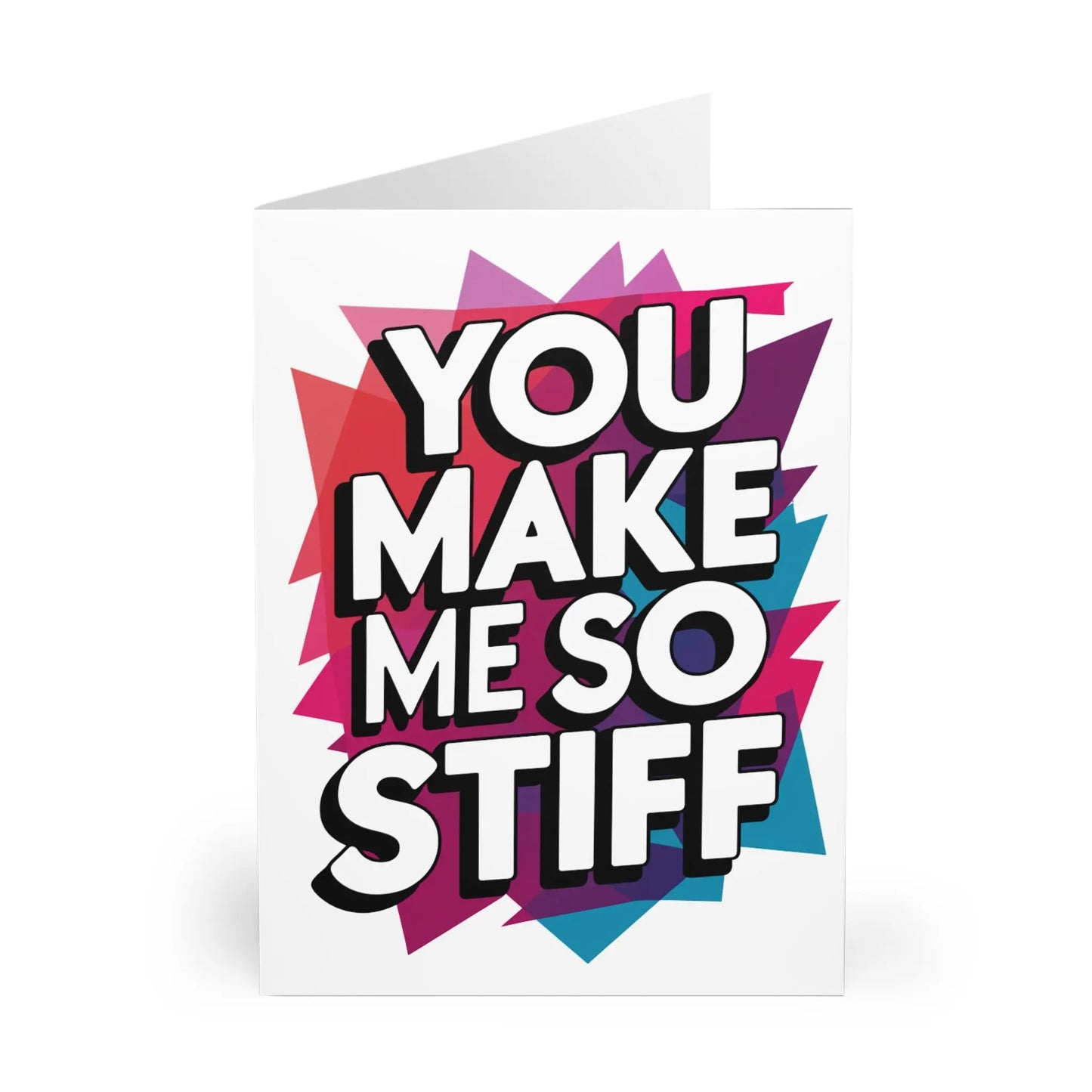 Funny Valentines Day Card Give your special someone a giggle with this Gay Valentine's Day card. Featuring the playful message "You Make Me So Stiff," this quirky card is sure to bring a smile to their face. Celebrate your unique love with a card that showcases your fun and humorous relationship.