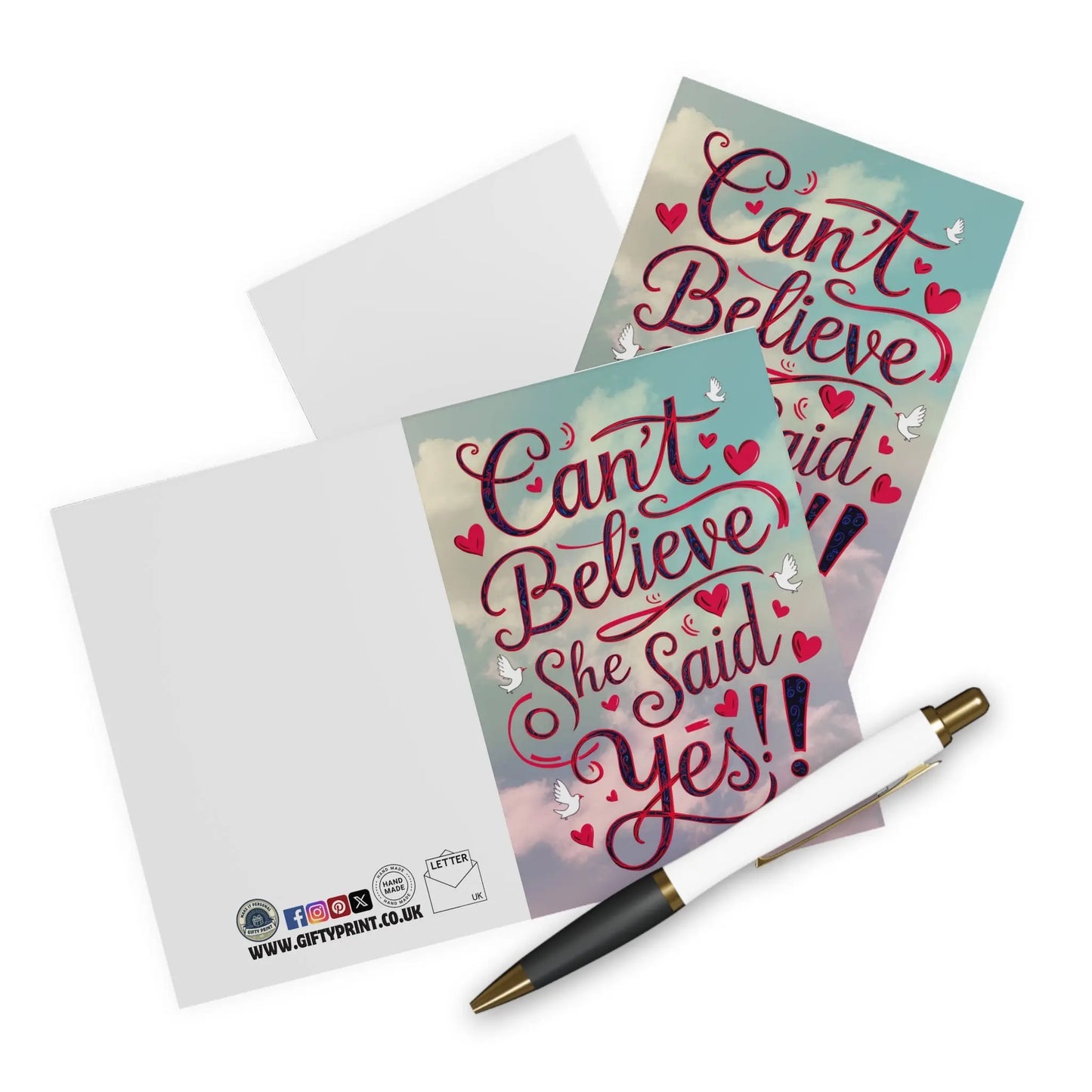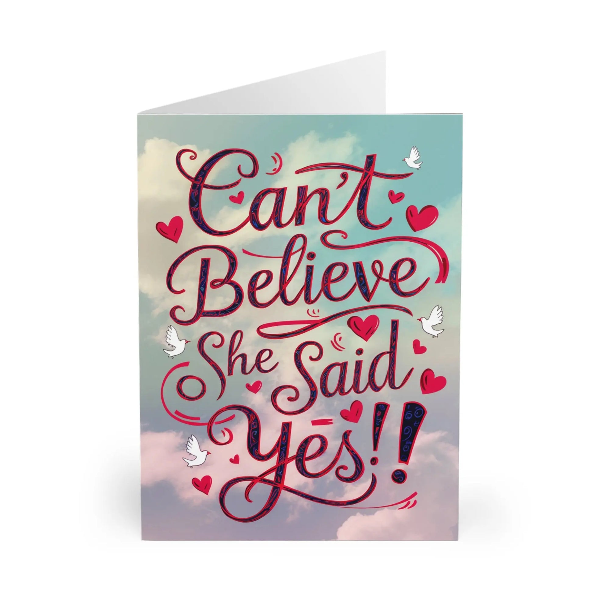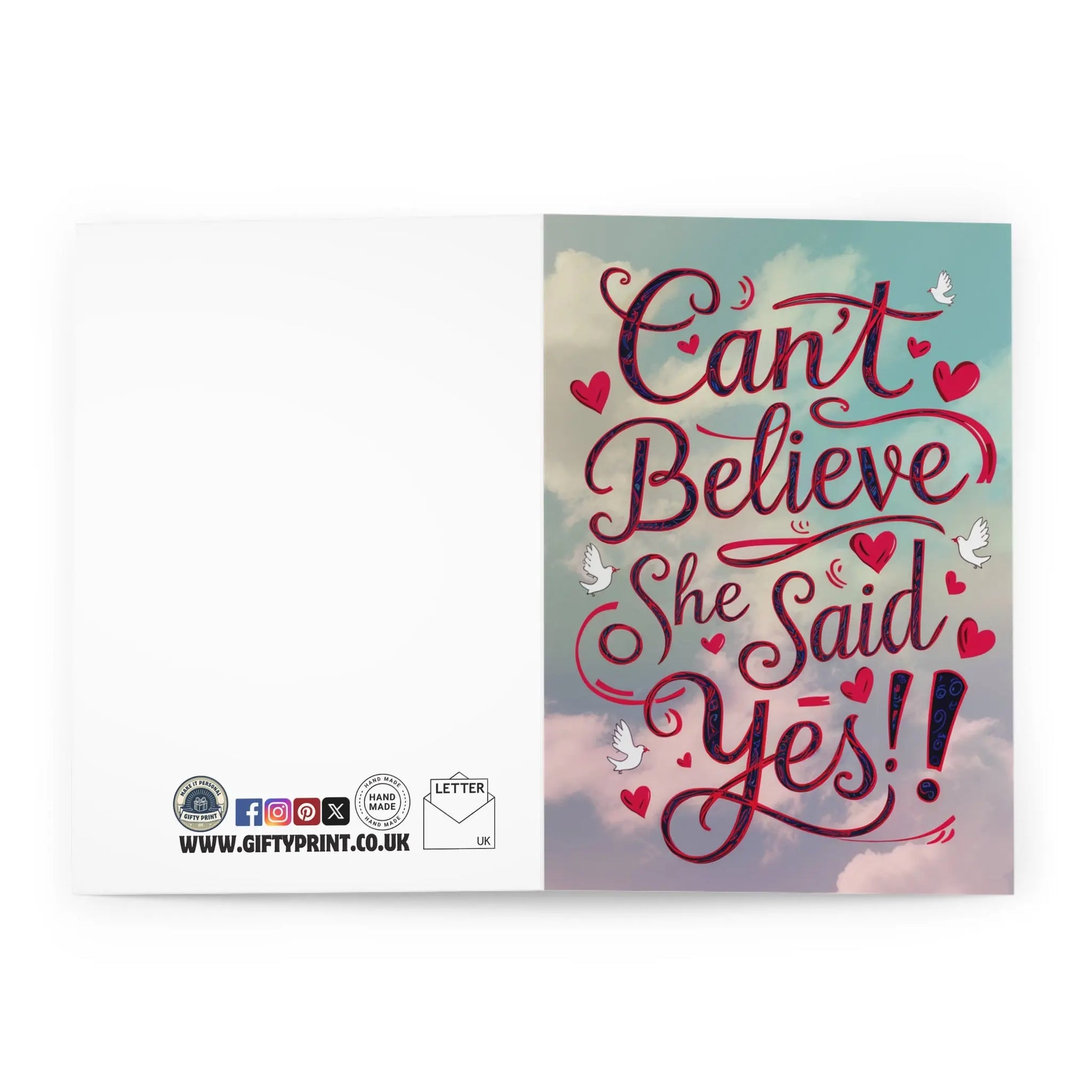 Funny Wedding Card. Celebrate their engagement with our "I Can't Believe She Said Yes" Wedding Card! Perfect for a playful and light hearted couple, this card features quirky word play and a touch of humour. Show them you're excited for their big day (and their future together!).