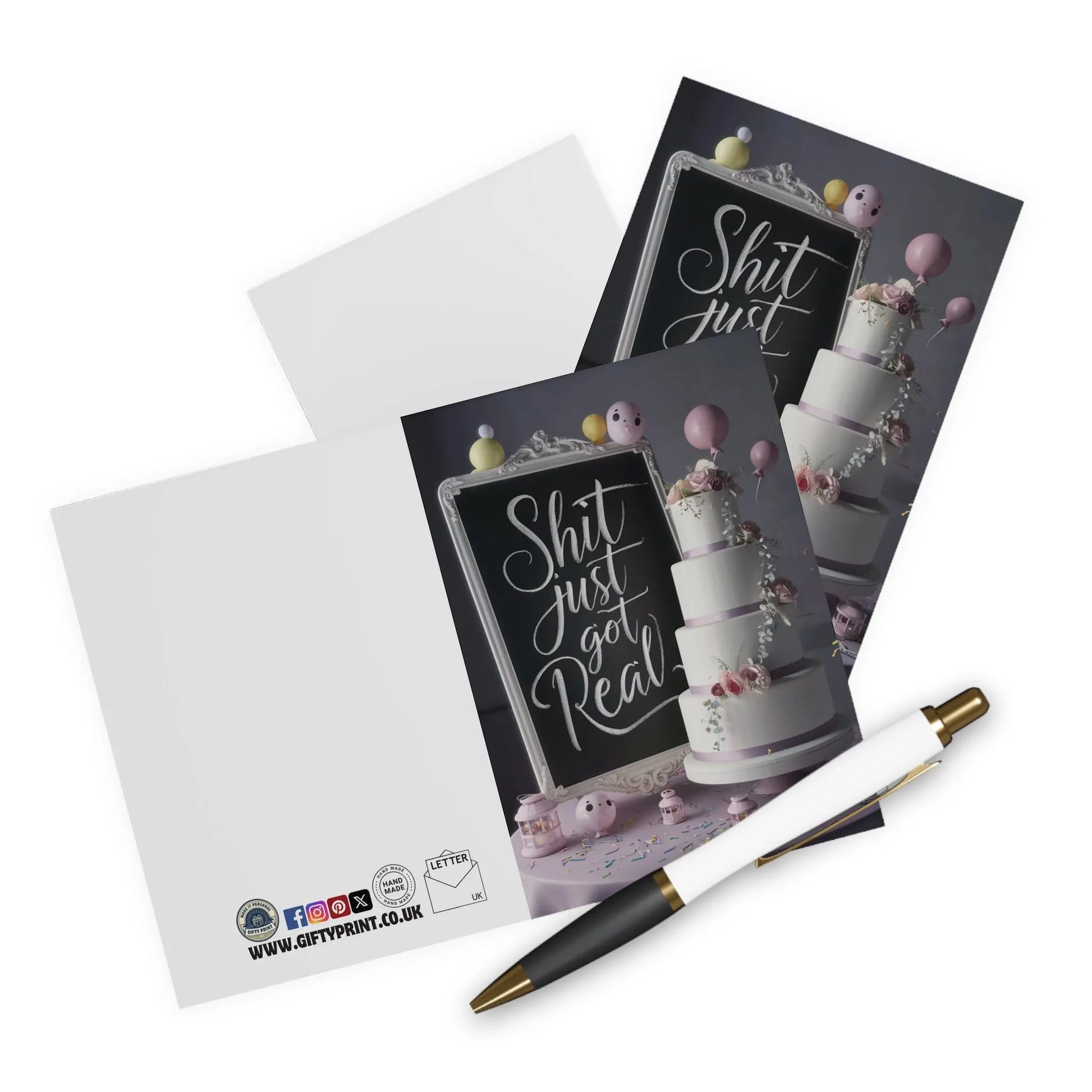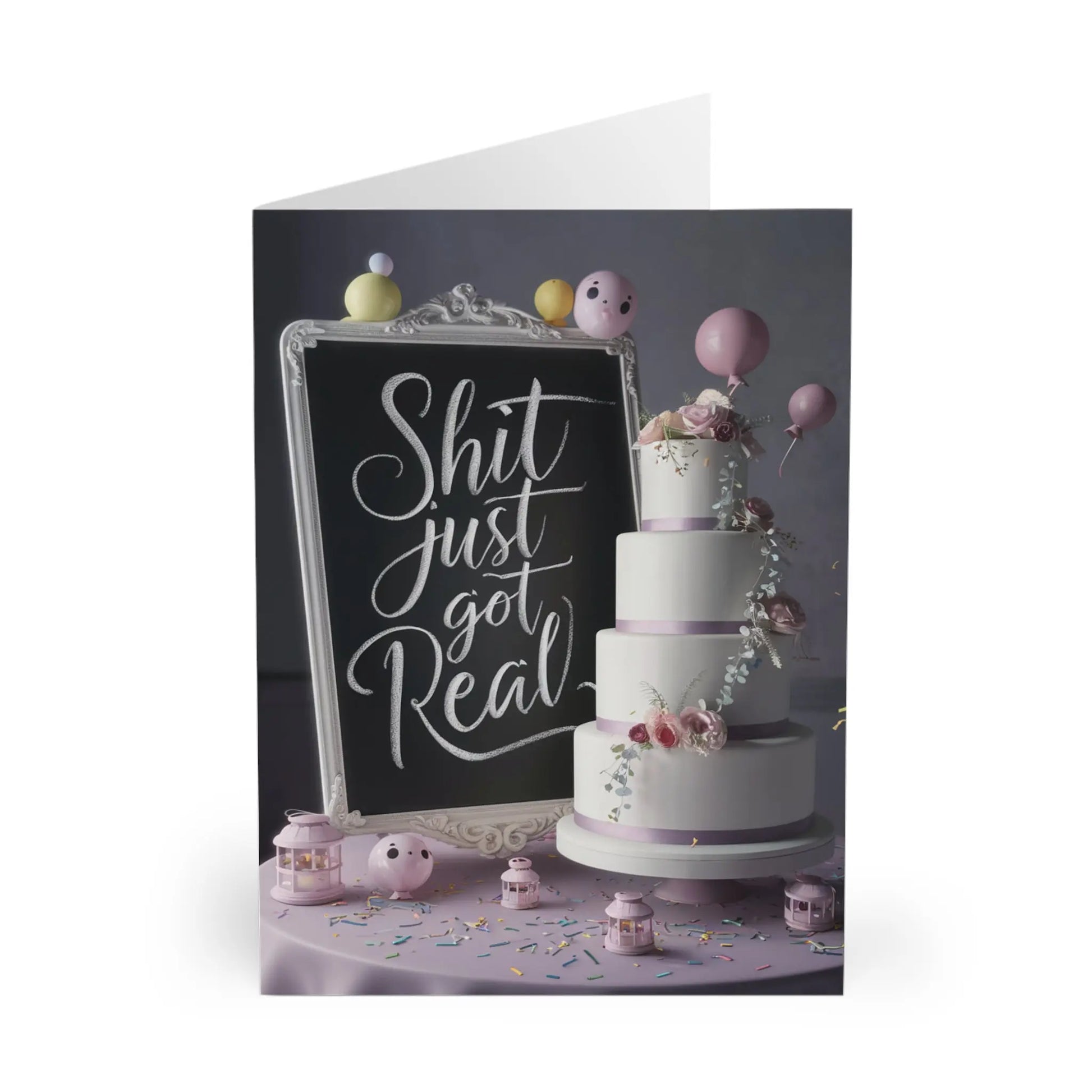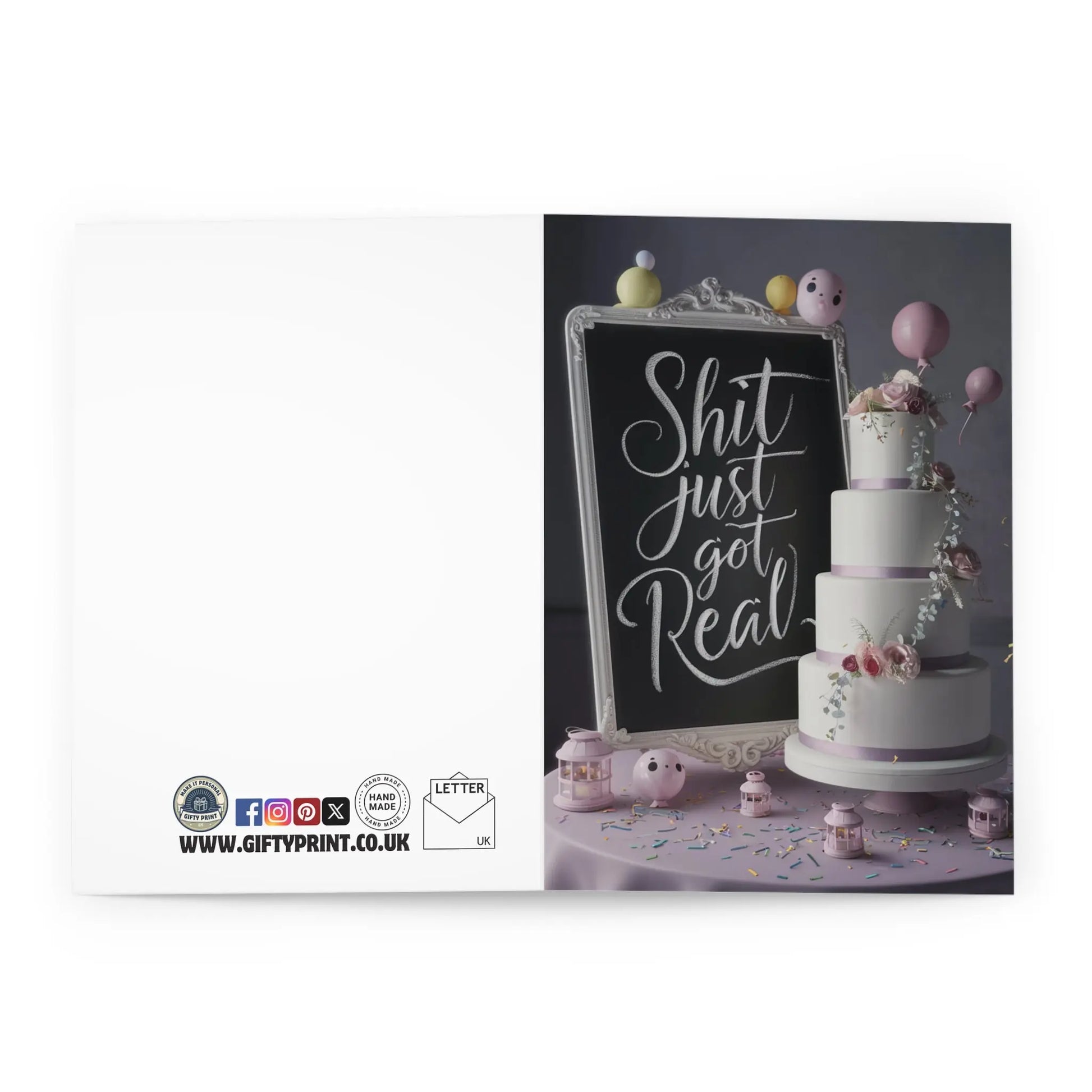 Funny Wedding Card, Get ready to say "I do" in style with our Shit Just Got Real Wedding Cake Wedding Cards! These unique cards add a touch of quirkiness to your special day, making them a memorable keepsake for all your guests. Share the love and laughter with our fun and playful design. (Because let's be real, weddings can be stressful!)