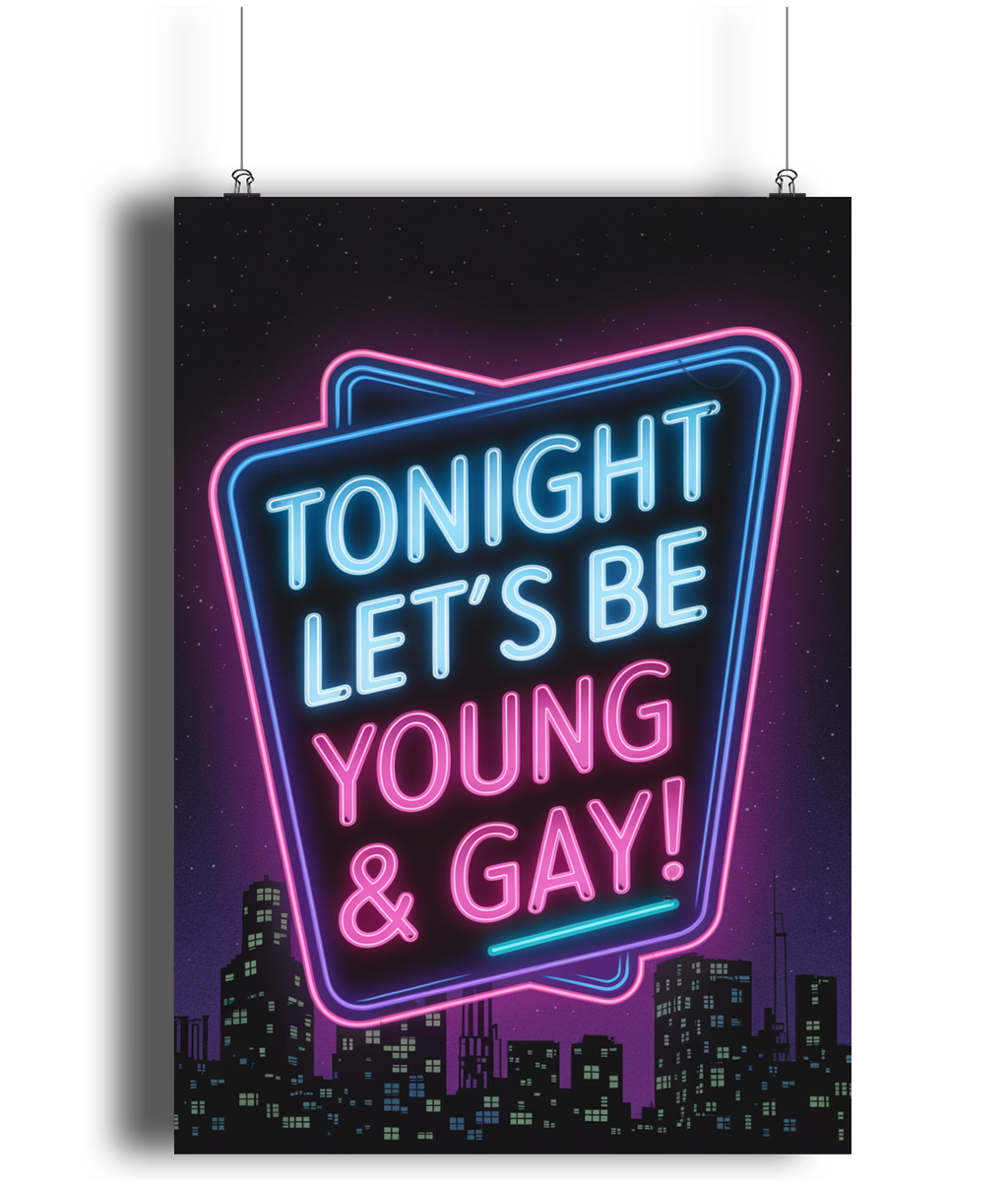 Unleash your inner youth with this vibrant gay art print! Featuring neon colors and a playful message, "Tonight Let's Be Young & Gay," this print will add a fun and quirky touch to any space. Celebrate pride and embrace your playfulness with this unique piece.