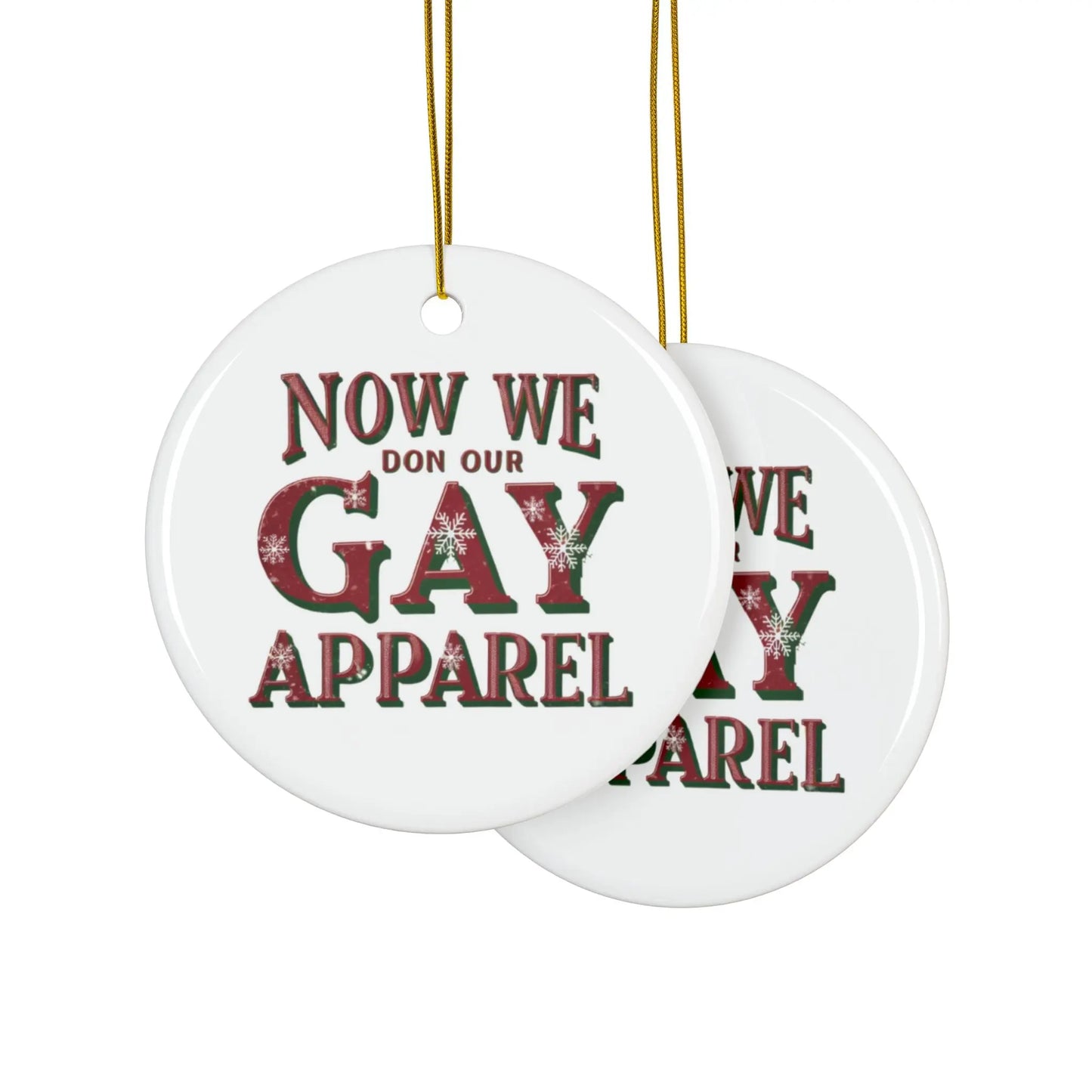 Gay Christmas Bauble, Get ready for a fabulous holiday season with our Gay Christmas Bauble! Adorned with the playful phrase "We Don Our Gay Apparel," this bauble is perfect for adding some fun and personality to your Christmas tree. Spread joy and inclusivity with this quirky decoration.