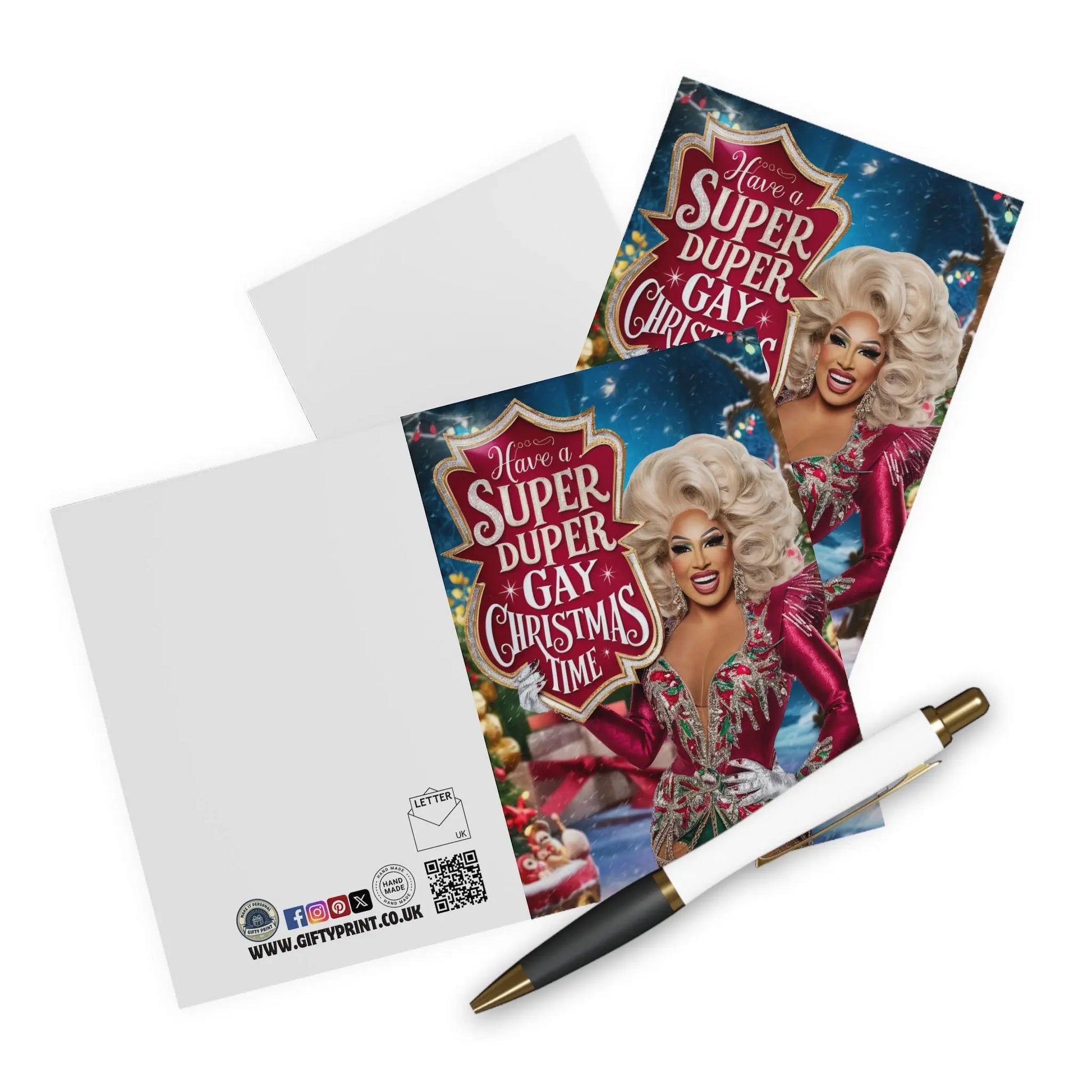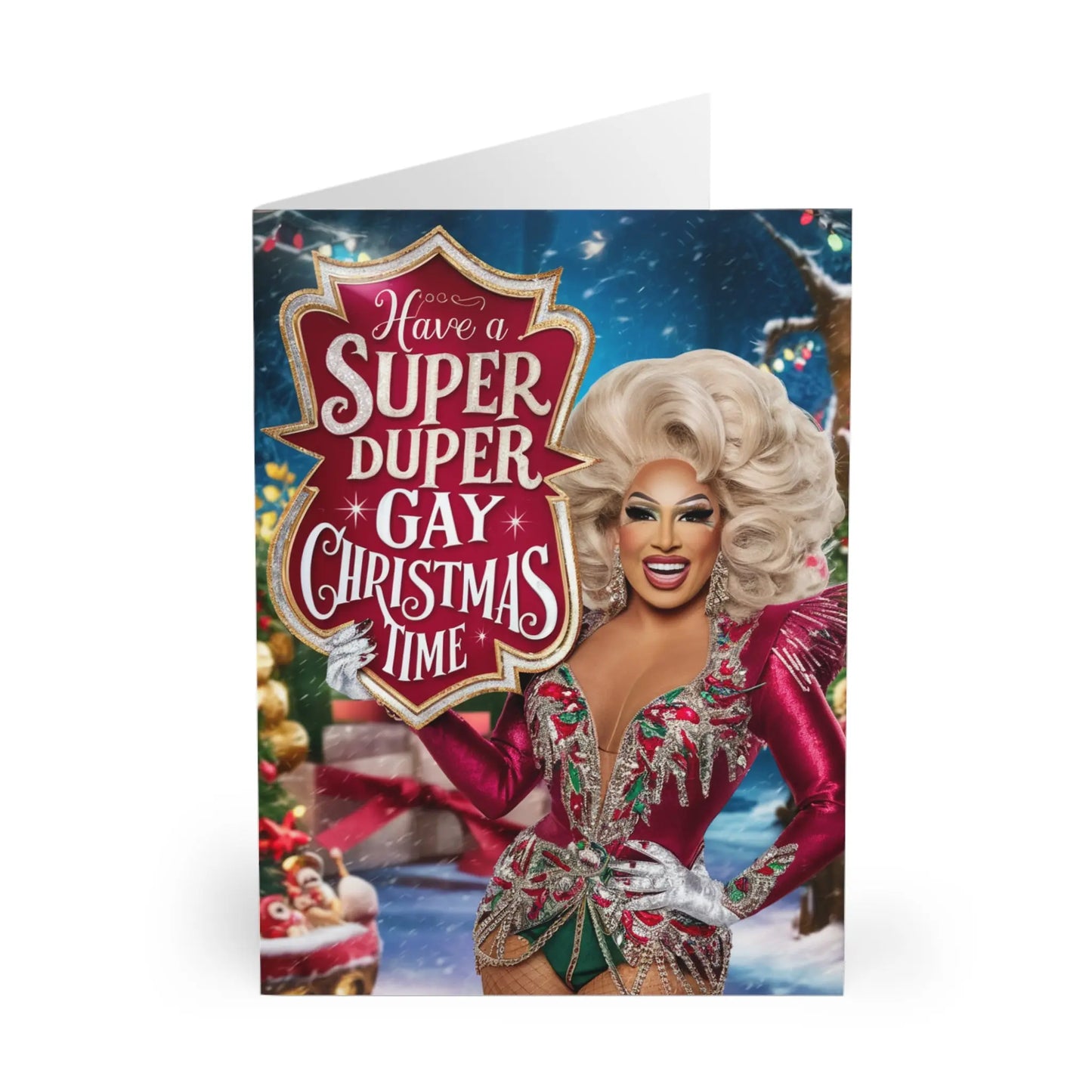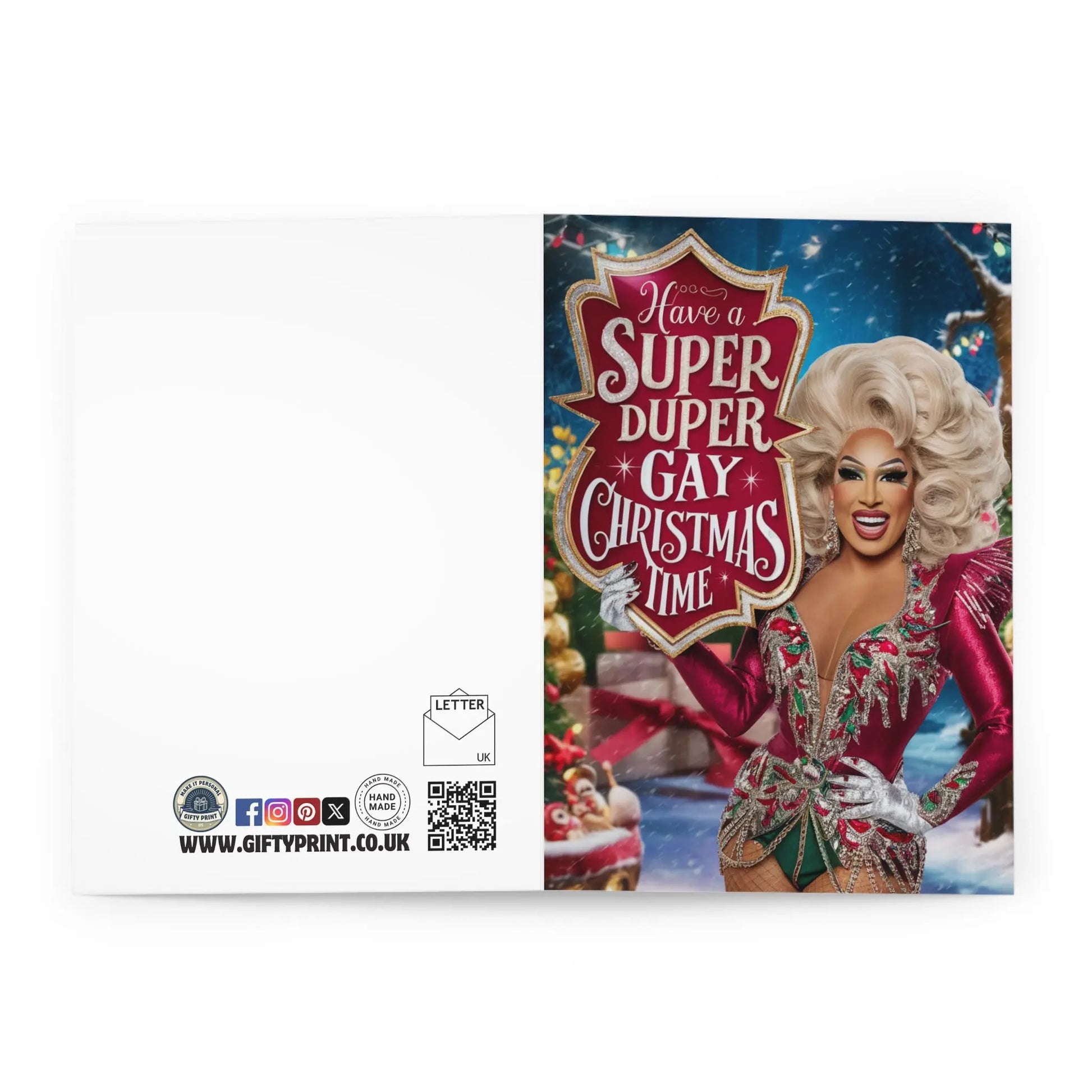 Gay Christmas Card, Spread holiday cheer with this fabulous Gay Christmas card, featuring a drag queen wishing you a super duper gay Christmas. Show your pride and humour with this unique card.