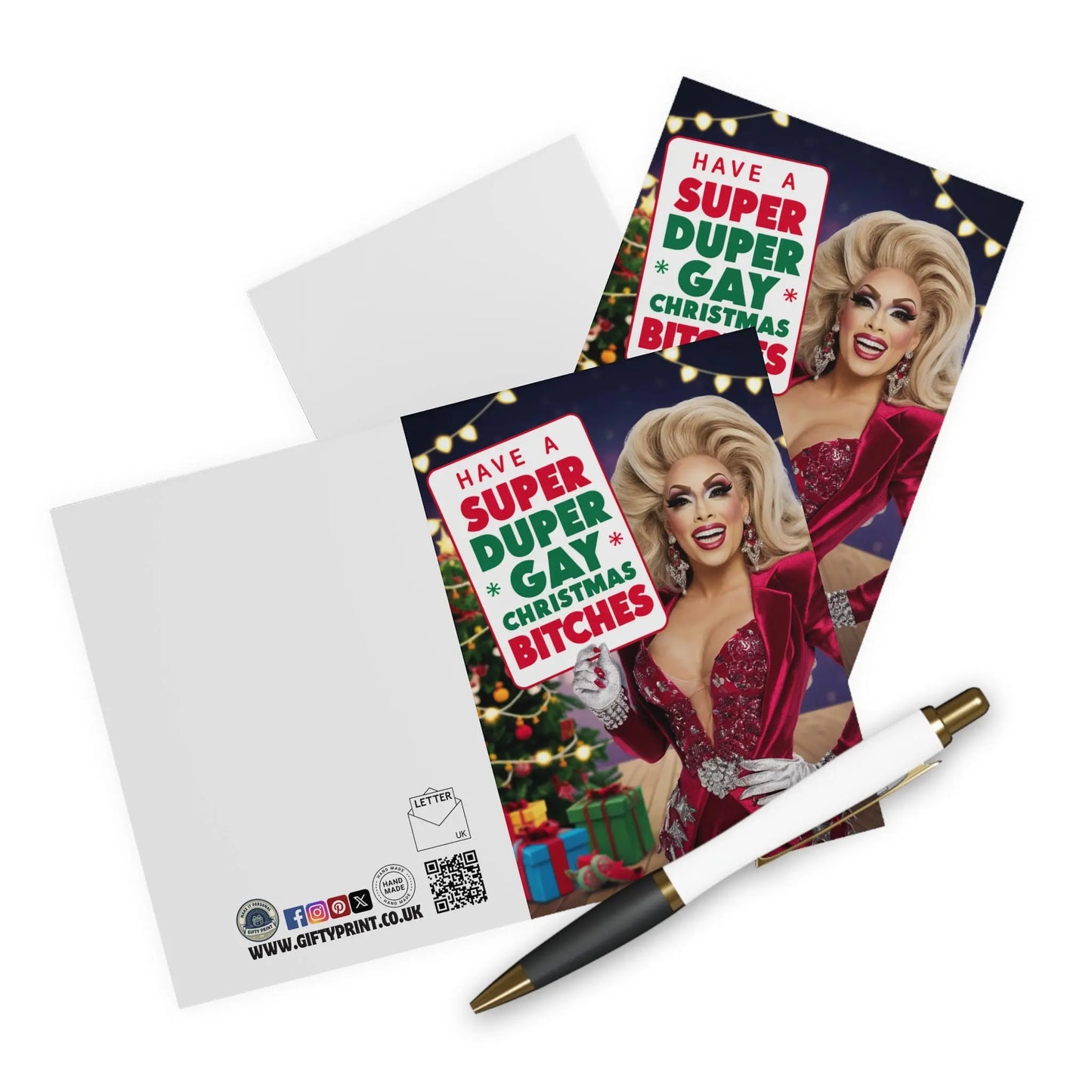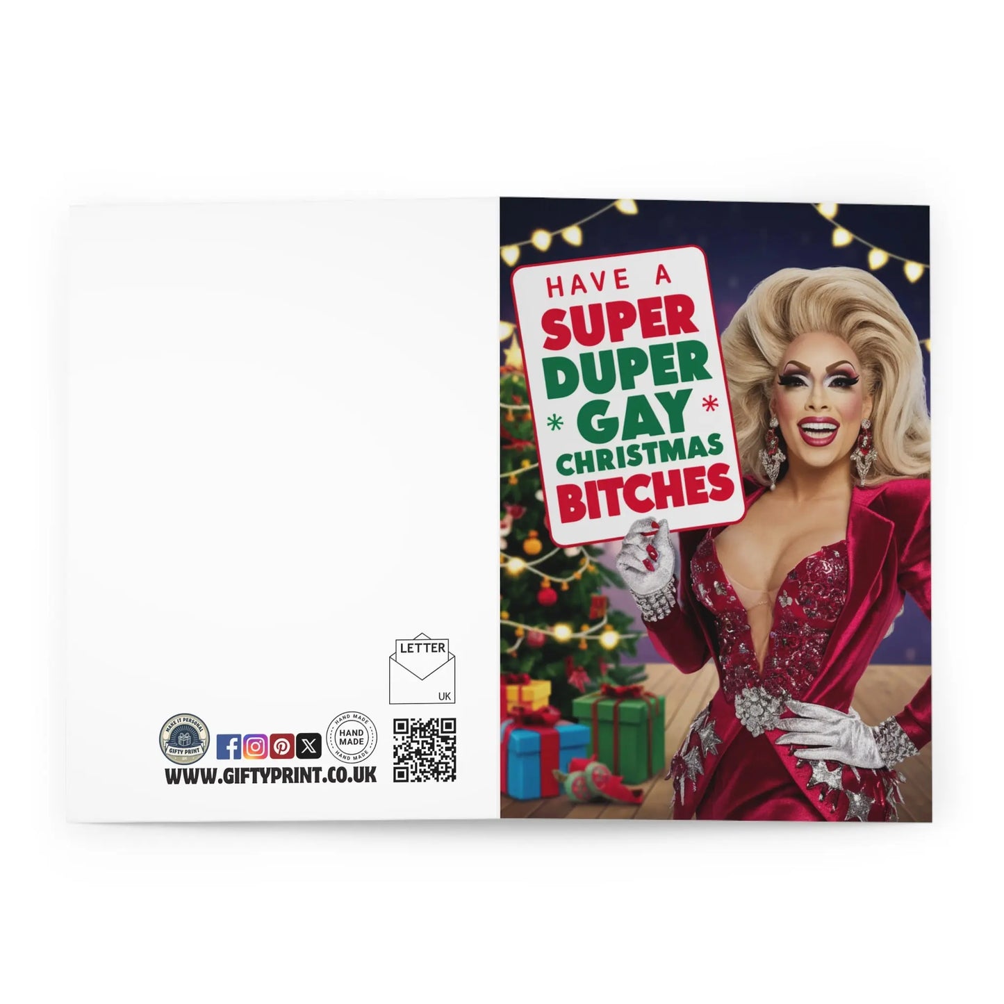 Gay Christmas Card, Send holiday cheer with this hilarious gay Christmas card featuring a drag queen and the message, "Have a Super Duper Gay Christmas, Bitches!" Perfect for anyone who loves to spread laughter and celebrate pride. Get ready to sleigh this holiday season!