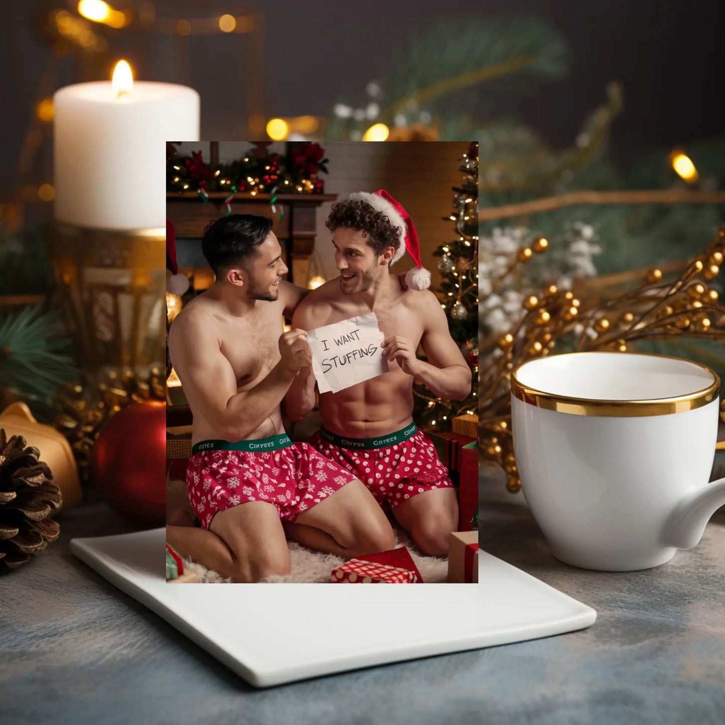 Gay Christmas Card, Celebrate the holiday season with this hilarious Funny Gay Christmas Card! Featuring a clever play on words, this card is perfect for your partner or friend. (No innuendos here, just a playful nod towards Christmas dinner!) Show off your sense of humour and spread some holiday cheer with this card.