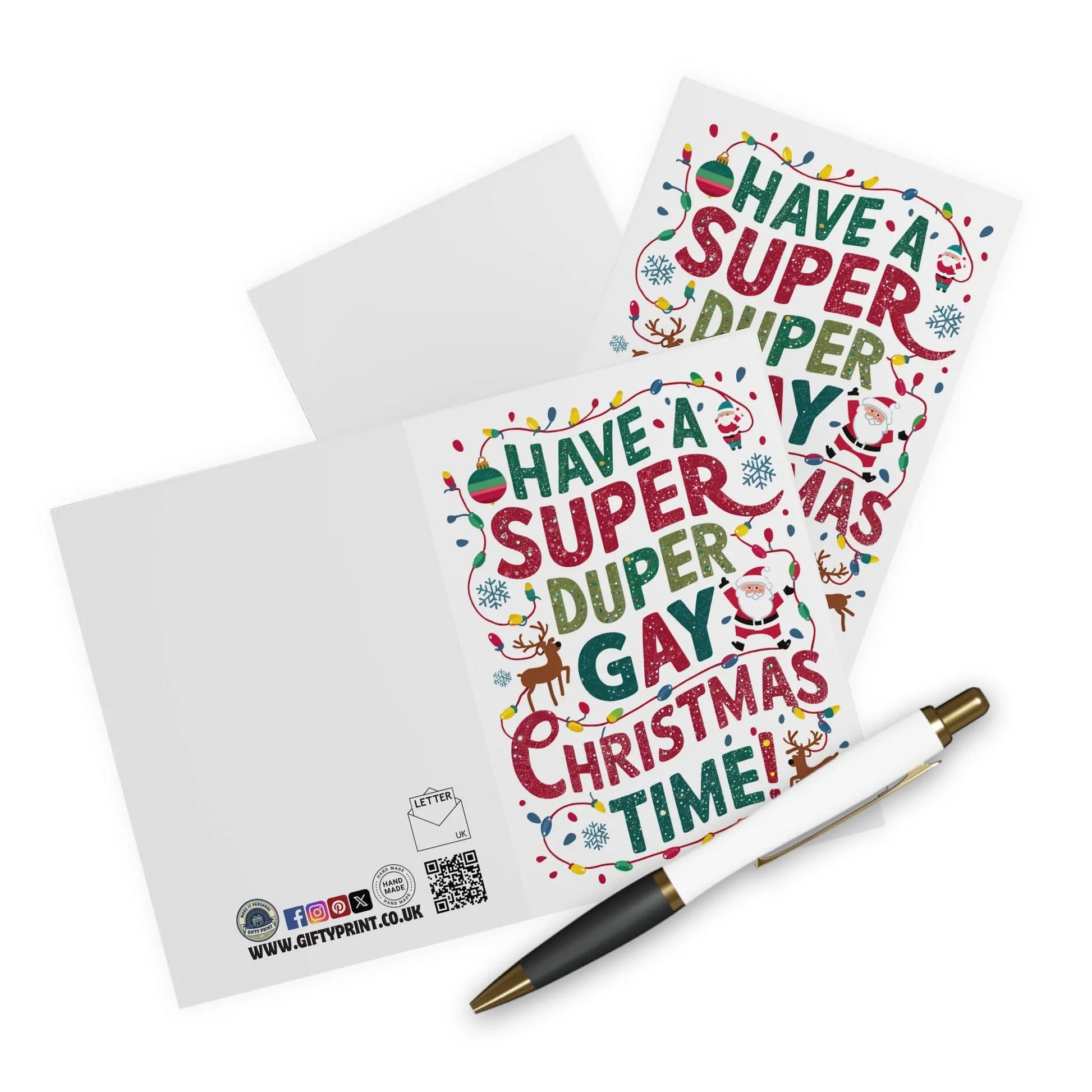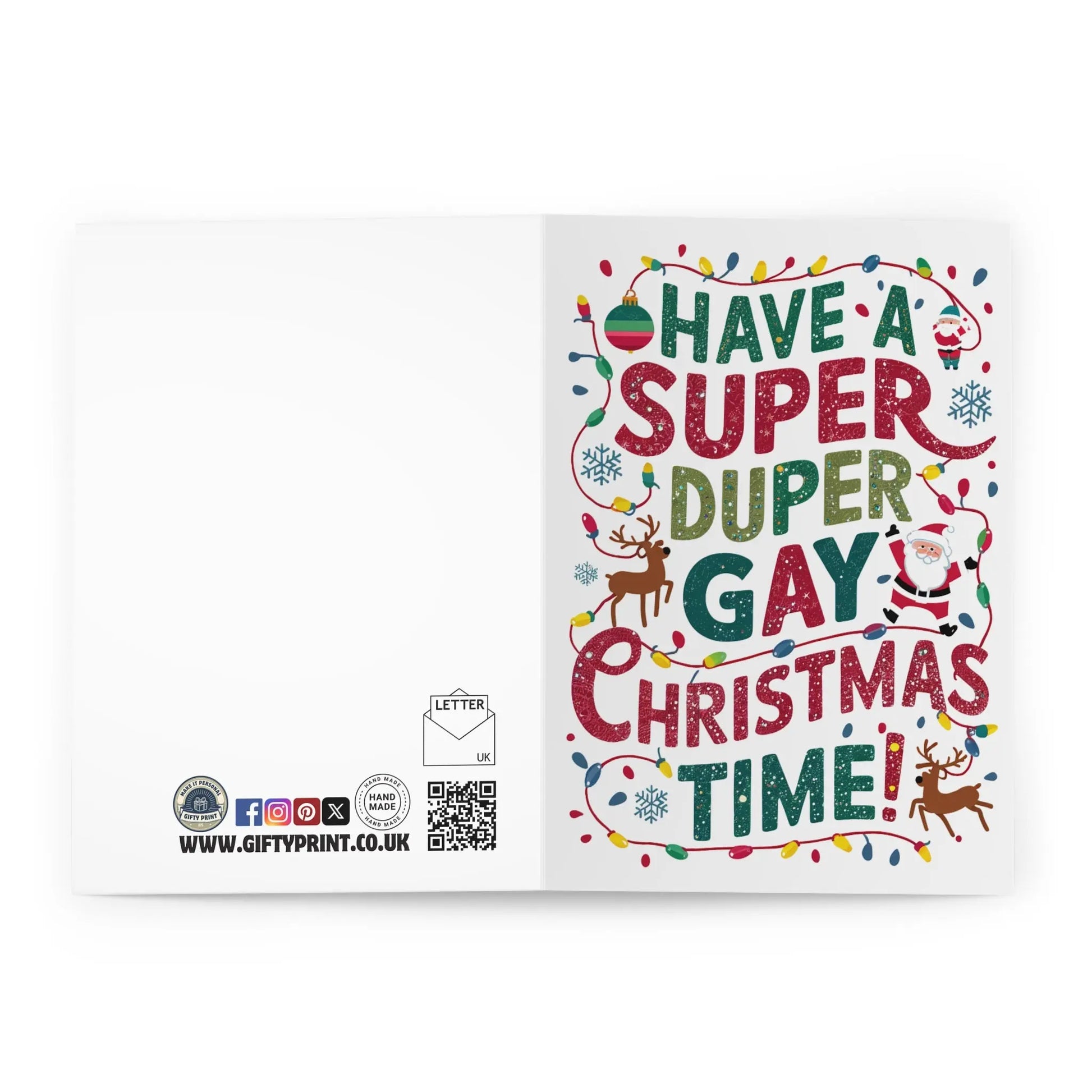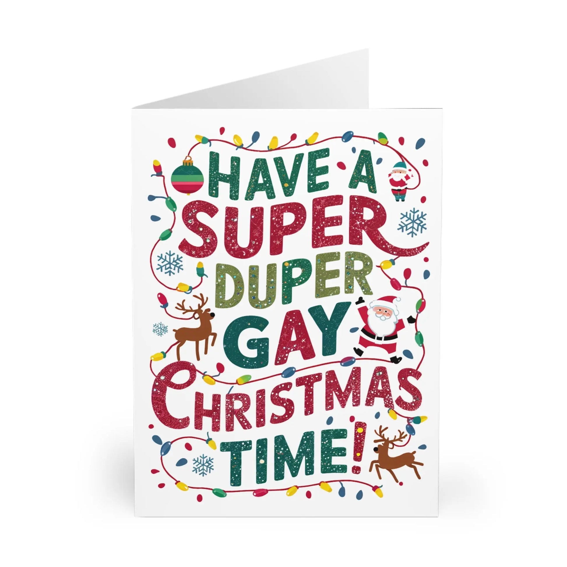 Gay Christmas Card, This isn't your typical Christmas card! With this Gay Christmas Card, you'll be spreading cheer in a whole new way. Wish your loved ones a Super Duper Gay Christmas Time with this fun and playful card. Perfect for those who like to celebrate the holidays with a twist.