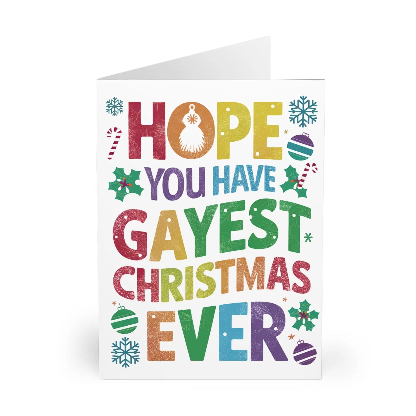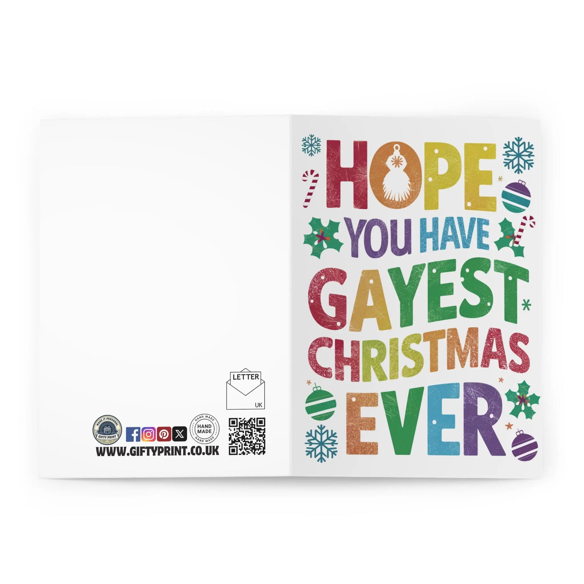 Gay Christmas Card, Spread joy and laughter this season with the Gay Christmas Card! Featuring a playful message wishing for the "gayest" Christmas ever, this card is perfect for anyone who doesn't take themselves too seriously. Show your love and support for the LGBTQ+ community while adding a touch of humour to the holidays.