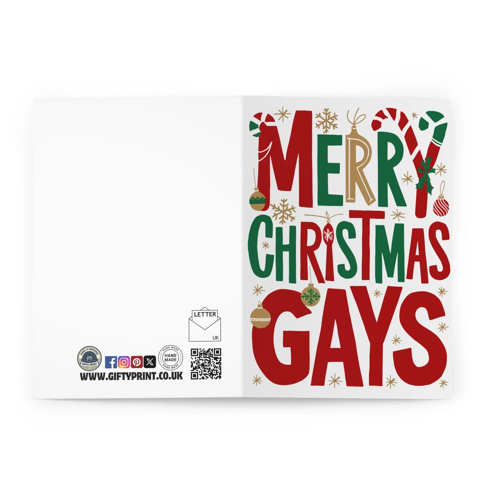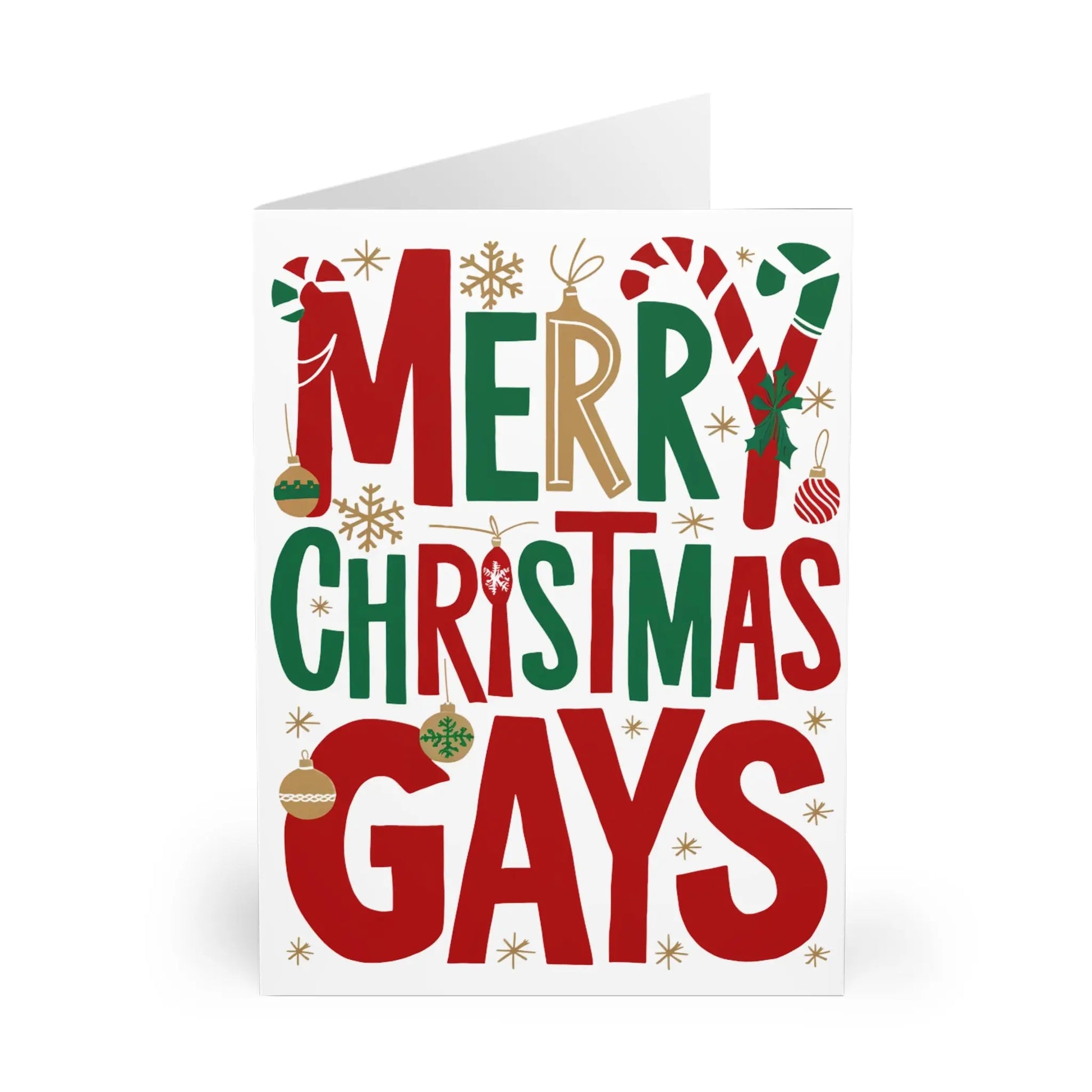Spread some holiday cheer with this Gay Christmas Card! Featuring a playful design and the festive message "Merry Christmas Gays", this card is perfect for sending to your LGBTQ+ friends and family. Let them know they are loved and included during the holiday season.