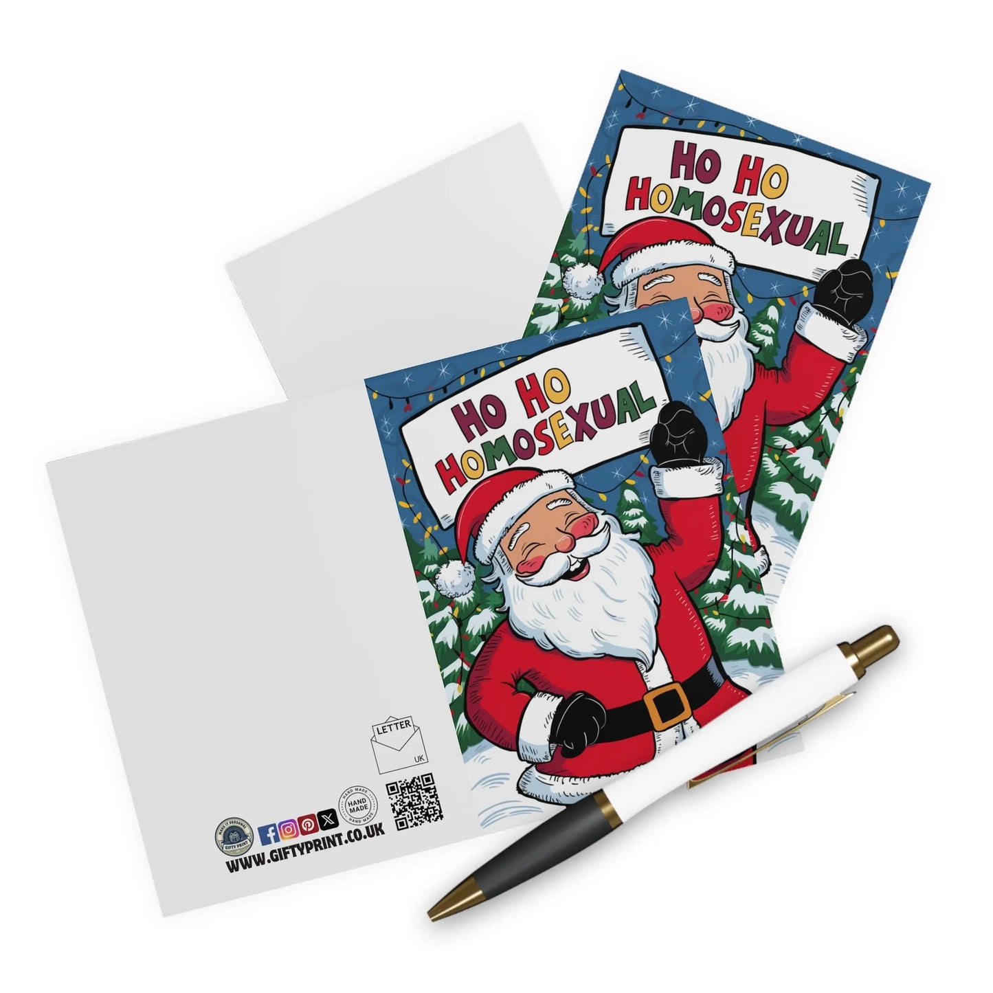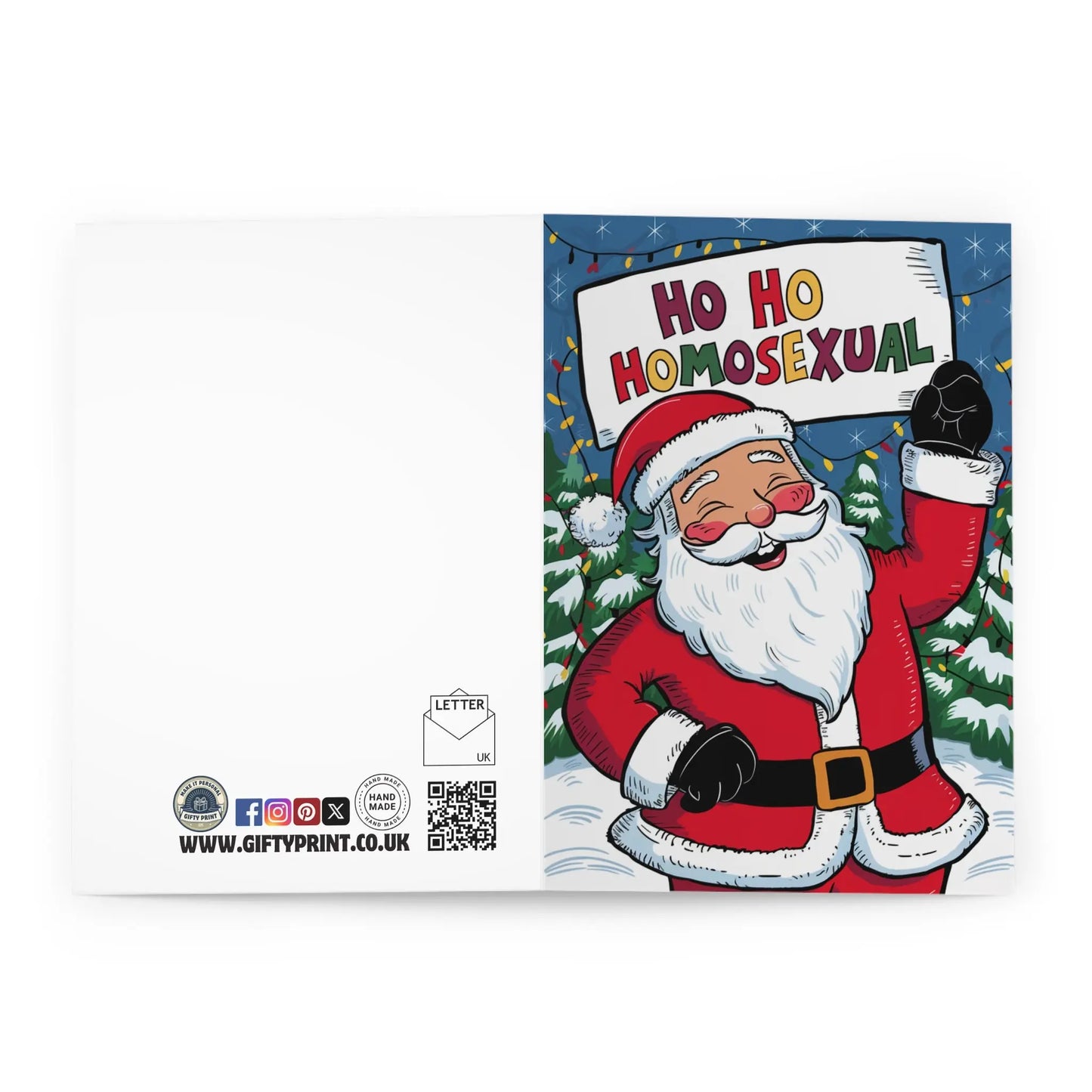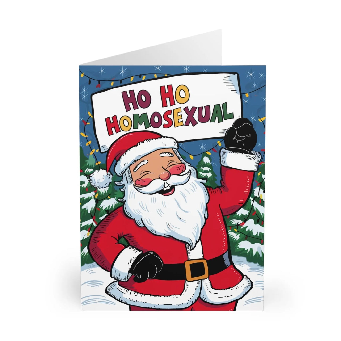 Gay Christmas Card, Spread holiday cheer with our Gay Christmas Card featuring a jolly Santa exclaiming "Ho Ho Homosexual"! This playful and unique card is perfect for the LGBTQ+ community and their allies. Share a laugh and celebrate diversity this holiday season. (Ho ho have a holly jolly holiday!)
