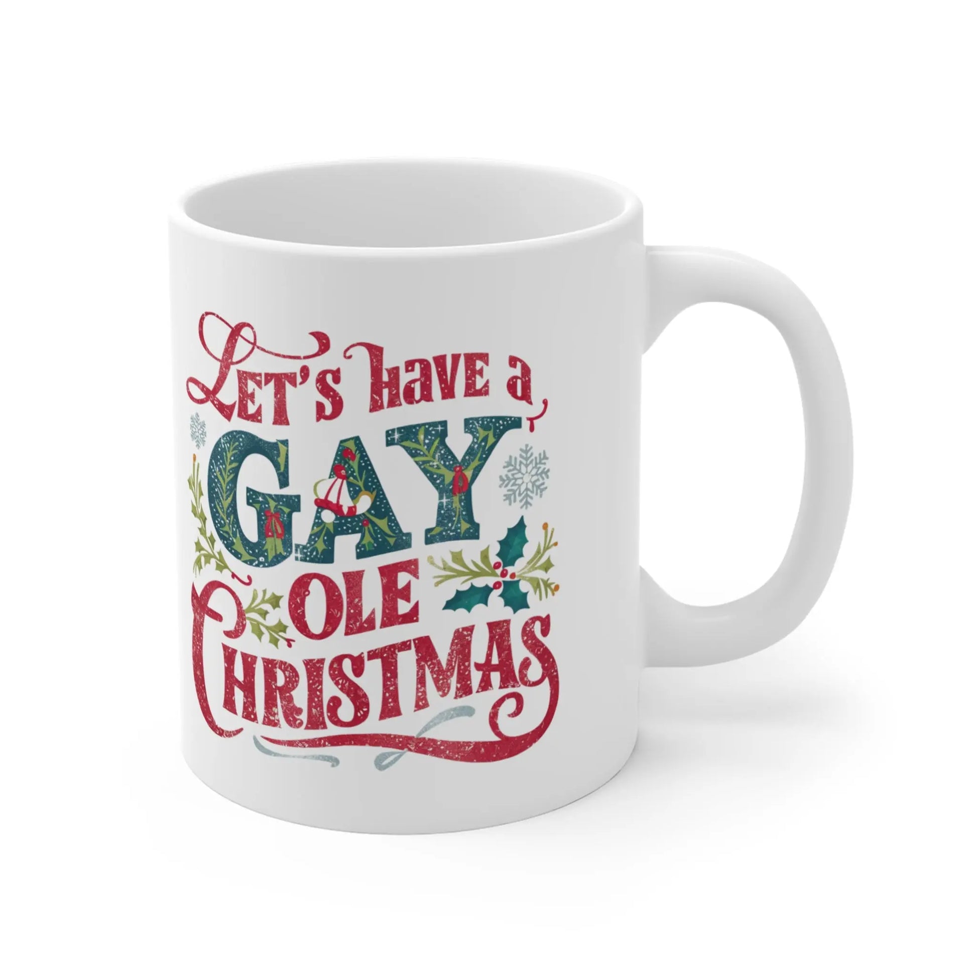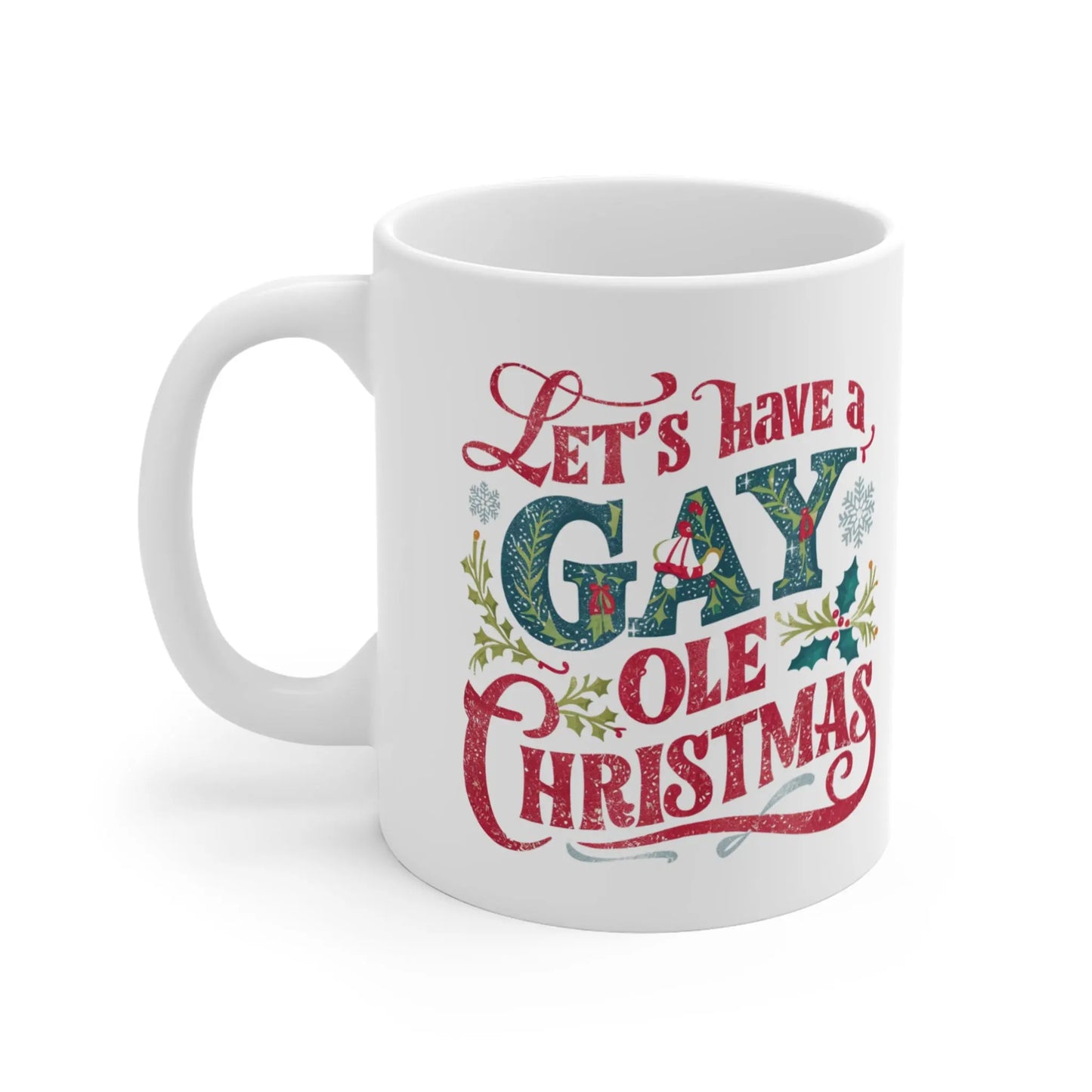 Gay Christmas Mug, Get into the holiday spirit with our Gay Christmas Mug! Featuring a playful phrase ("Let's Have A Gay Ole Christmas"), this mug is perfect for anyone who doesn't take themselves too seriously. Spread some cheer (and a few laughs) with this quirky and fun mug. Cheers to a jolly holiday season!