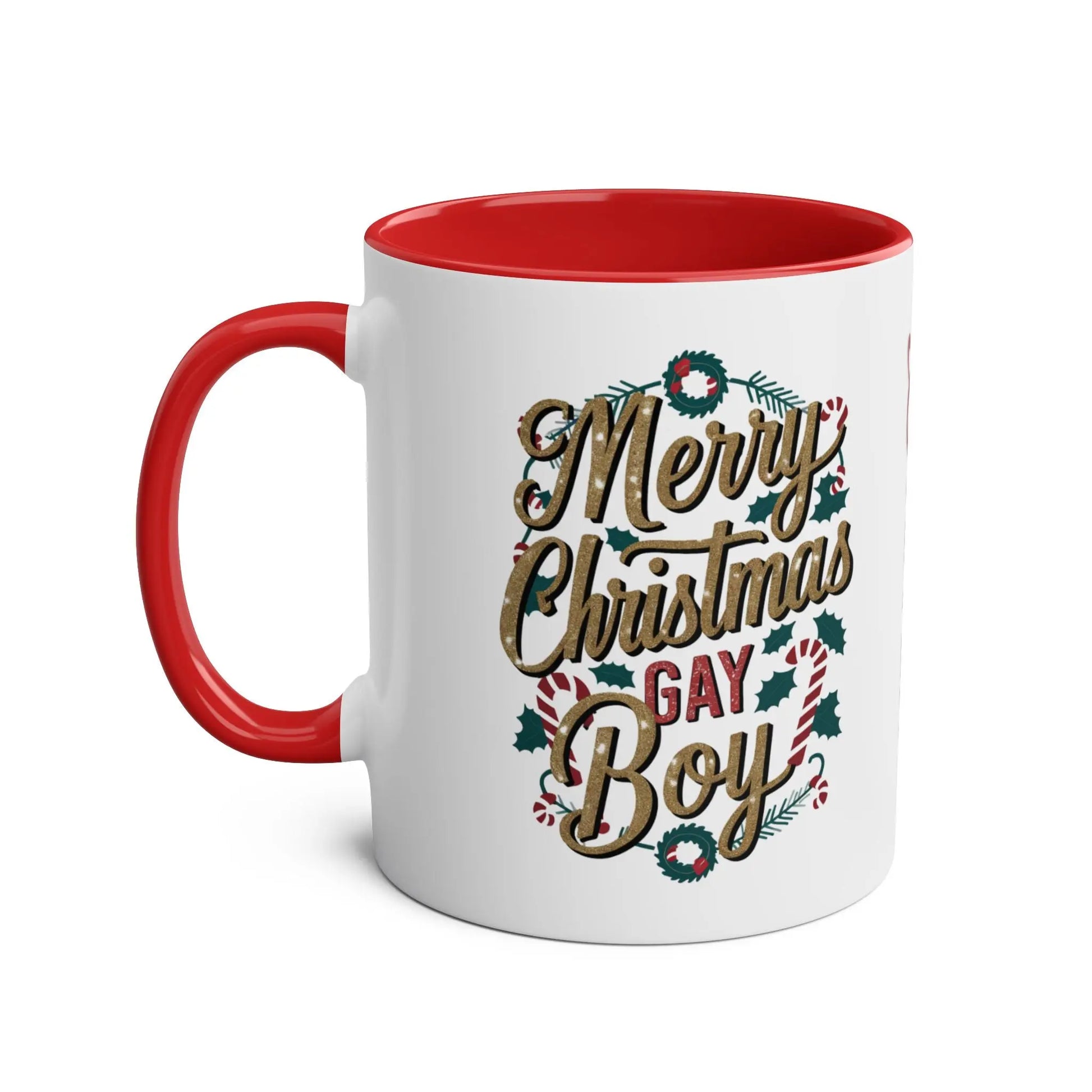 Gay Christmas Mug, Spread holiday cheer and show your support with our Personalised Merry Christmas Gay Boy Mug. This festive mug can be customised with a name, making it a thoughtful and unique gift for your loved ones. Perfect for enjoying a hot cup of cocoa this holiday season!