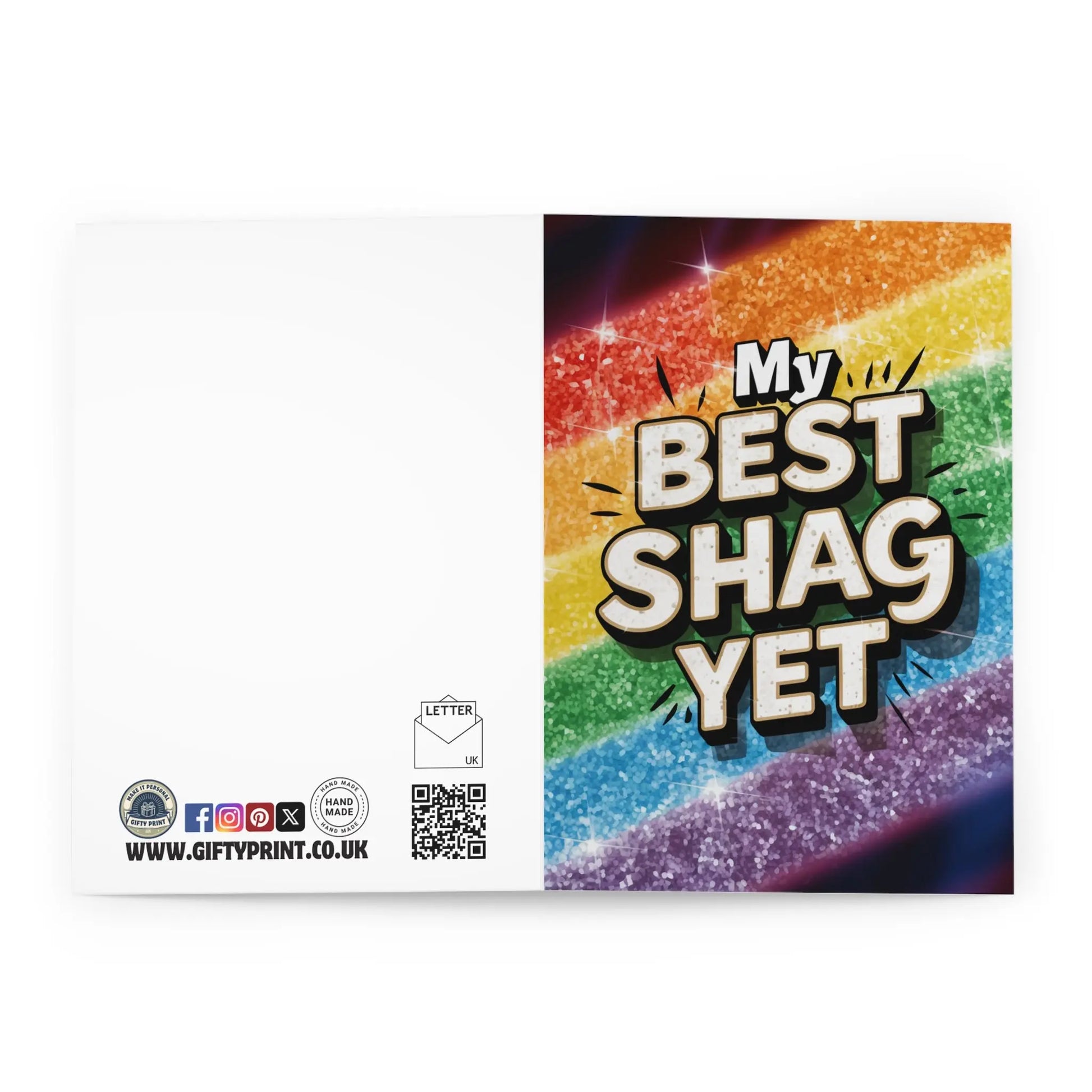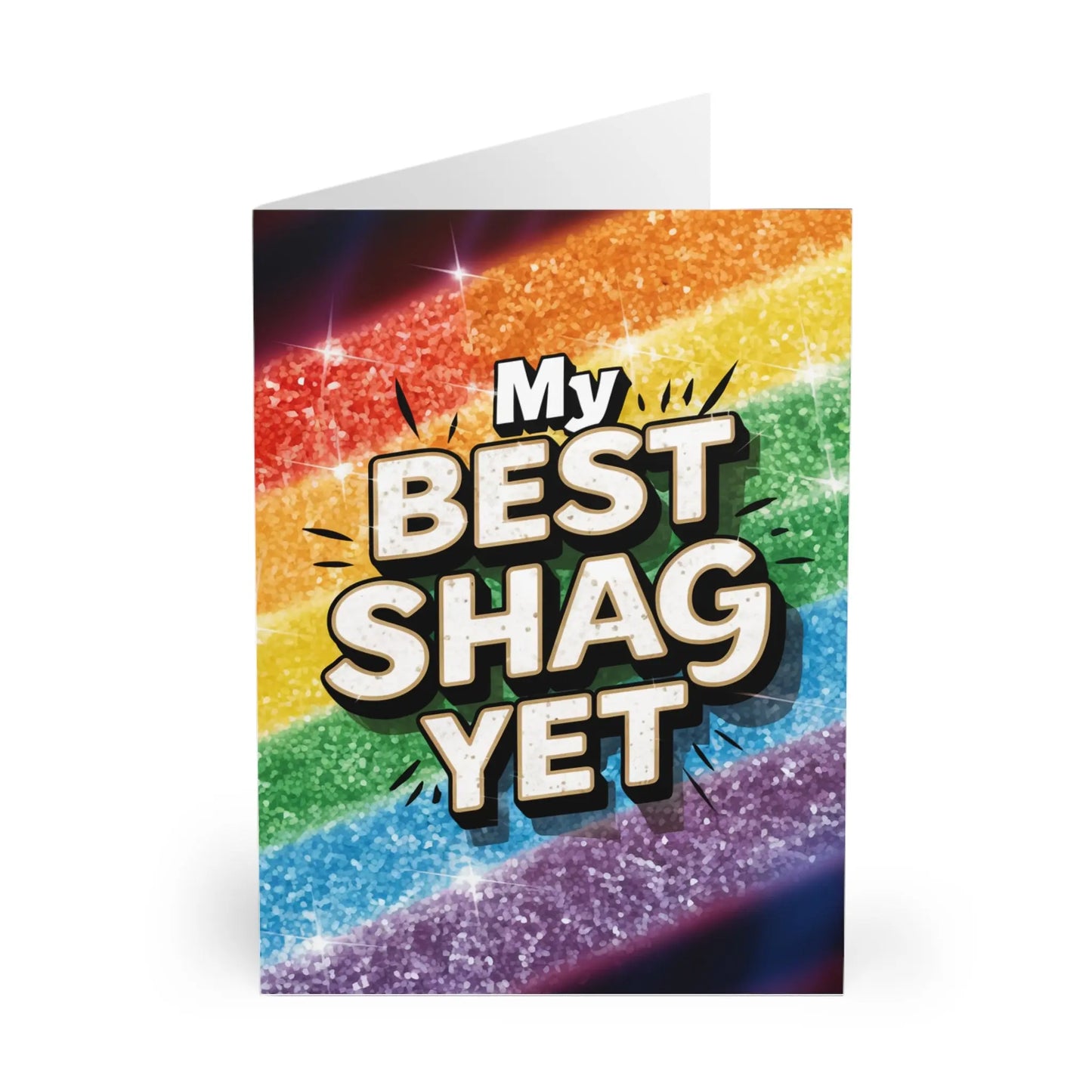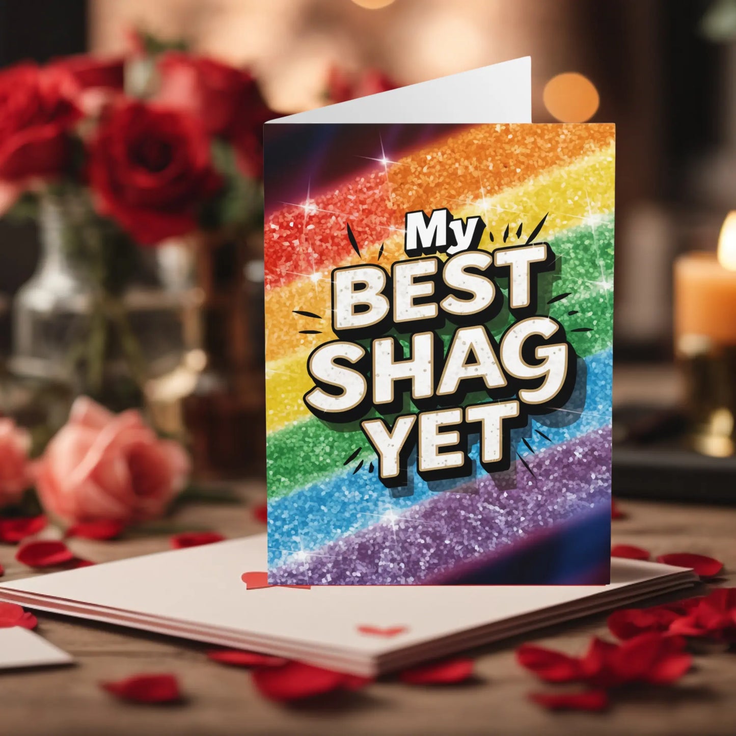 Gay Valentines Day Card, Celebrate your love with our Gay Valentines Day Card. Featuring a rainbow design and the playful phrase "My Best Shag Yet," this card is perfect for showing your special someone how much they mean to you.