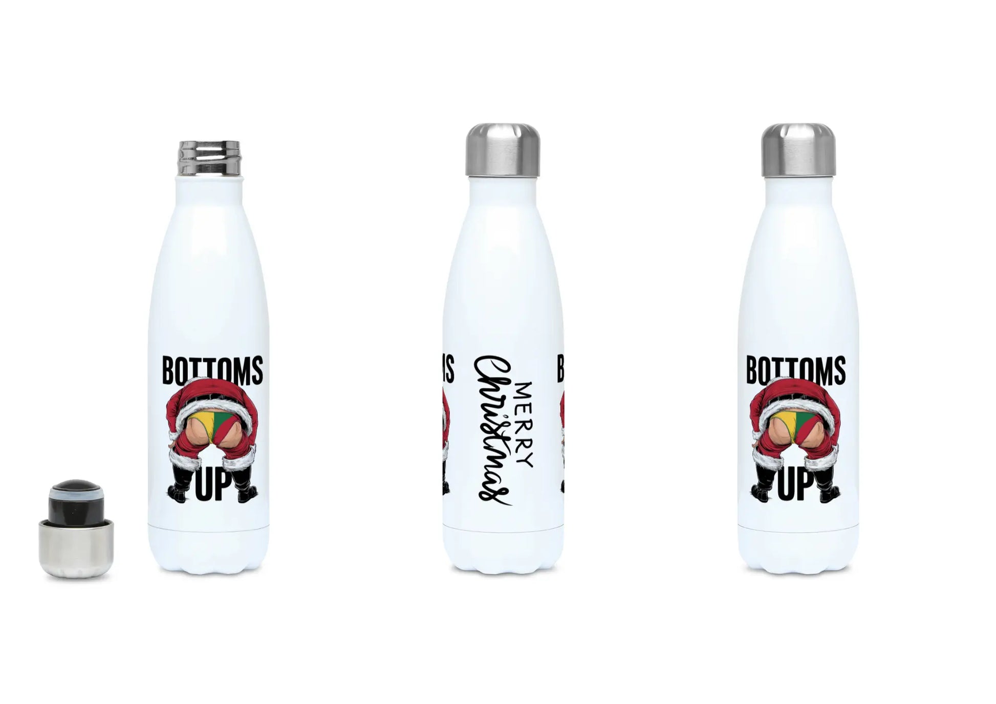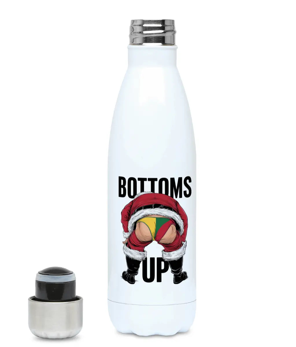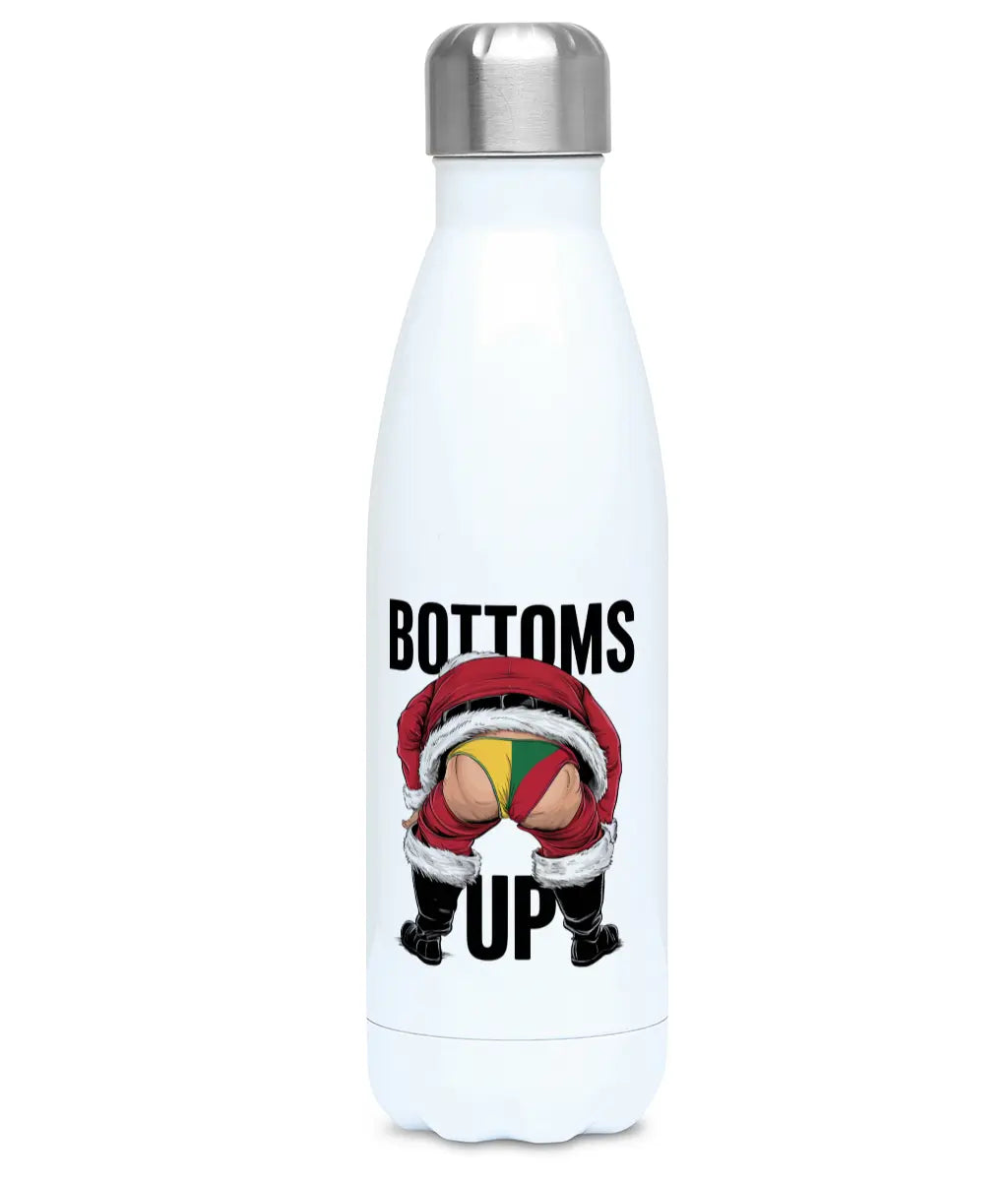 Gay Water Bottle, Spread holiday cheer with our Merry Christmas Bottoms Up water bottle featuring a playful and sassy Santa design. Perfect for staying hydrated during all your festive celebrations. Bottoms up, Santa!