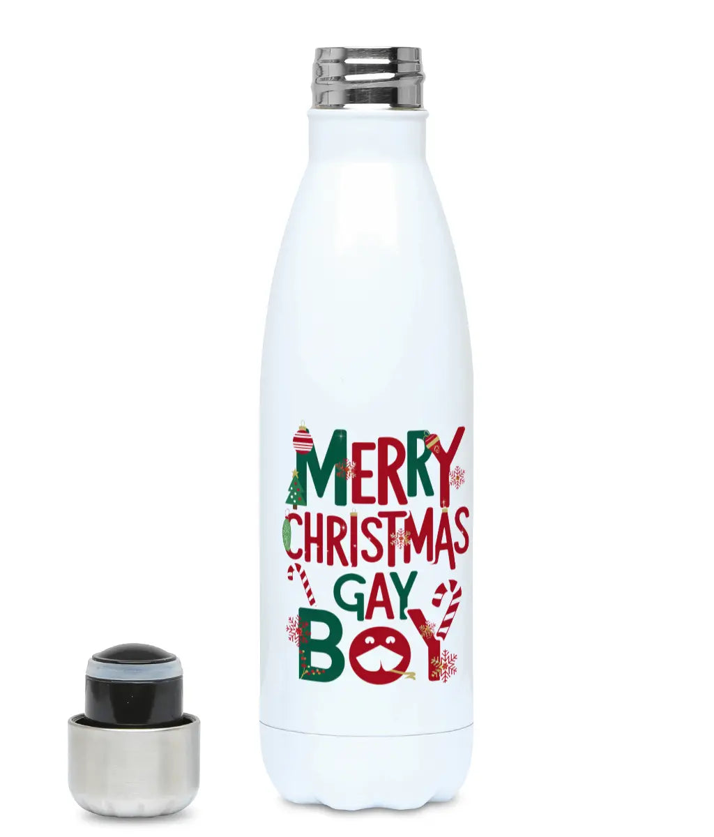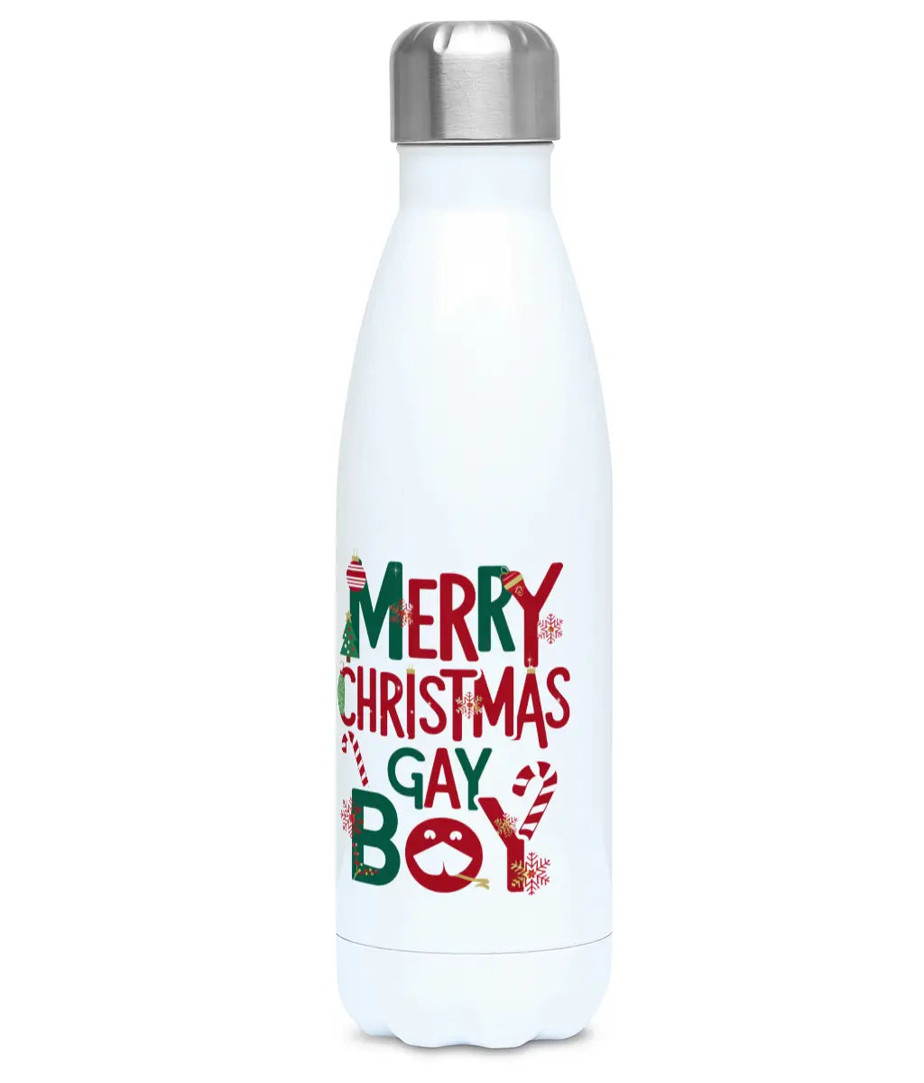 Gay Water Bottle, Add a personal touch to your holiday hydration with this Merry Christmas Gay Boy water bottle. Stay hydrated while spreading holiday cheer and celebrating love. A unique and fun gift for anyone on your list. (BPA-free, 500ml capacity, reusable)