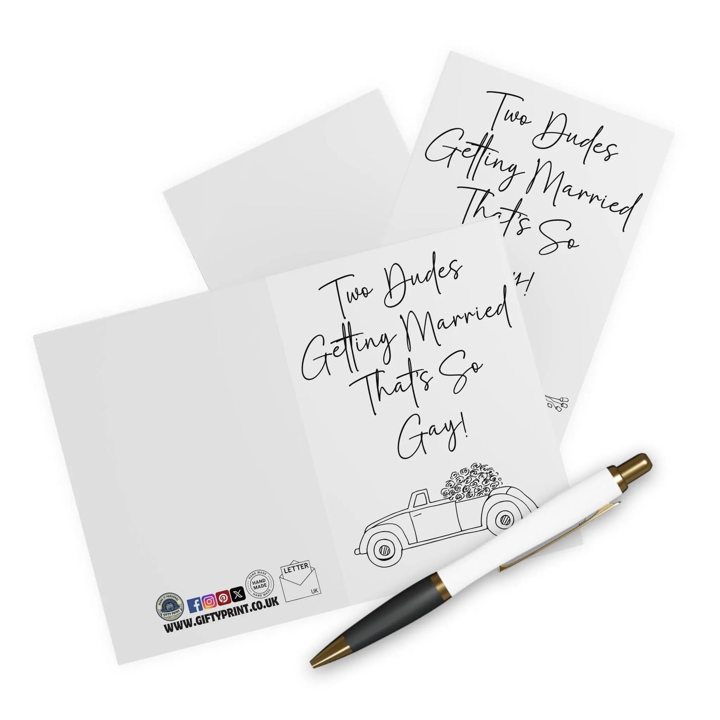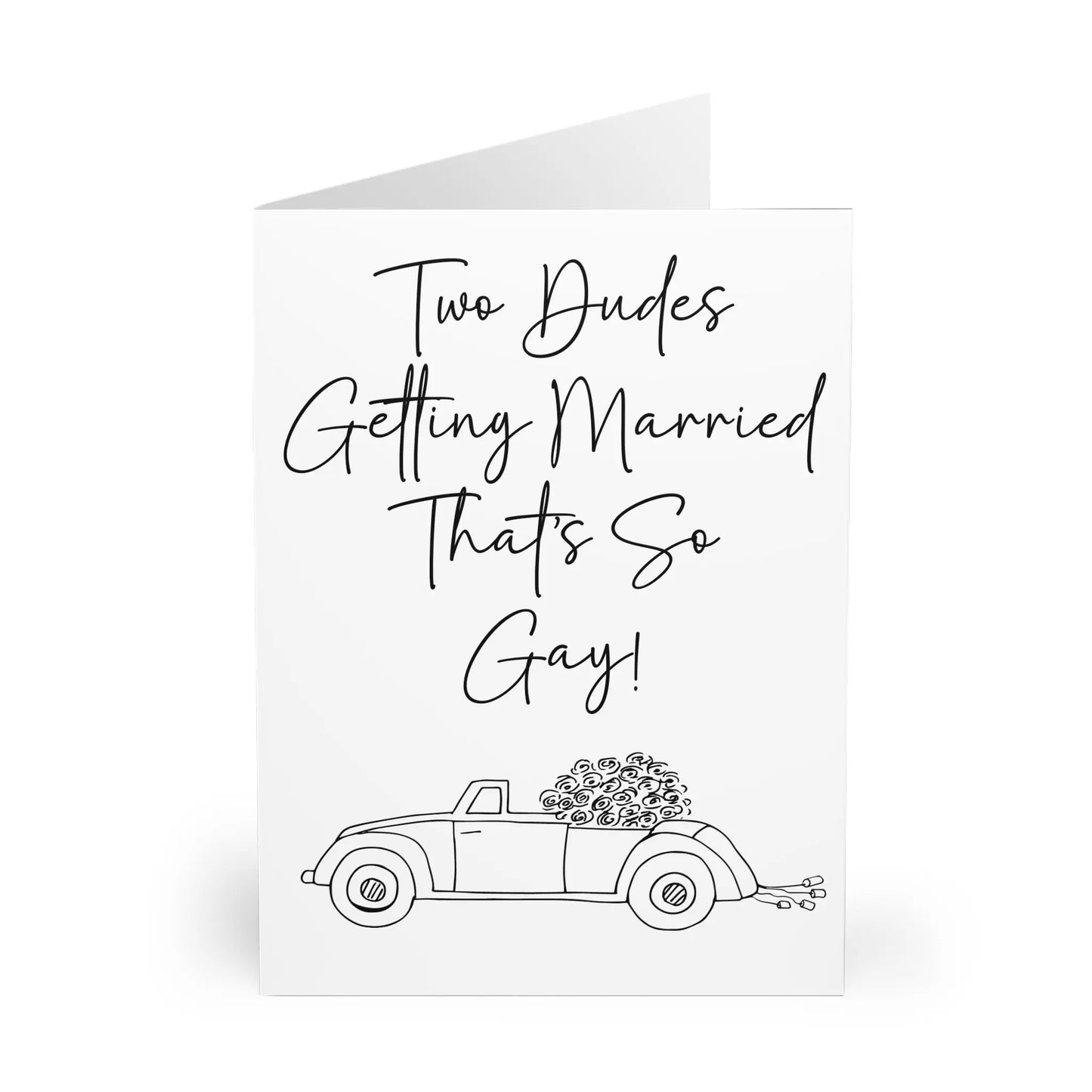 Gay Wedding Card, Celebrate love (and humour) with this Gay Wedding Card for 2 Dudes. Featuring 2 men getting married, this card is perfect for the LGBTQ+ couple in your life. Say "con-gra-tu-lations" in a unique way with this playful and quirky card. #lovewins #equalityforall