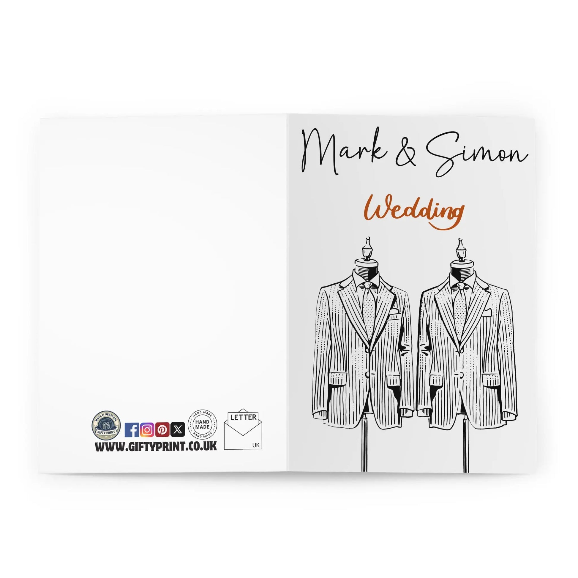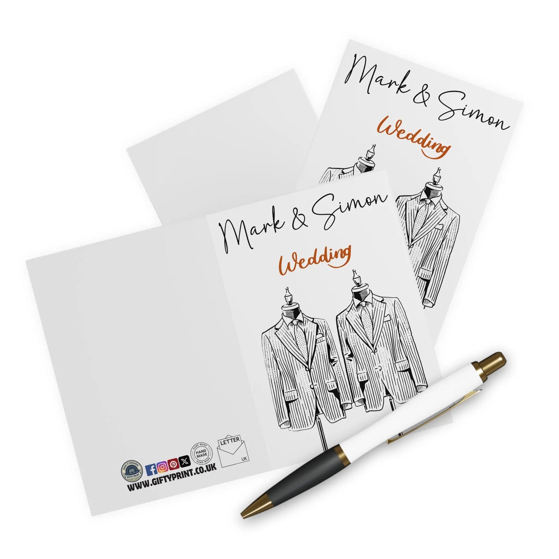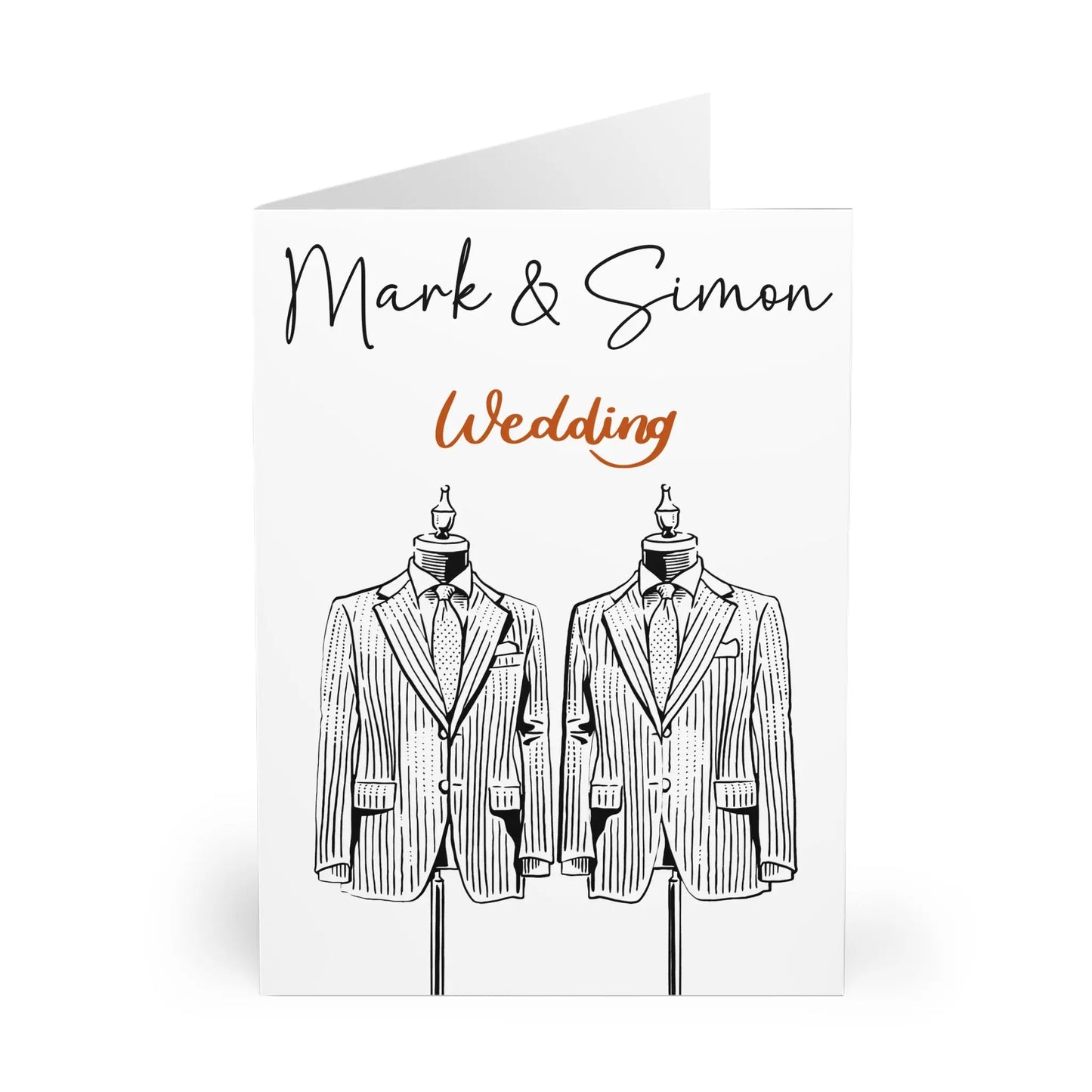 Gay Wedding Card, Celebrate love with this quirky personalised card featuring two groom suits! Show your support for the LGBTQ+ community and add a touch of humour to their special day. Perfect for the playful and fun-loving couple. (No one-size-fits-all here!)