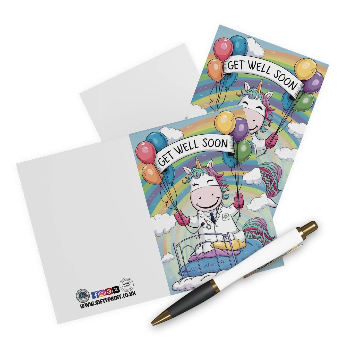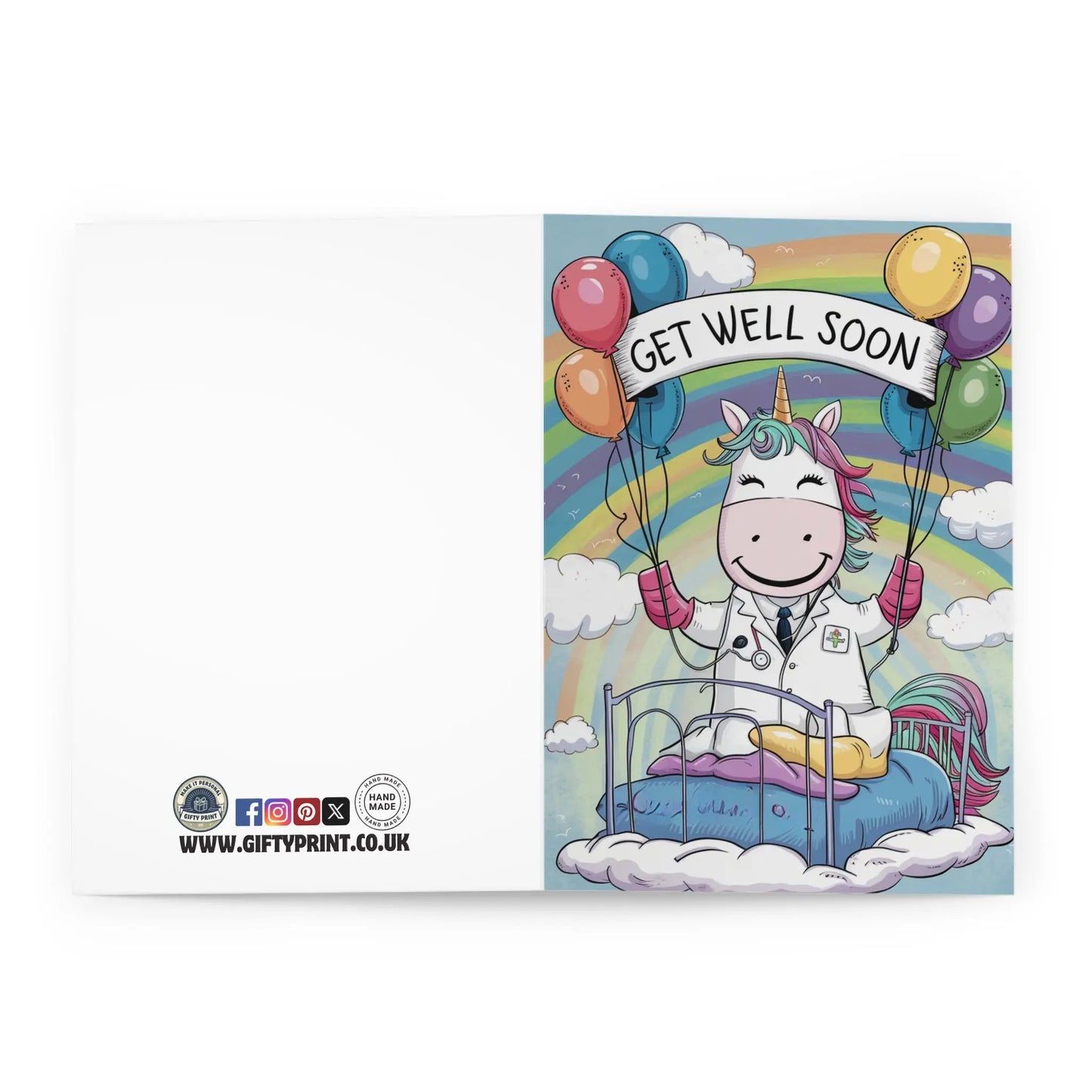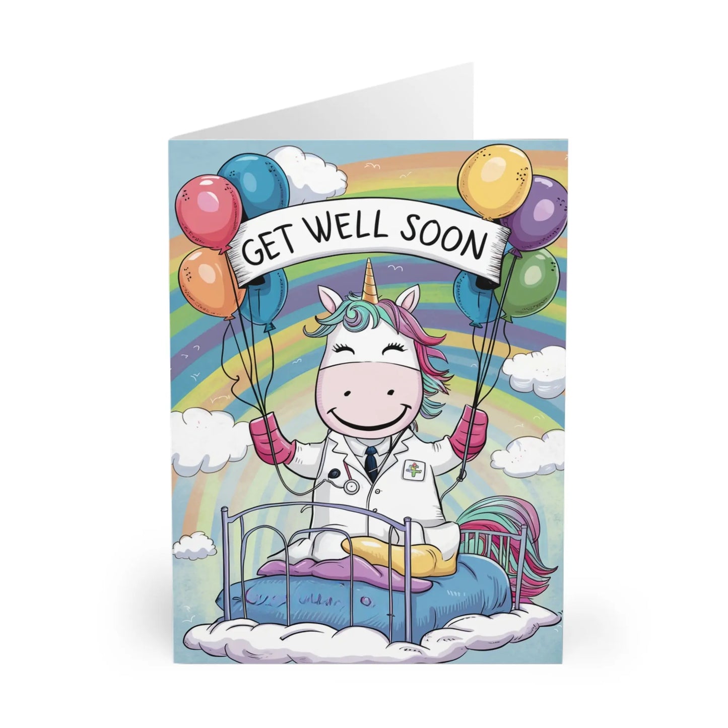 Get Well Soon Card, Send well wishes with this adorable Get Well Soon card featuring a cute unicorn doctor and colorful balloons. Show you care with a touch of whimsy and humour. (Unicorn puns not included.)