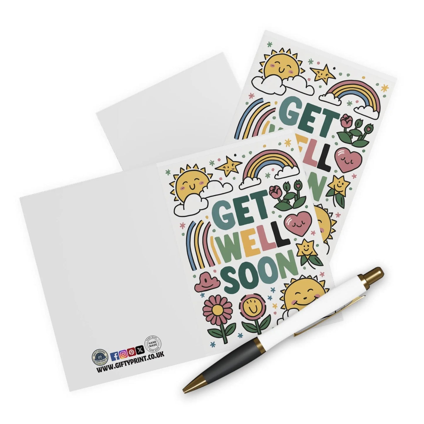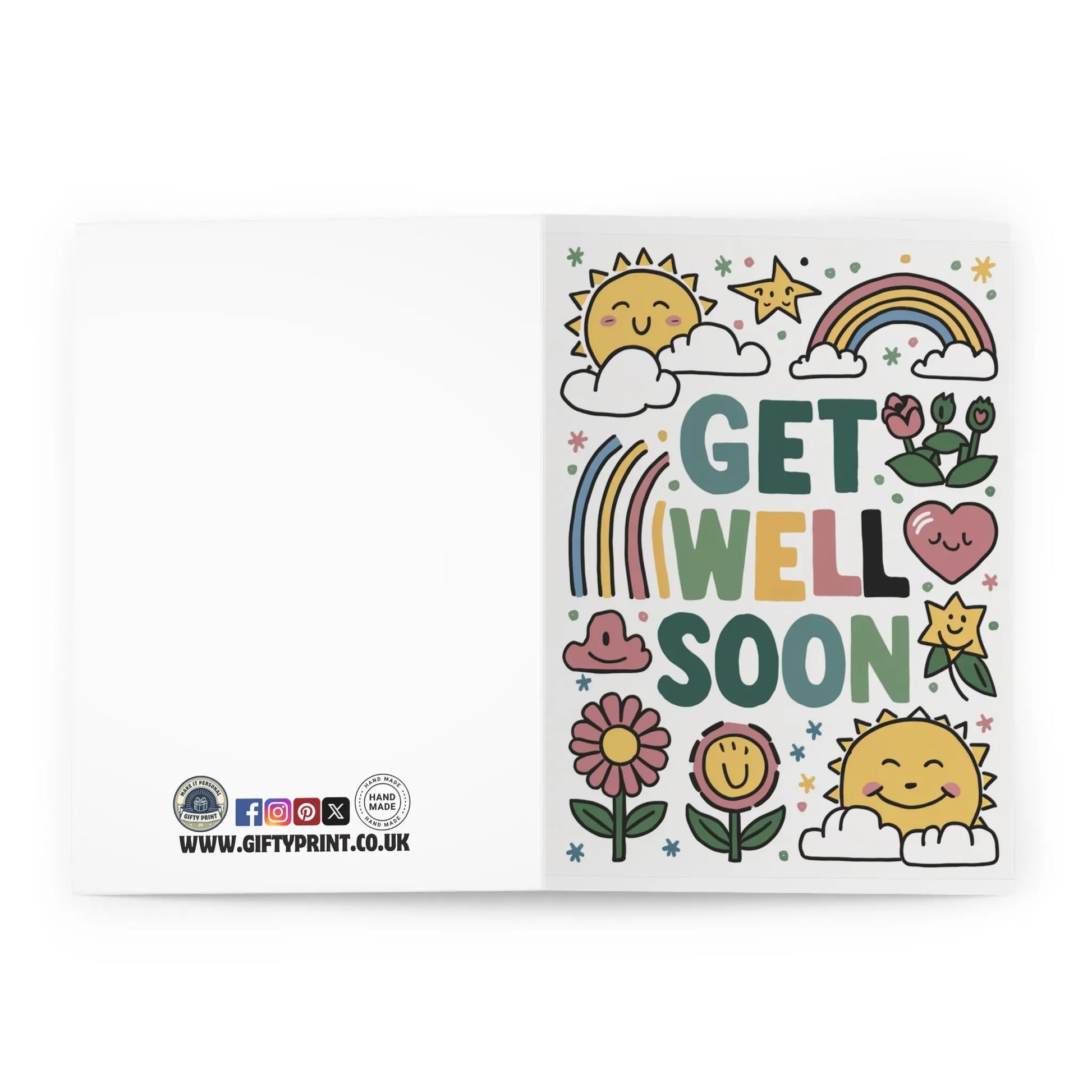 Get well Soon Card, Cheer up your sick friend with our Get Well Soon Card Sunshine Flowers & Rainbows. Brighten their day with a pop of sunshine, colourful flowers, and rainbows. Show them you care with our unique and playful card.