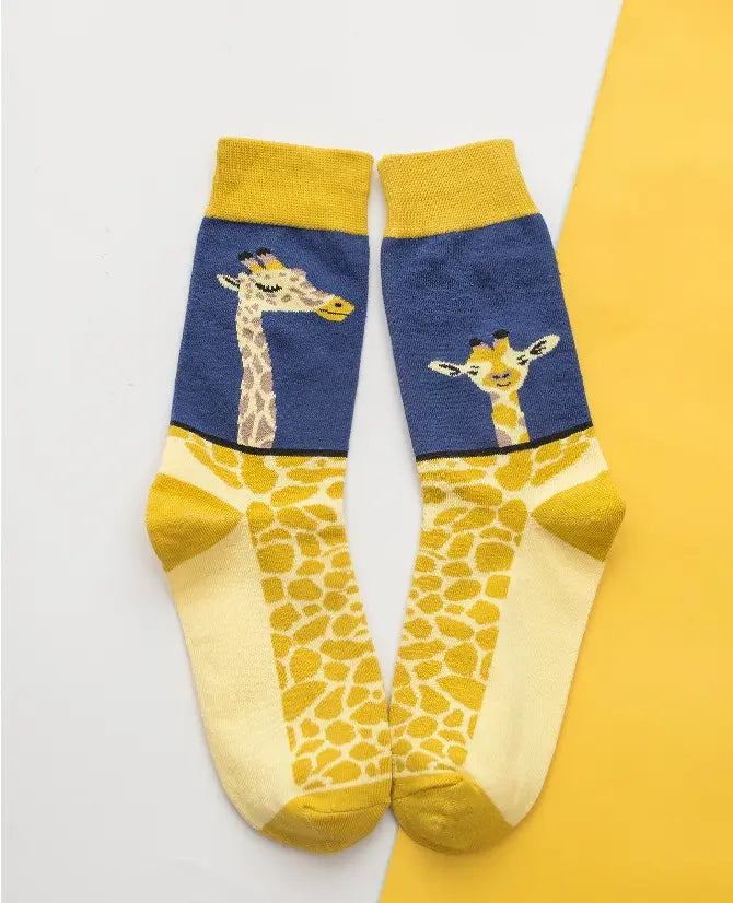 giraffe socks, Add some wild style to your wardrobe with our Giraffe Pattern Socks in blue and yellow! Featuring a unisex design, these socks are perfect for any adventure (or lazy day) you have planned. Step into the safari of fashion, one sock at a time. (Two exclamation points, just because.)