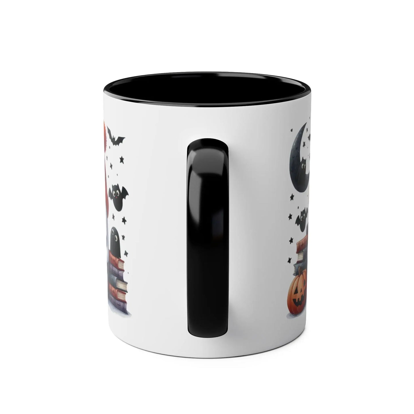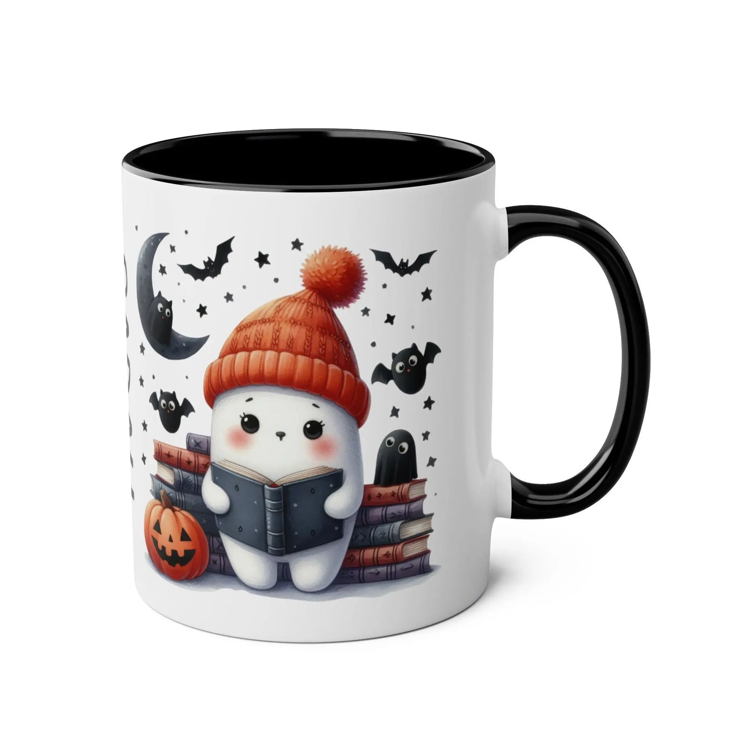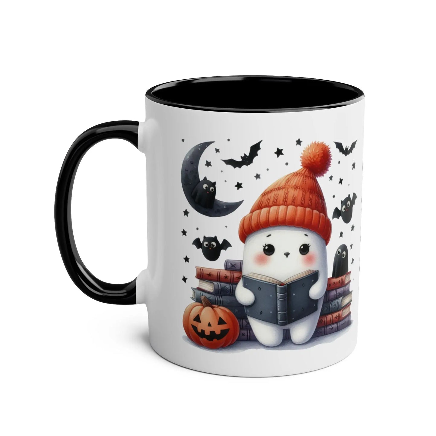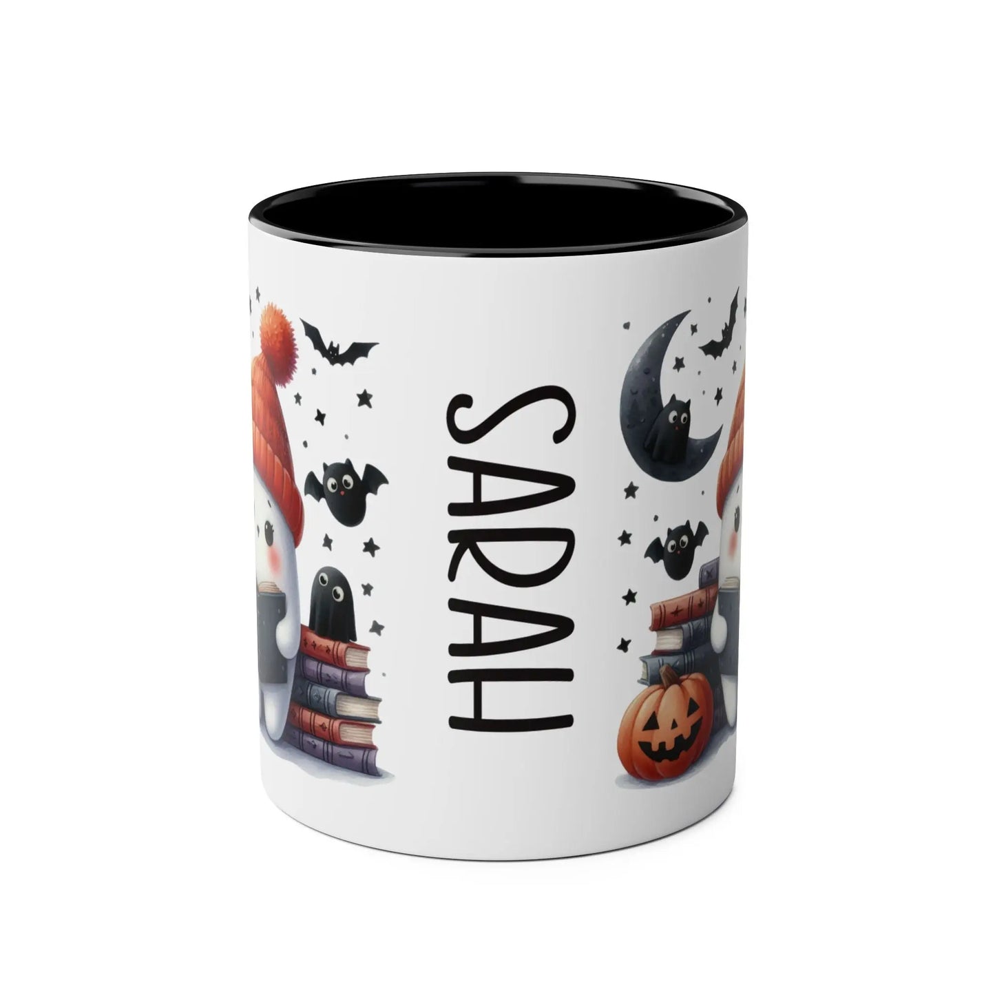 Halloween Mug, Get ready to haunt your coffee break with our Personalised Halloween Mug featuring a spooky ghost who loves nothing more than reading books (or souls). Sip in style and scare up some laughs with this uniquely designed mug that can be personalised just for you. Boo!
