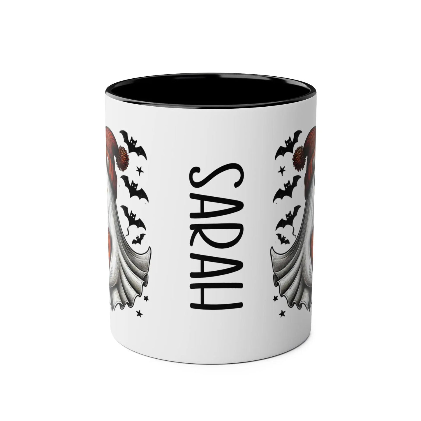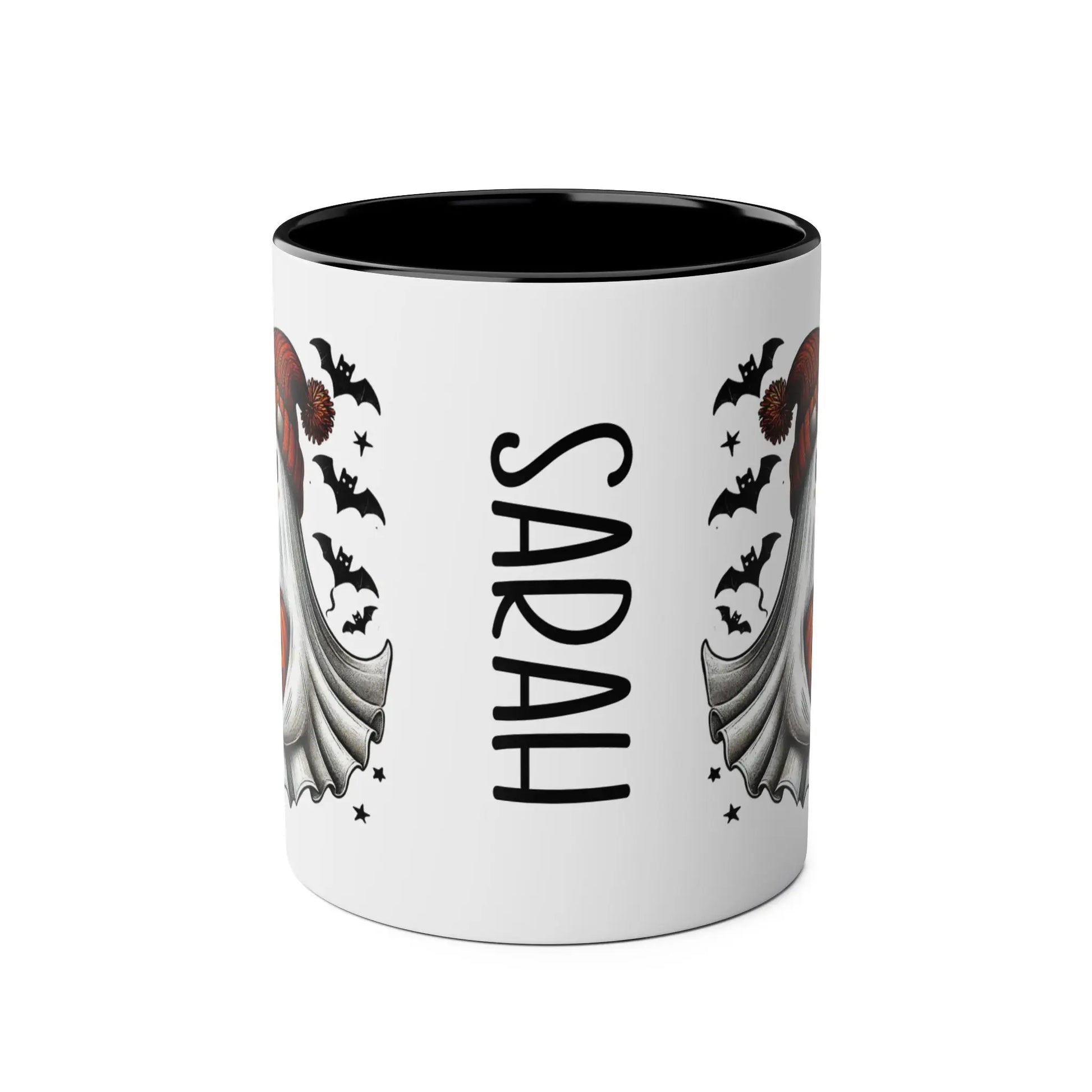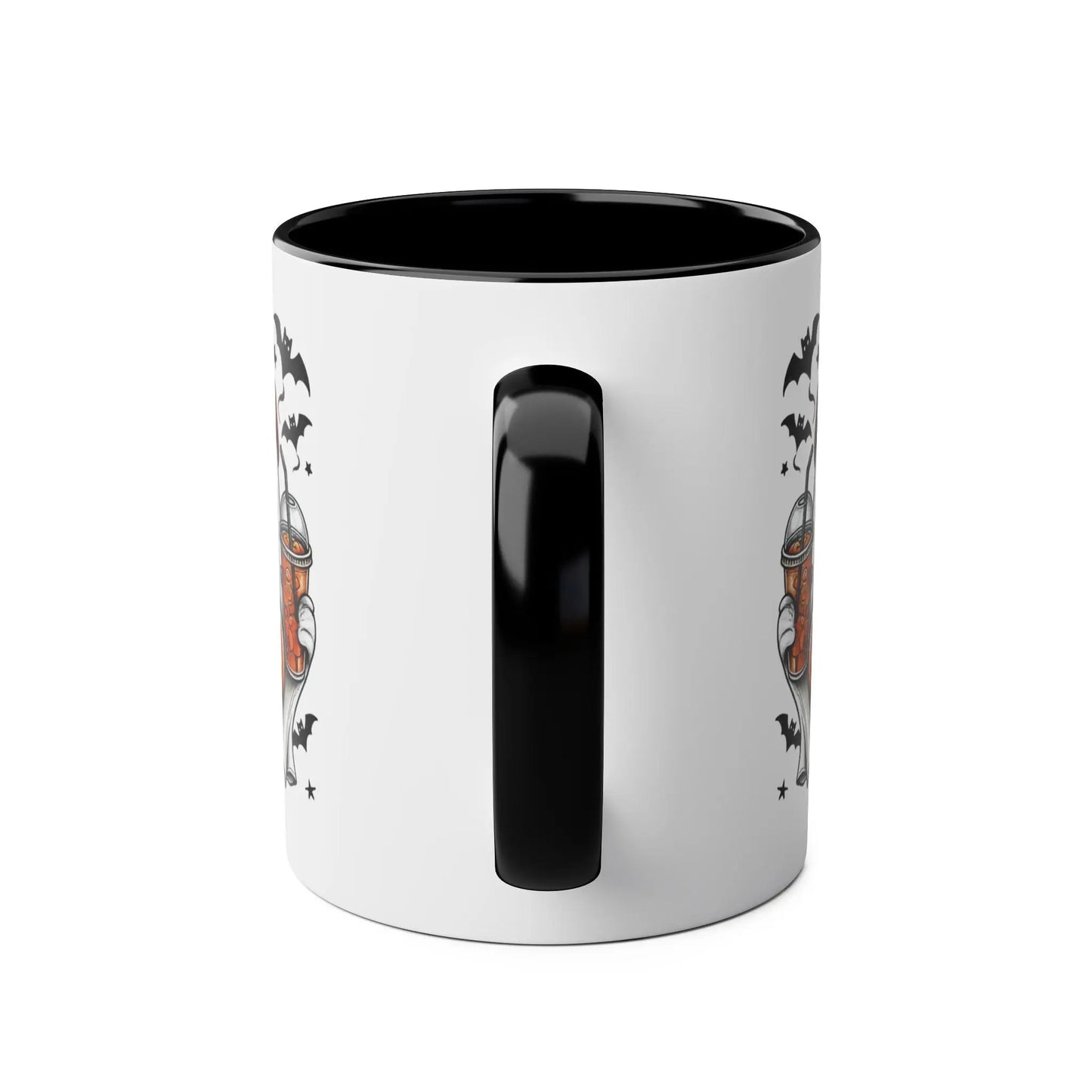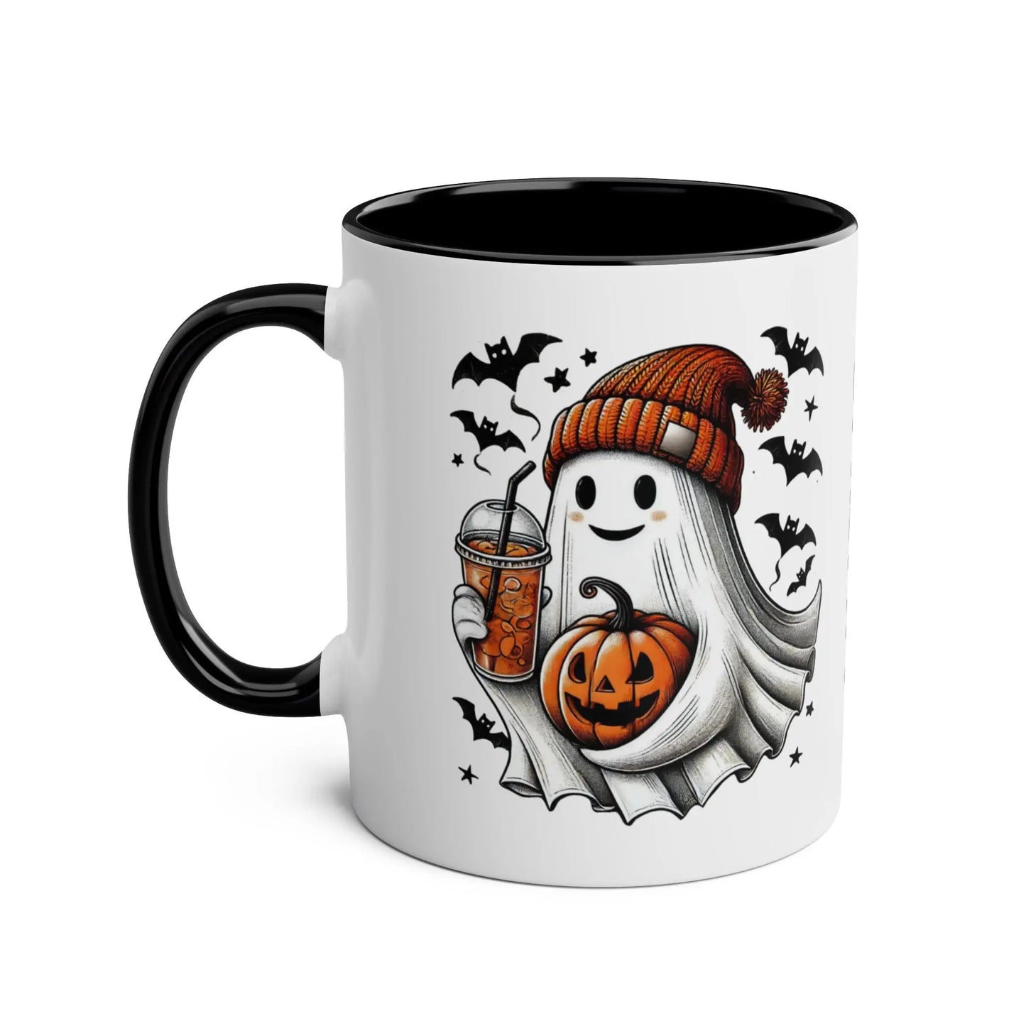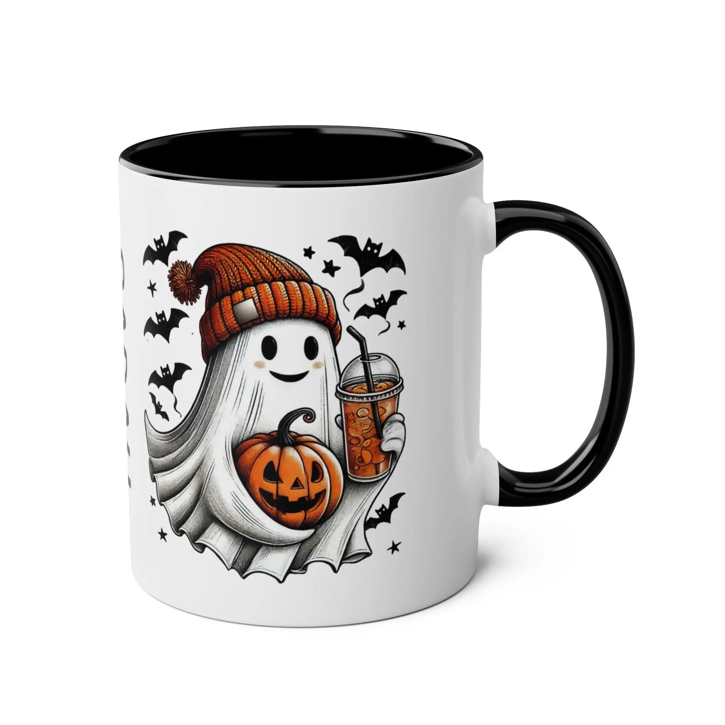 Halloween Mug, Boo-tify your morning brew with our spooktacular Personalised Ghost & Pumpkin Mug! Featuring a hauntingly cute ghost and pumpkin design on a sleek two-tone black mug, this mug is perfect for any Halloween lover. Customise with your name for a unique touch. (No tricks, just treats!)