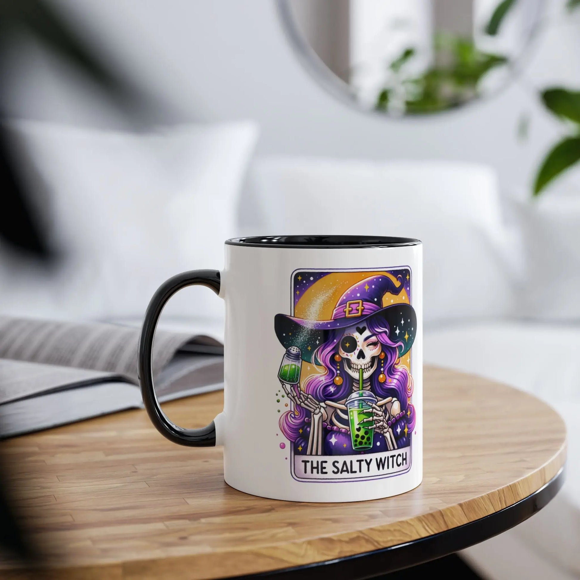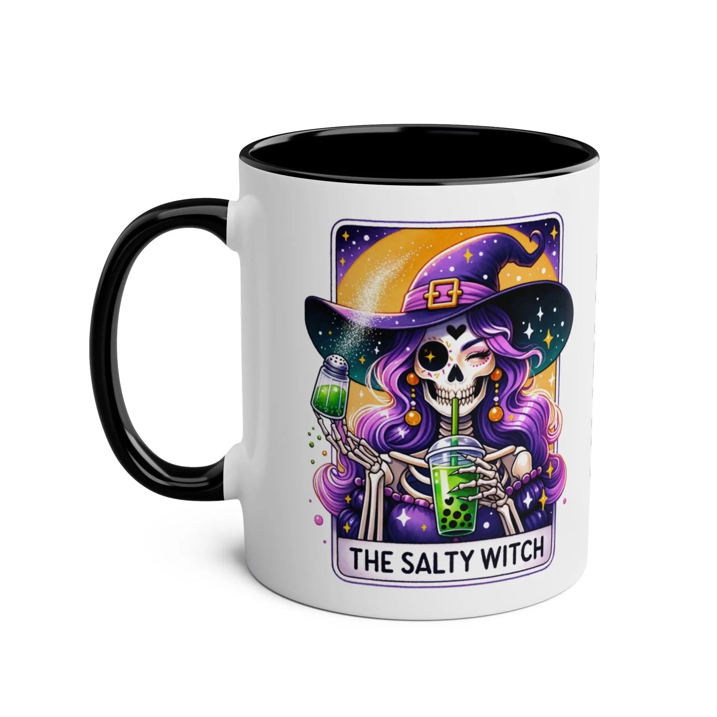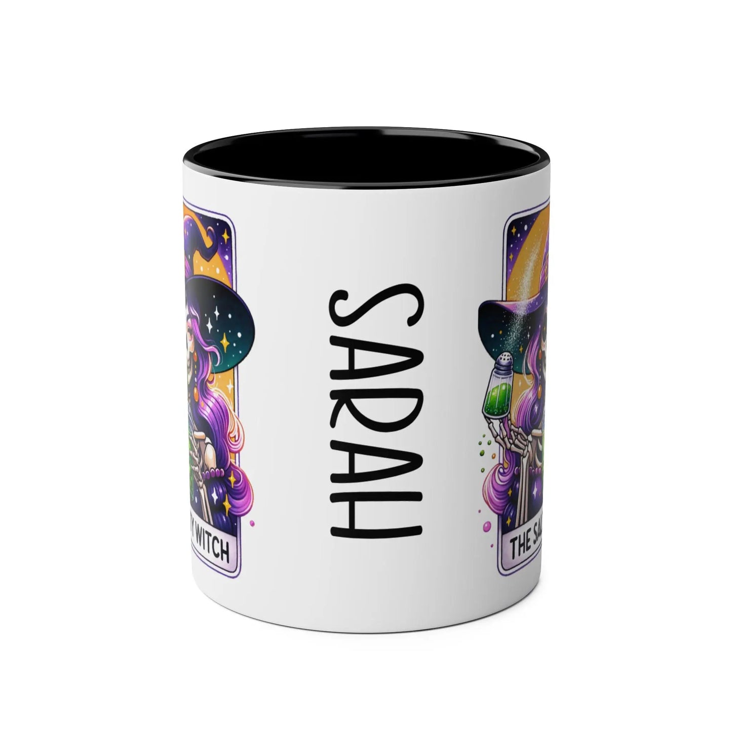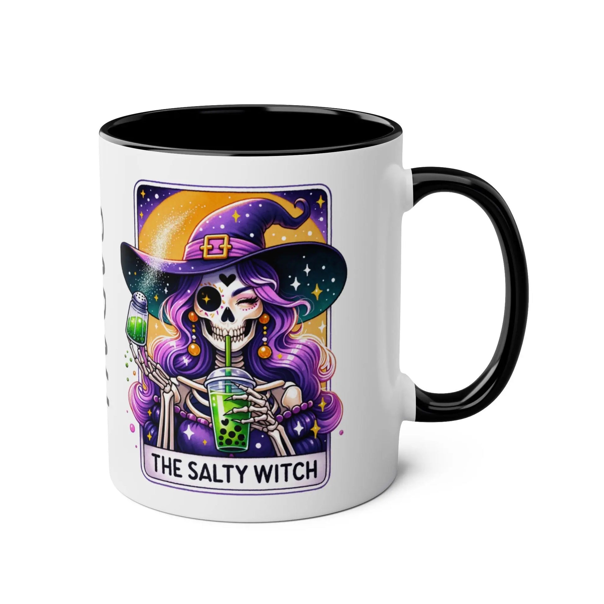 Halloween Mug, Get ready to brew your potions in style with our Personalised Salty Witch Halloween Mug! This unique mug features a quirky design and can be personalised with your name. Perfect for adding a touch of magic to your morning coffee or tea. (Witch's broom not included.)