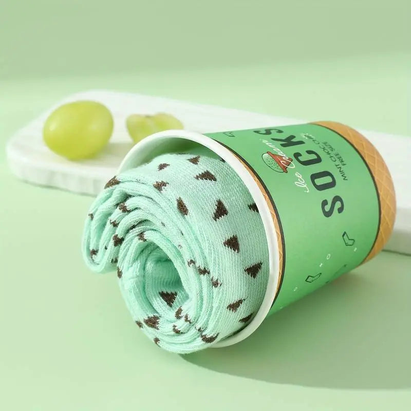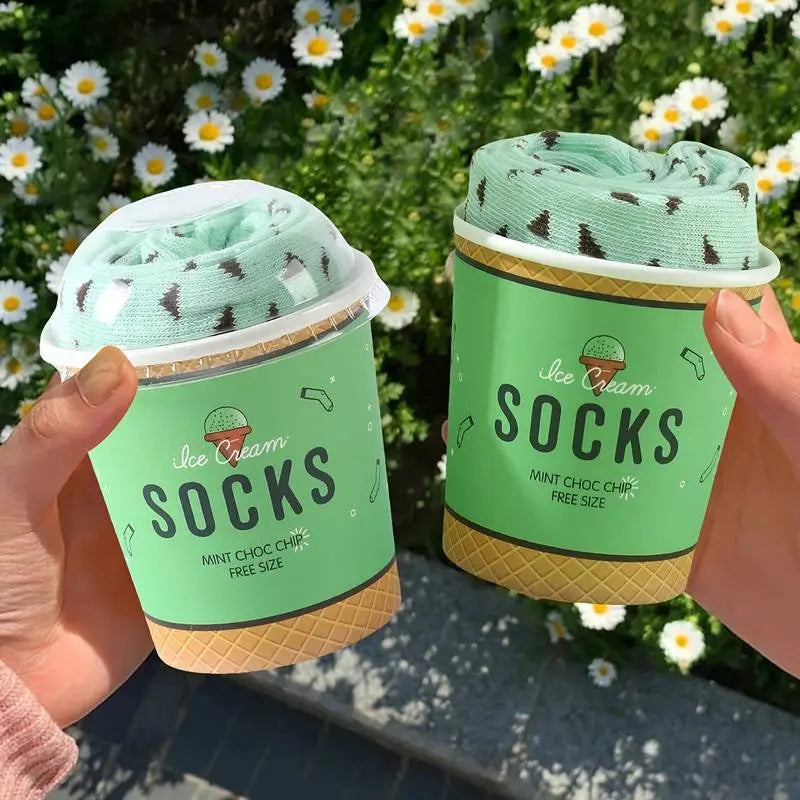 Ice Cream Socks, Take a bite out of fashion with these "cool" Ice Cream Socks! Packaged in a cute cup gift box, they're a fun and unique way to add some flavour to your wardrobe. Made with soft mint green fabric, these socks are a treat for your feet.