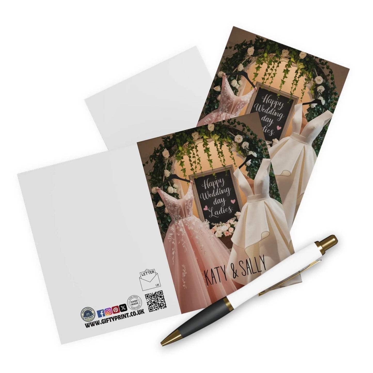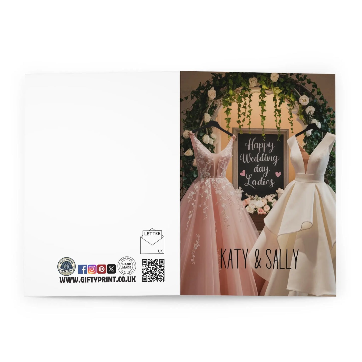 Lesbian Wedding Card, Celebrate love in all its forms with our Personalised Gay Lesbian Wedding Card! Featuring a Dresses and the phrase "Happy Wedding Day Ladies", this card can be customised with the names of the newlyweds for a personal touch. Show your support and spread joy to the special couple on their big day!