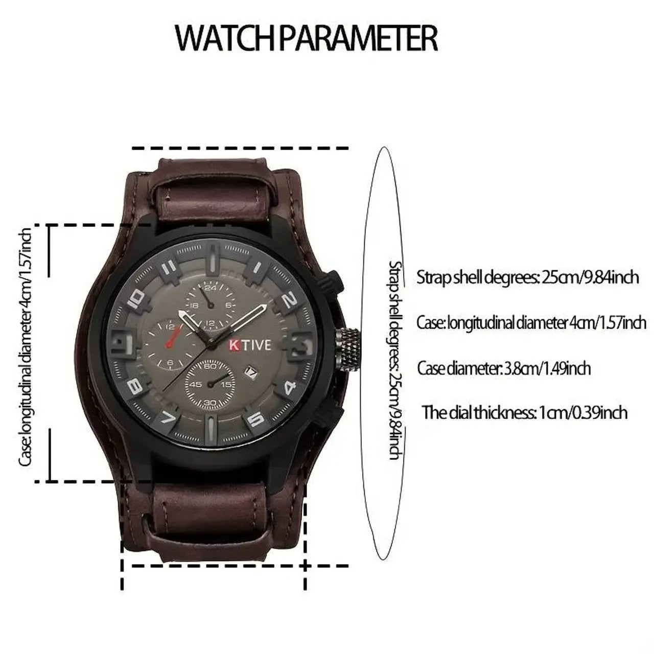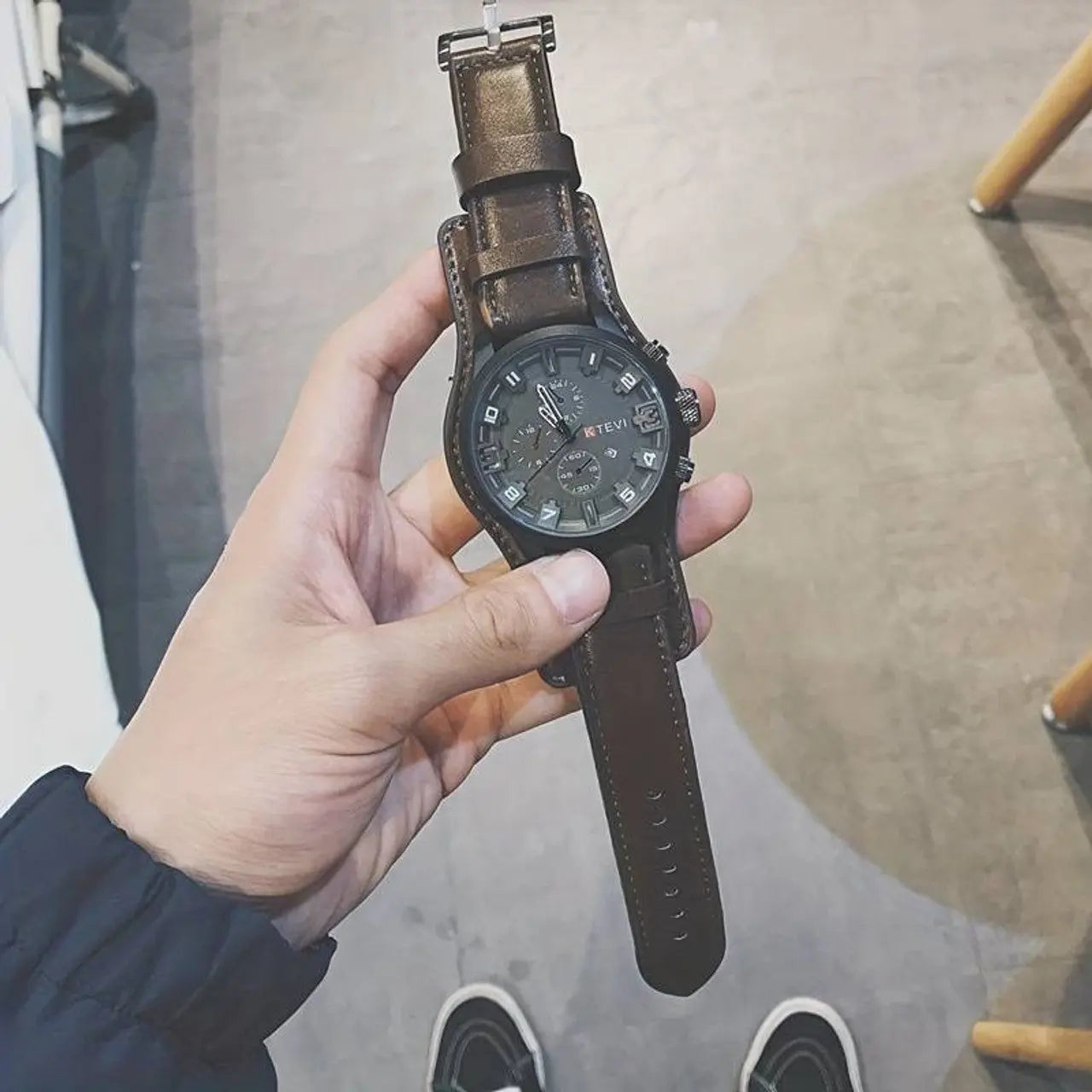 Men's Watch, This versatile men's watch features a classic brown strap and military-style black dial face. Perfect for everyday wear, its durable design is crafted to withstand any adventure. With its sleek look and reliable timekeeping, this watch is the ultimate accessory for any modern man.