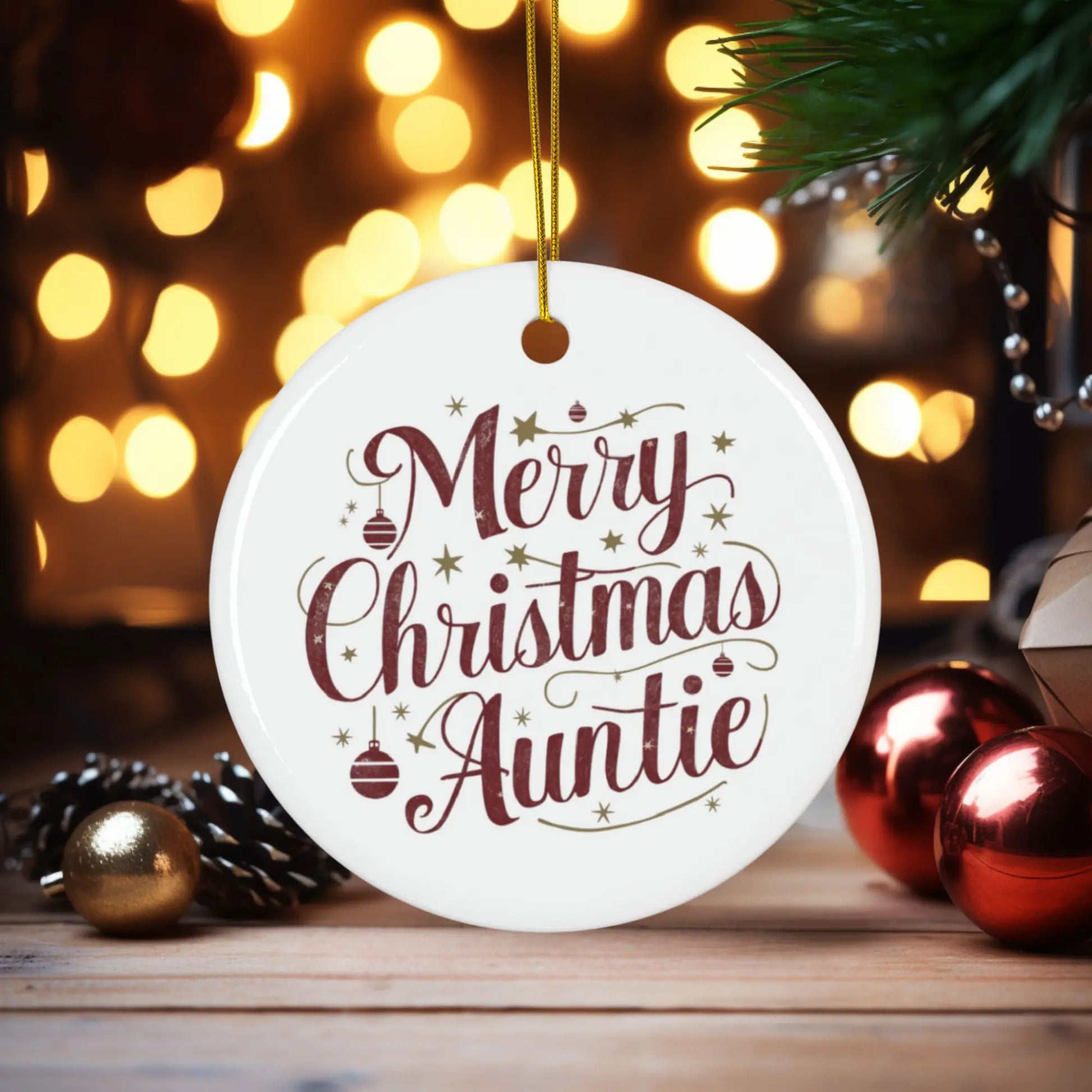 Christmas Tree Bauble, Celebrate your auntie this holiday season with this festive Christmas tree bauble. The bauble reads "Merry Christmas Auntie" and is sure to bring a smile to her face. Give her a unique and thoughtful gift with this one-of-a-kind ornament. 'Tis the season to spread joy and cheer!