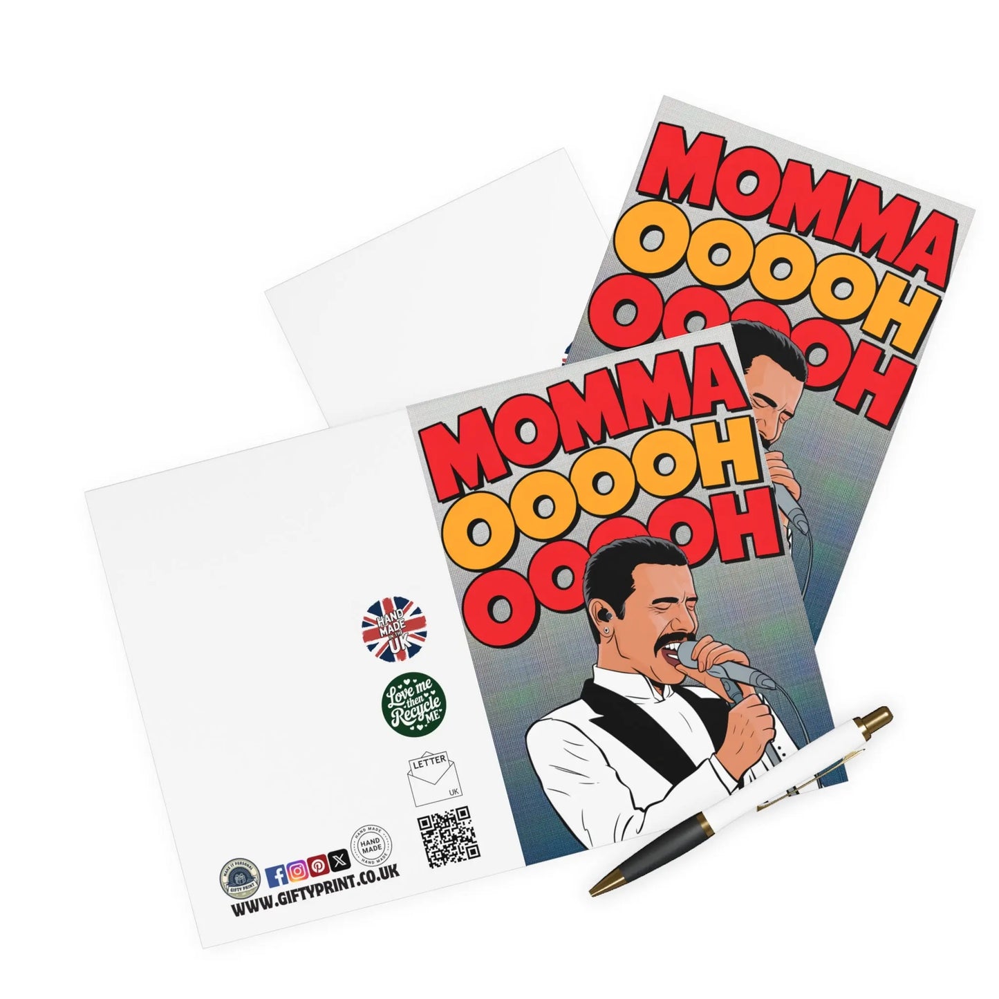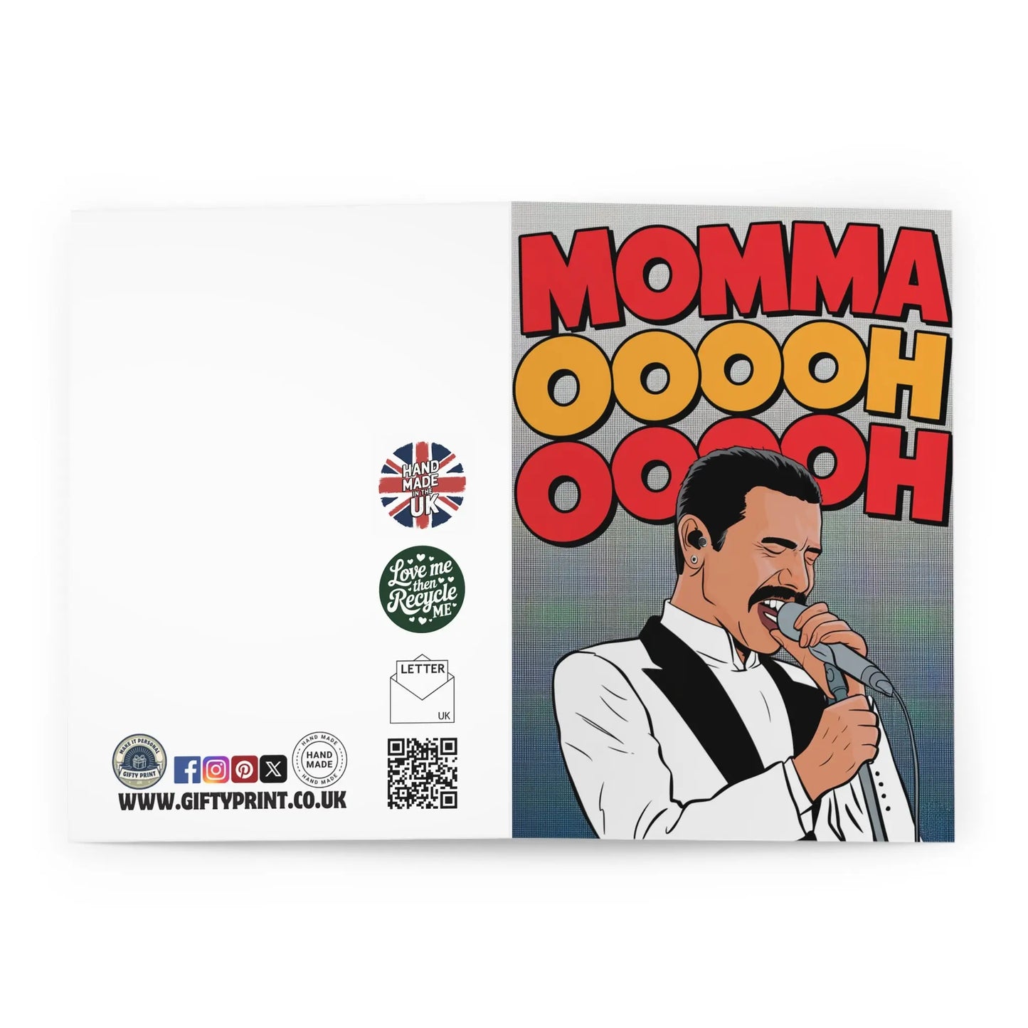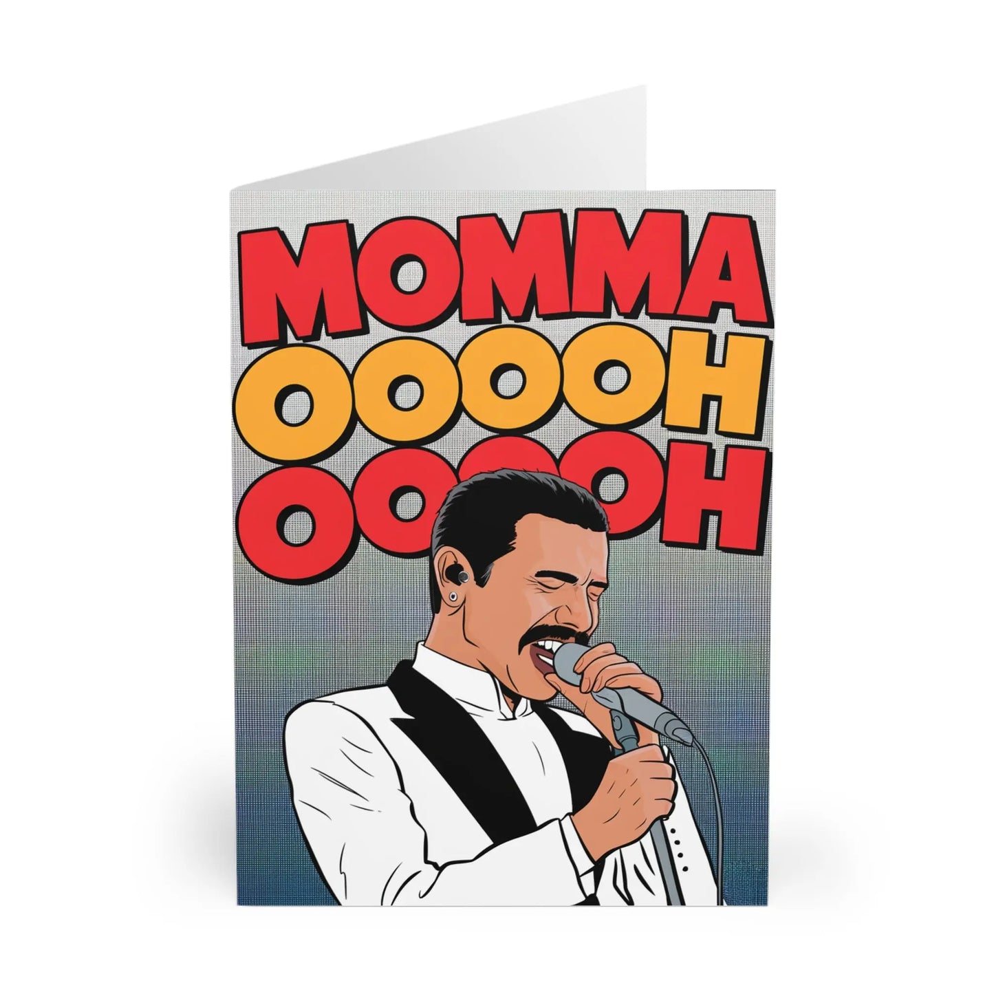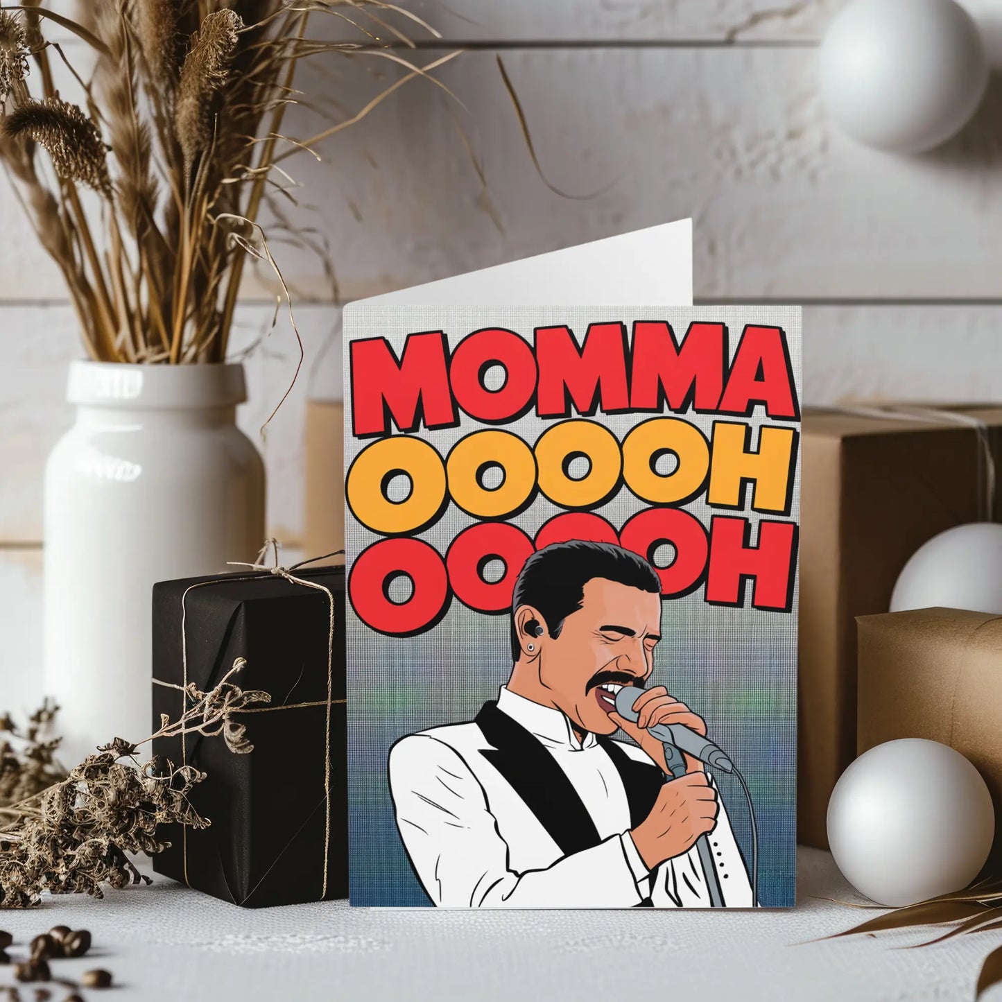 Mothers Day Card, Celebrate your mum the "Queen" she is with this Mother's Day card featuring the one-and-only Freddy Mercury. With the iconic phrase "Mommmma Ooooh" the perfect expression appreciation for your rockstar mom. Long live the Queen!