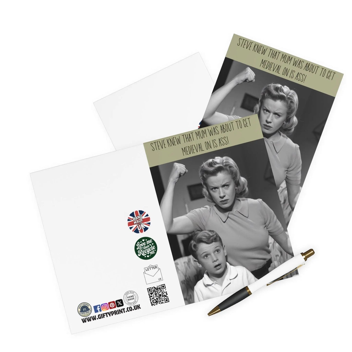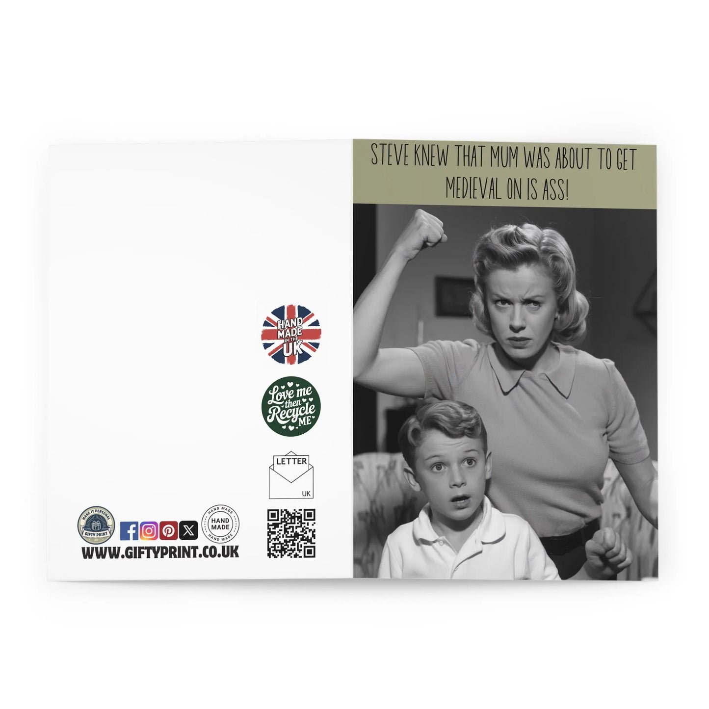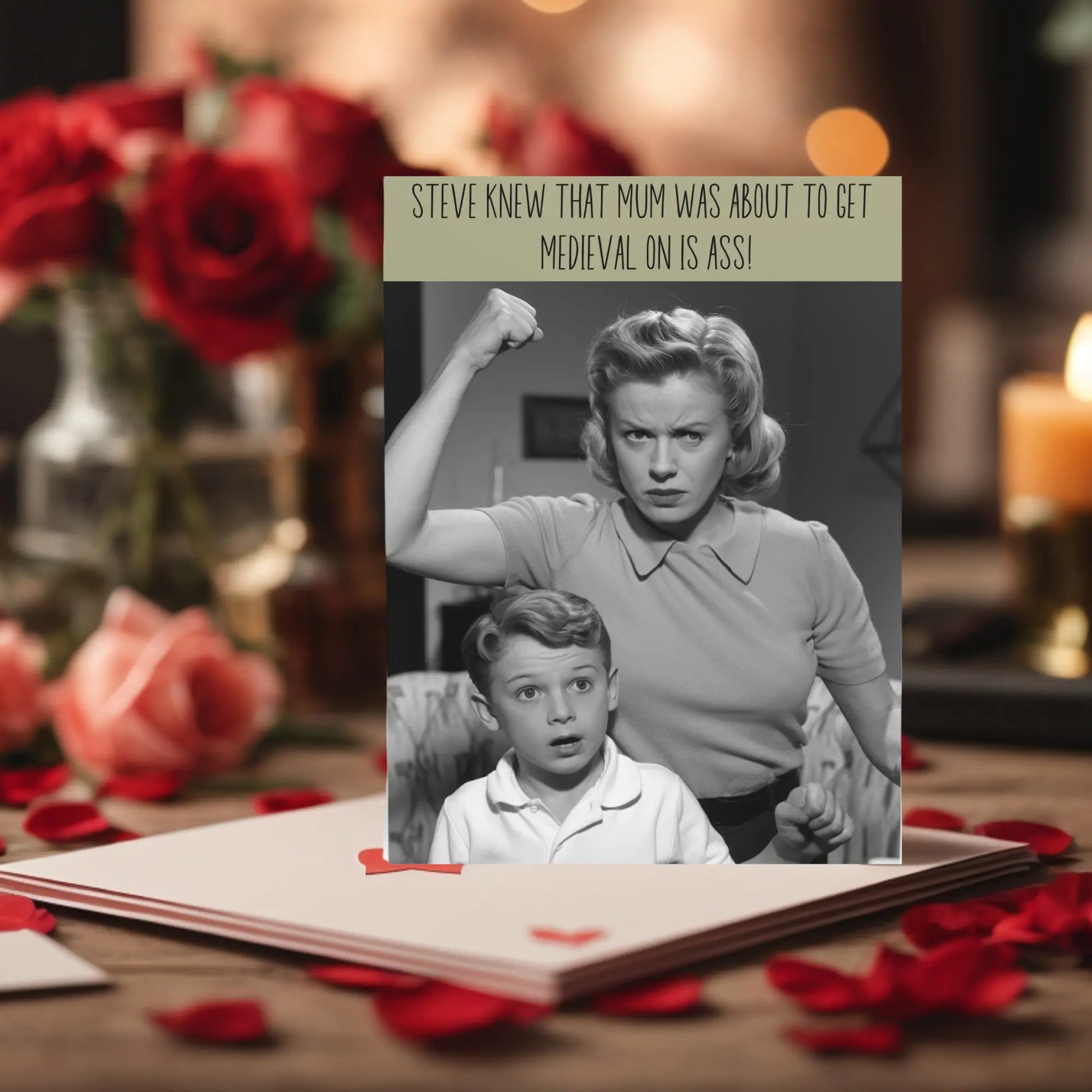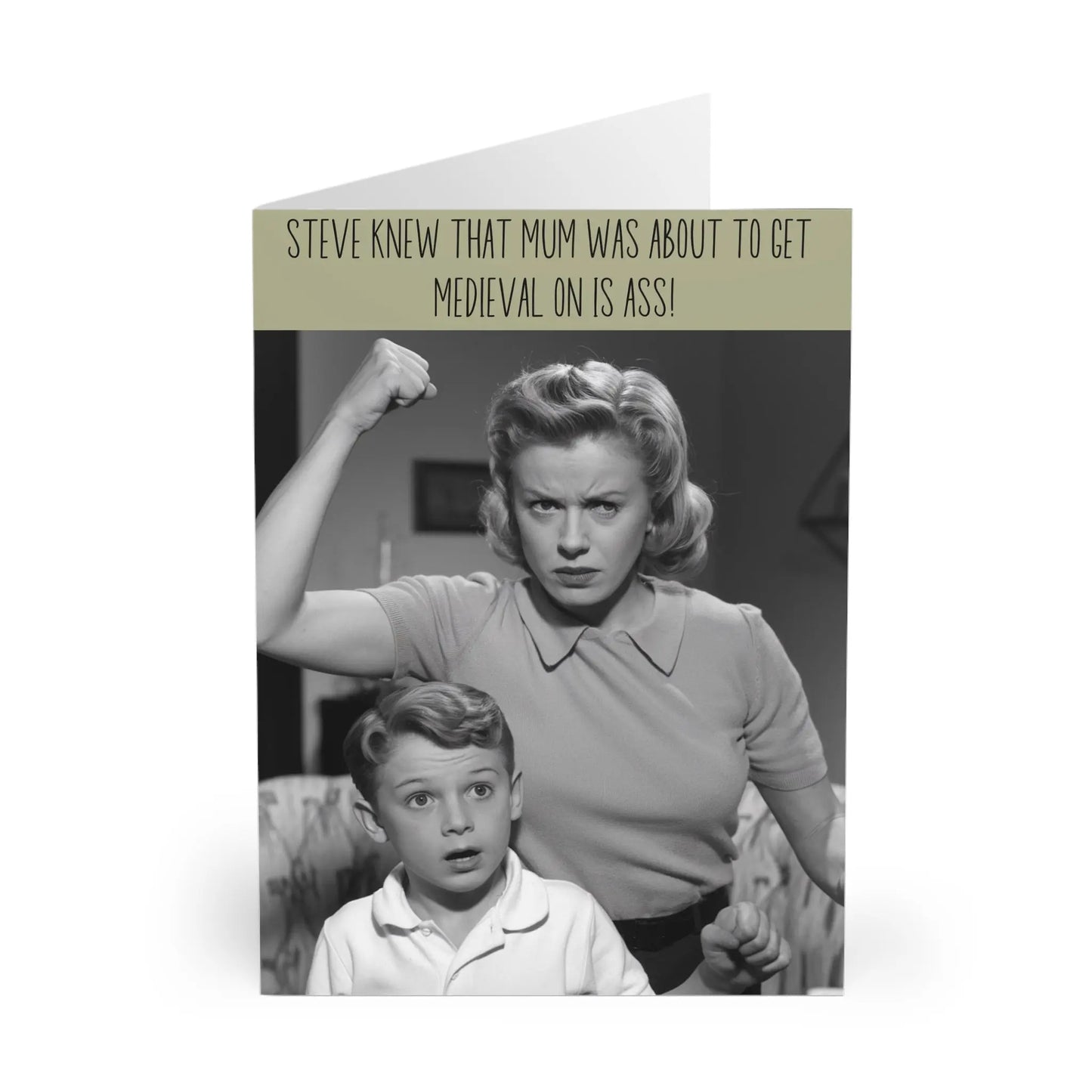 Mothers Day Card, Wow your mum with this playful Mother's Day card! Featuring a quirky saying about getting medieval on someone, this card is sure to make her laugh. Show her your appreciation with a little humour (and maybe some medieval weapons).
