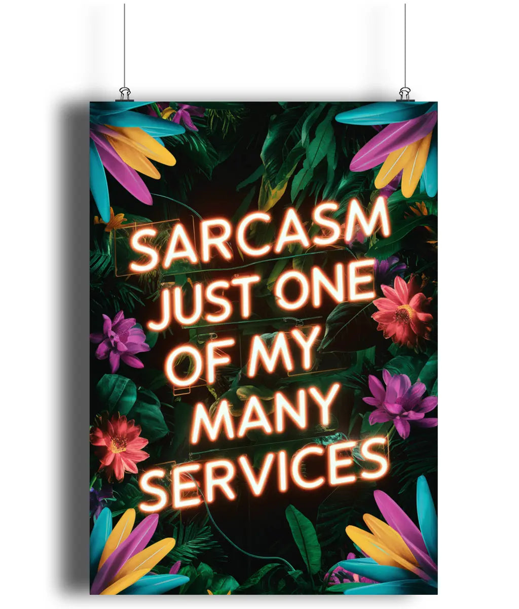 Neon Sign Print, Inject some sass and humour into your home decor with this Wall Art Print Sign. The perfect reminder that sarcasm is just one of the many services you offer. Spruce up your space with this quirky, playful piece that will keep you and your guests laughing.