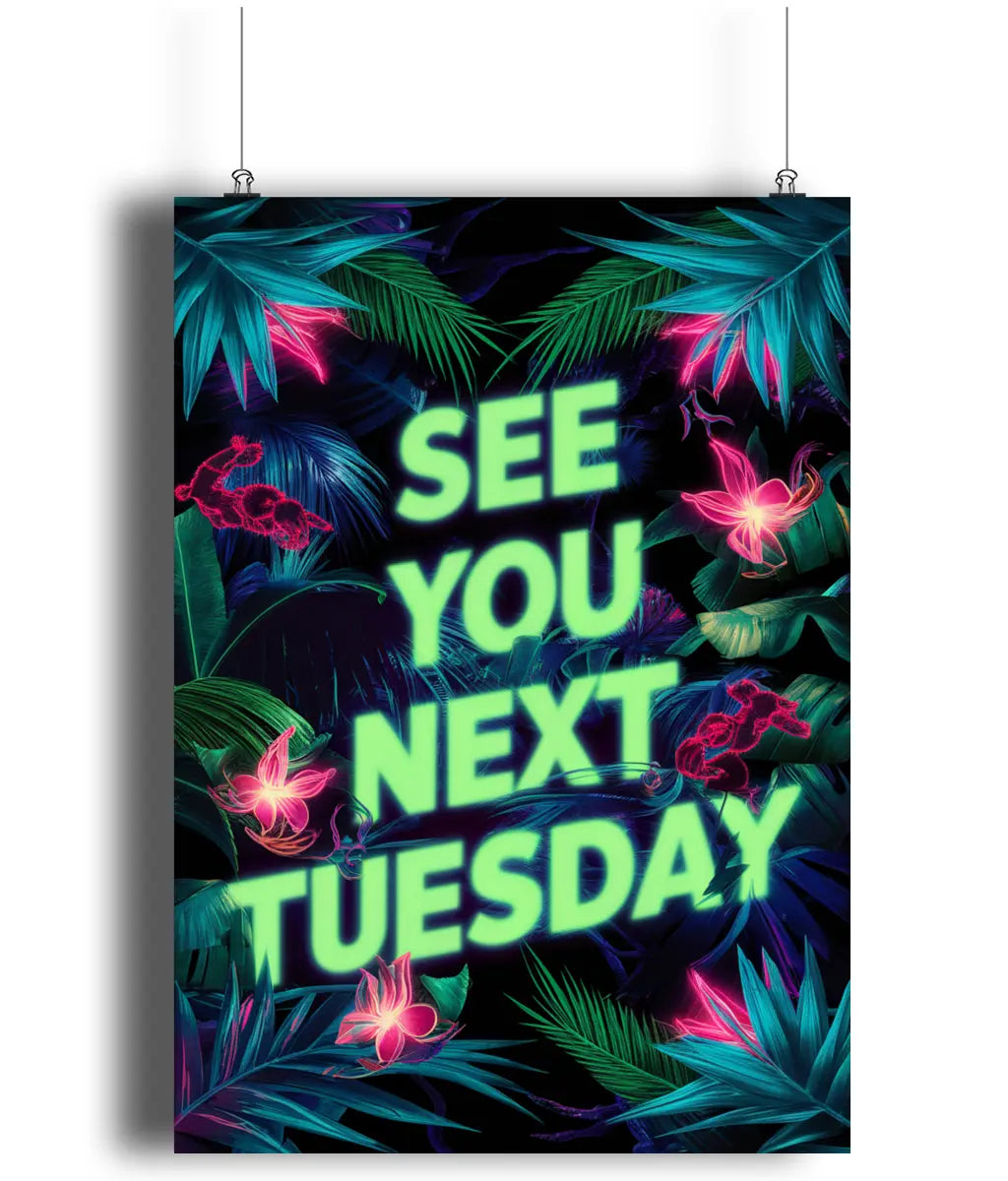 Neon Sign Print, Add a bold statement to your space with this "See You Next Tuesday" neon wall art. The vibrant jungle design brings a playful twist to any room. Perfect for those who don't take life too seriously.