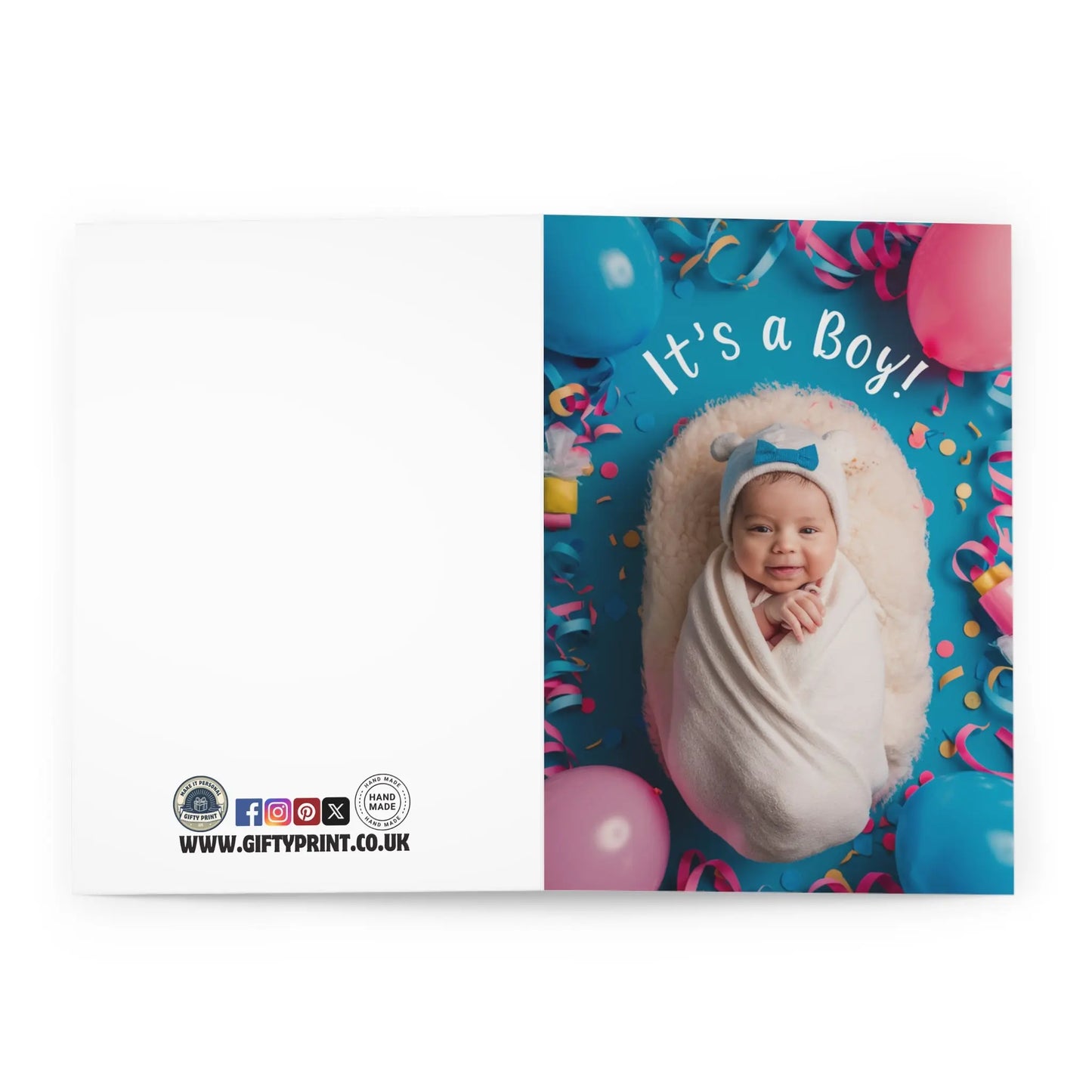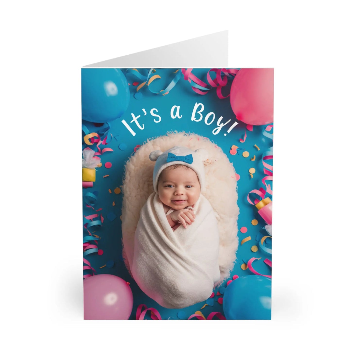 New Baby Card, Celebrate the arrival of a baby boy with our "New Baby Card" featuring a charming swaddled design in blue. Perfect for showing your love and congratulations to new parents.