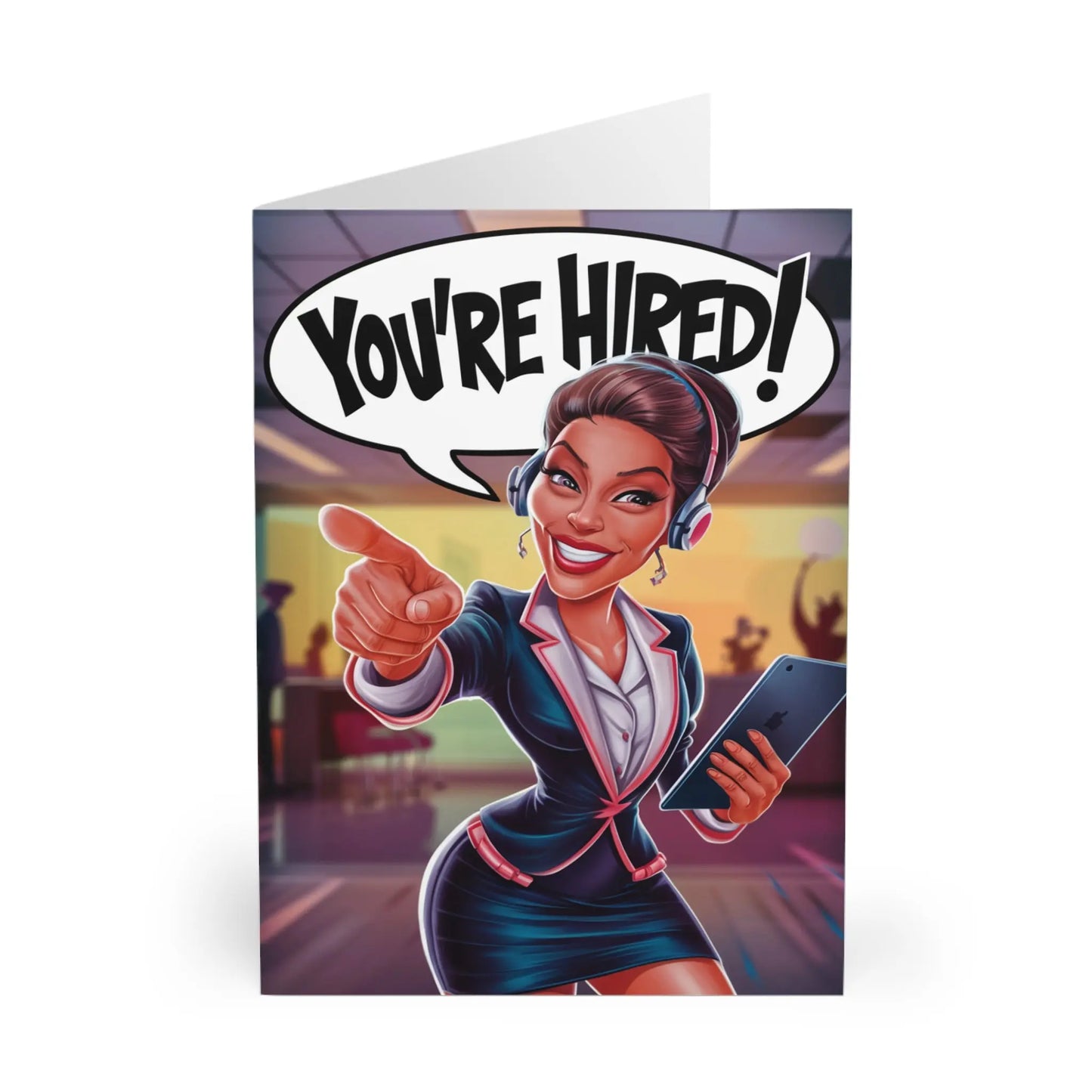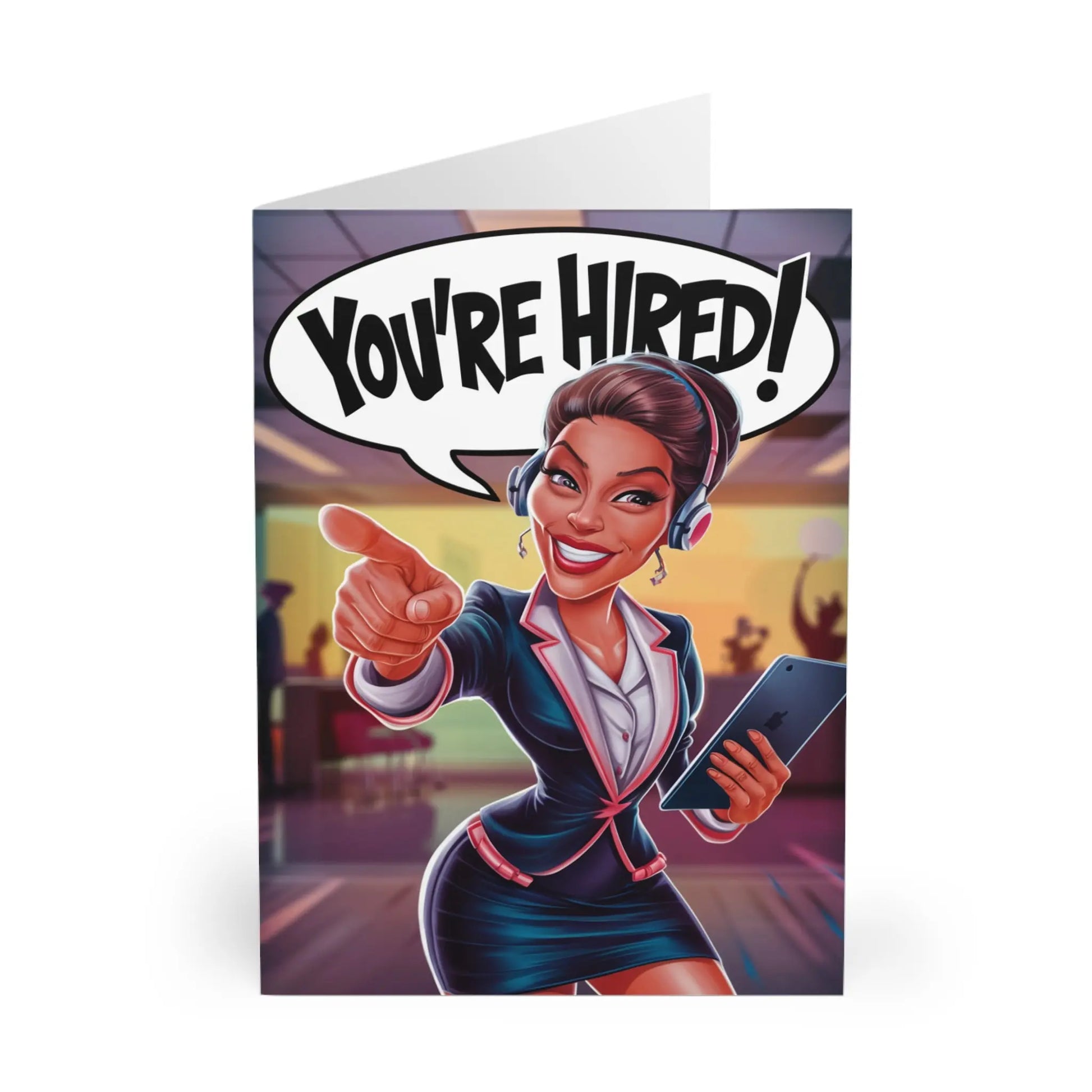 New Job Card, Land your dream job in style with this playful card. Featuring a trendy power-dressed figure, this card congratulates the recipient on their new job in a fun and quirky way. Perfectly suited for anyone with a sense of humour and style! You're hired!