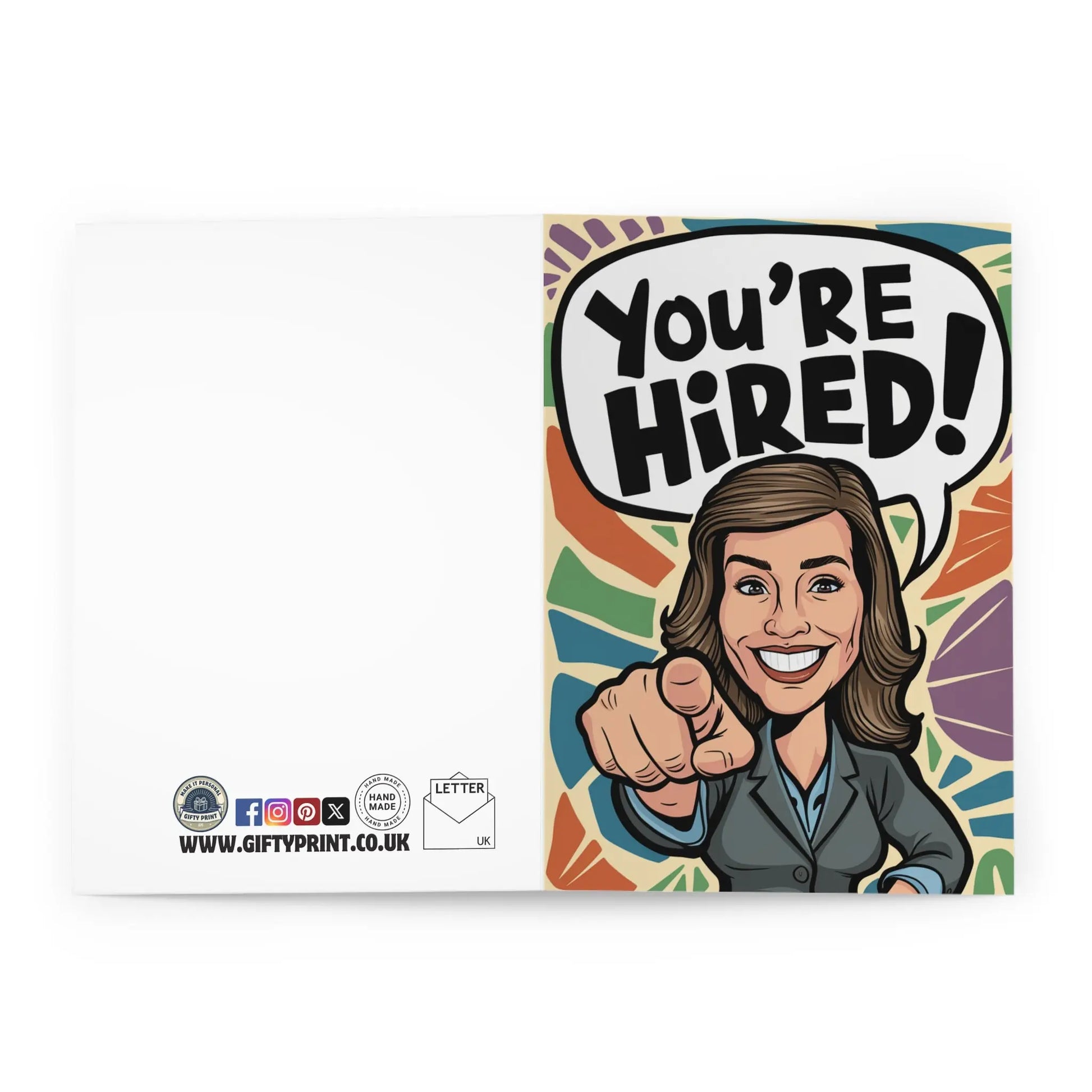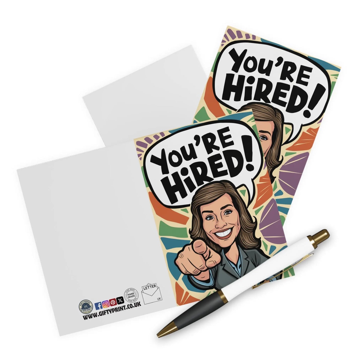 New Job Card, Say goodbye to the days of boring and stuffy congratulations cards. Say hello to our "You're Hired" card featuring a chic, suited woman ready to crush her new job. Celebrate the exciting new chapter in your friend's or loved one's life with this playful and quirky card. Rock on, boss babe!