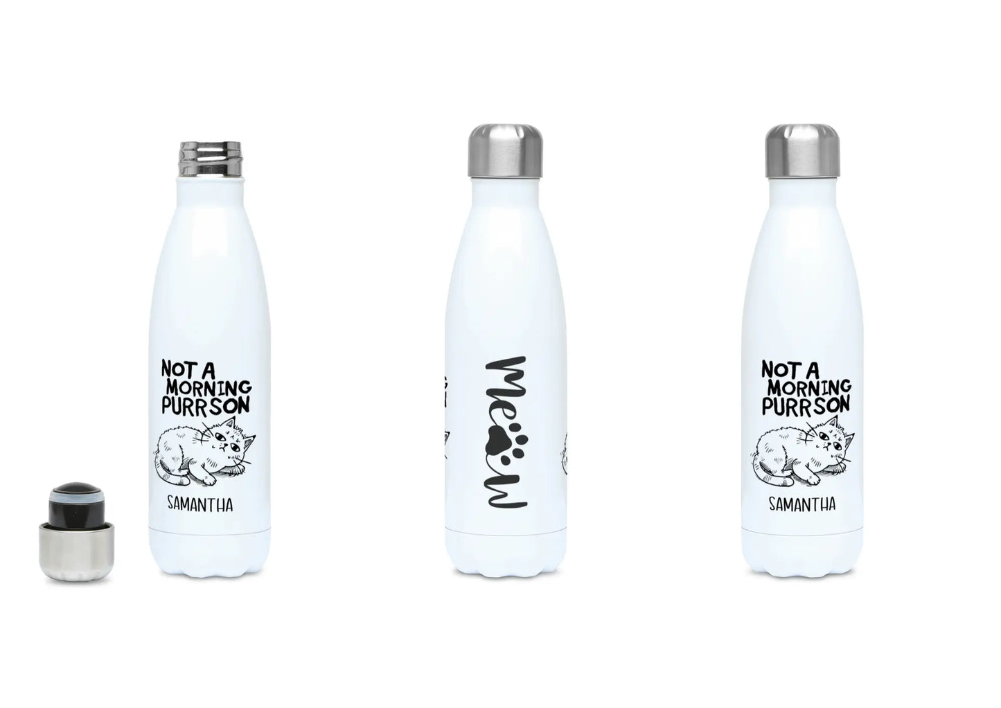 personalised water bottle, Quench your thirst (and your sense of humour) with our Personalised Water Bottle. This 500ml bottle features a playful "I'm Not A Morning Purrson" design, and can be personalised with a name. Stay hydrated and sassy all day long! Keep drinks hot or cold!