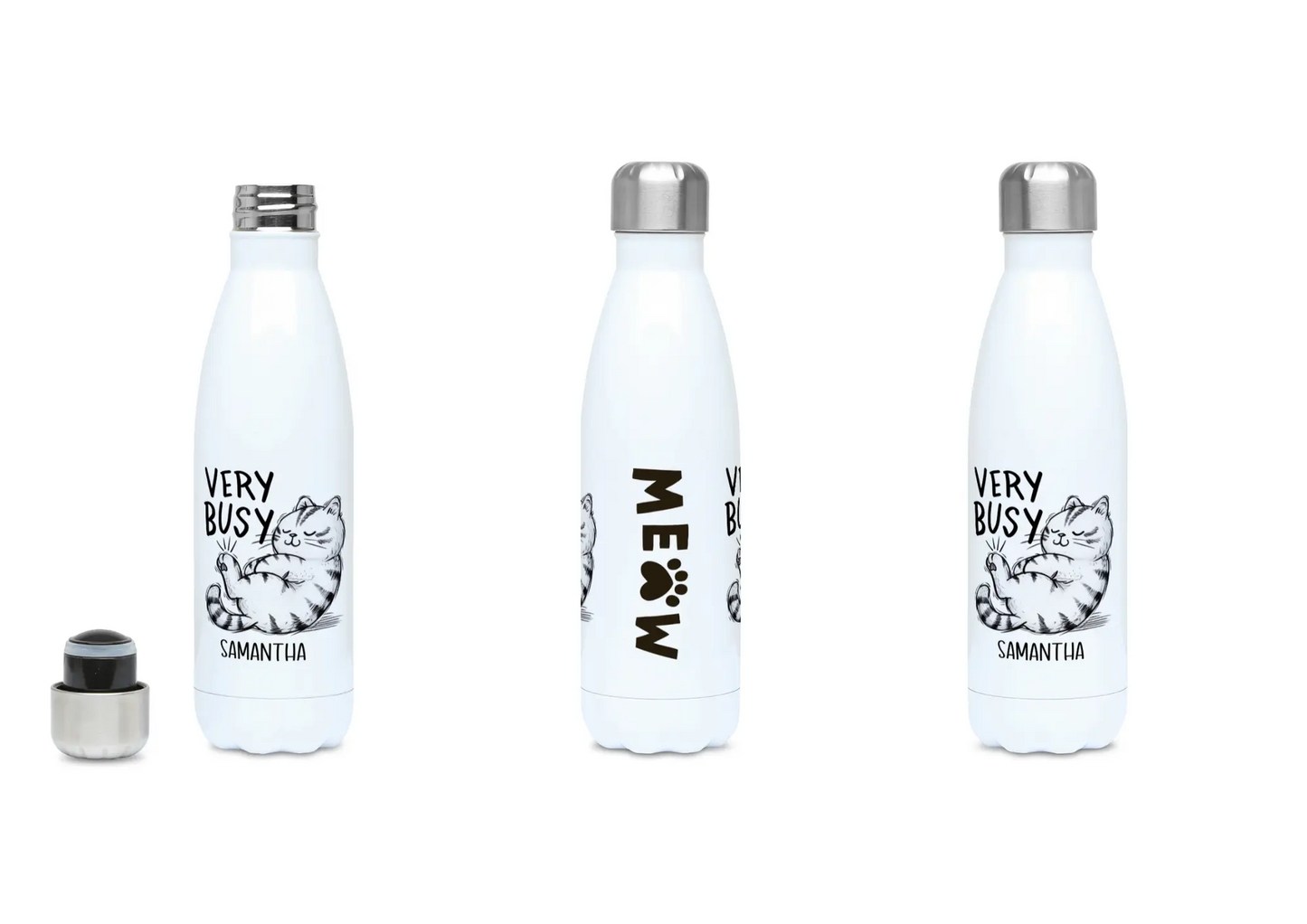 Personalised Water Bottle, Quench your thirst in style with our Personalised Very Busy Cat Insulated Water Bottle. With a 500ml capacity, this bottle will keep your drinks at the perfect temperature all day long. Plus, the cute and quirky cat design will show off your personality. Perfect for any busy bee (or cat) on the go.