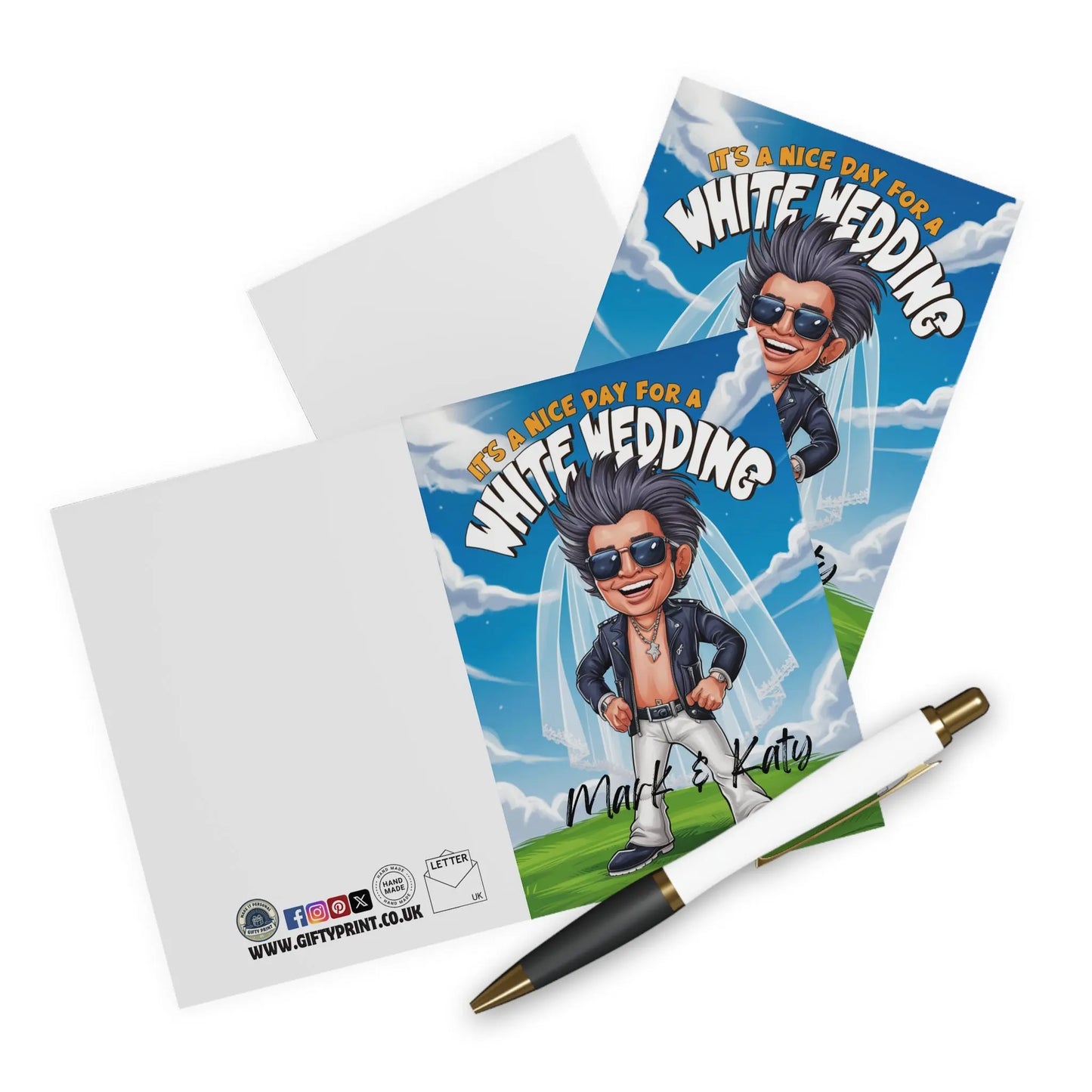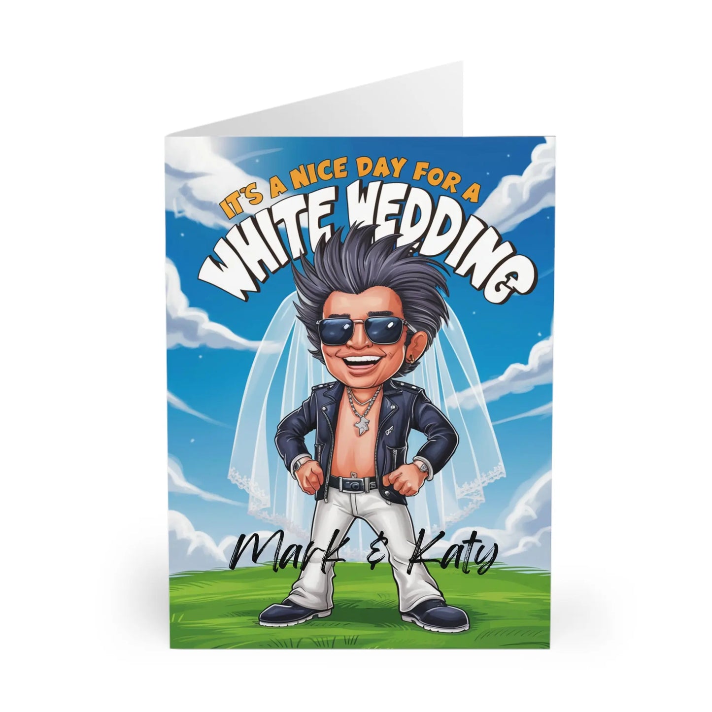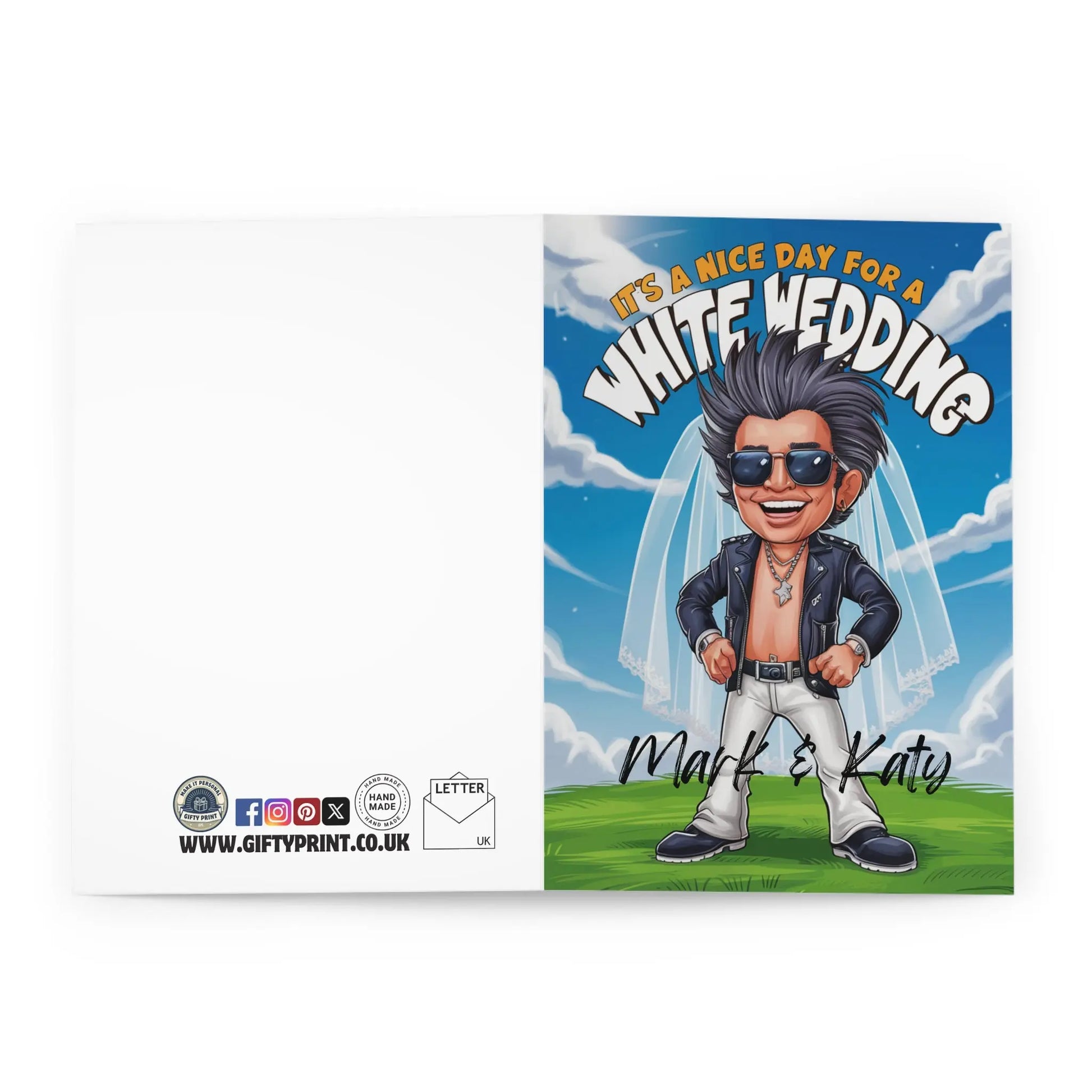 Personalised Wedding Card, Make their special day even more unforgettable with this personalised wedding card featuring Billy Idol's iconic song title, "It's a Nice Day for a White Wedding". The perfect way to share your congratulations and add a touch of fun to the celebration. (Note: Does not come with Billy Idol singing in the background!)