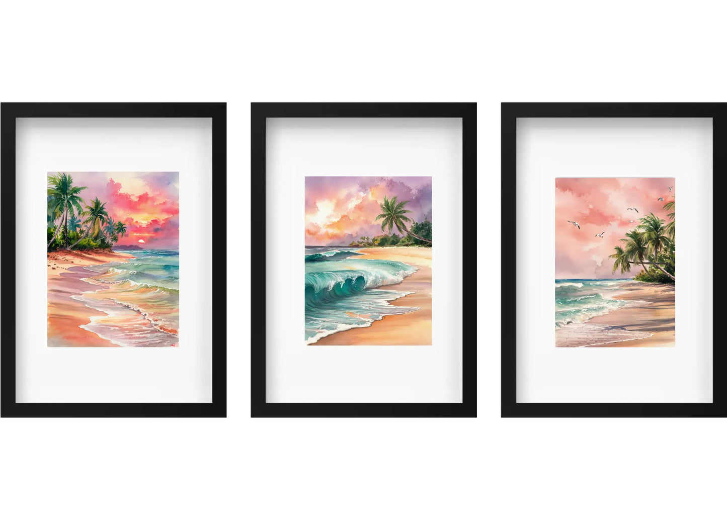 Set Of 3 Framed Tropical Beach Watercolour Artworks 21cm x 30cm