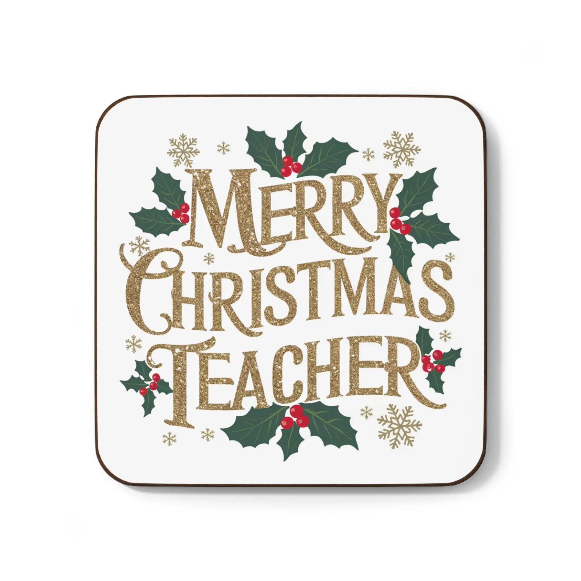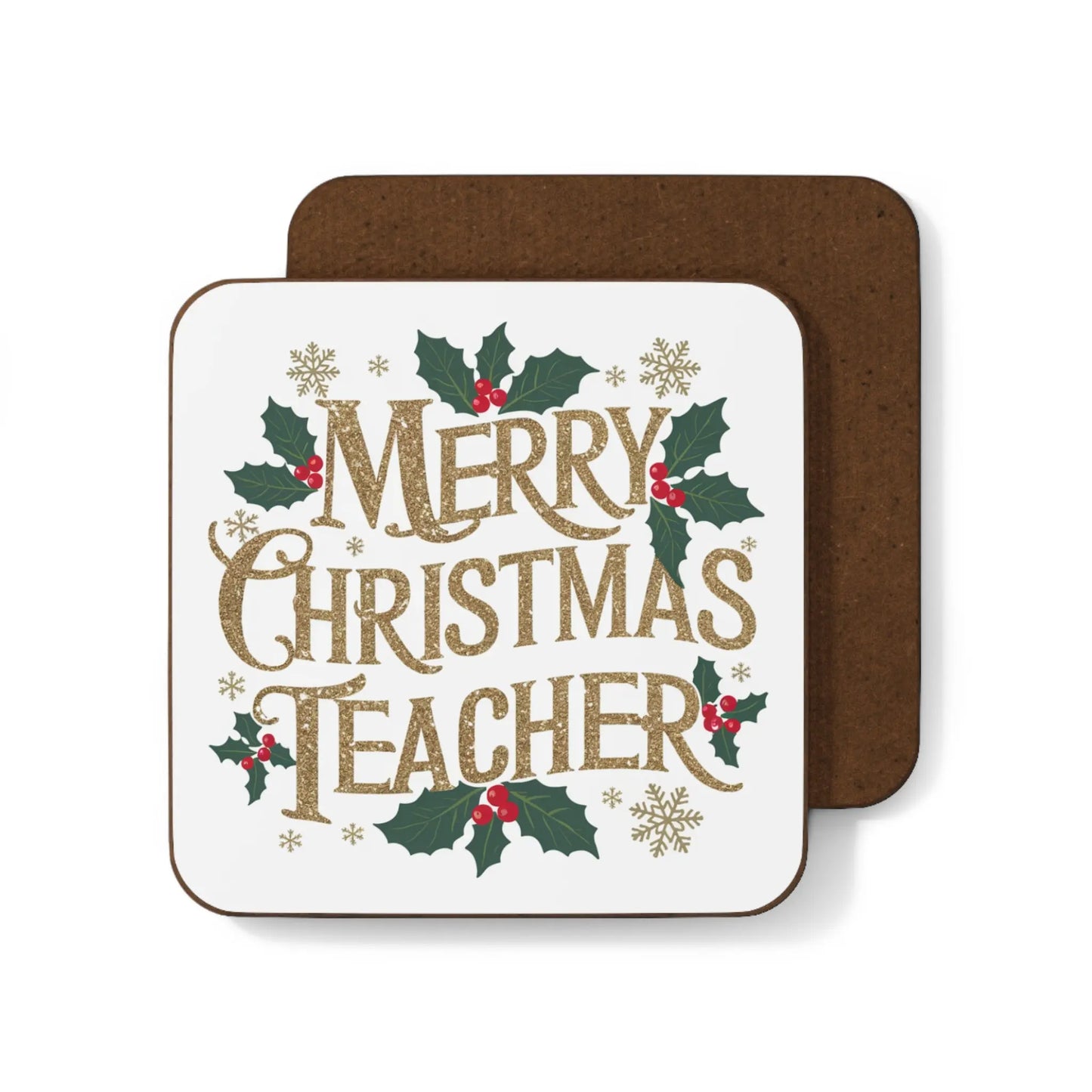 Teacher Christmas Gift, Celebrate the most wonderful time of the year with this gold and holly hardback coaster! Perfect for teachers, it's a festive addition to any desk or table. Say goodbye to pesky drink rings and hello to holiday cheer.