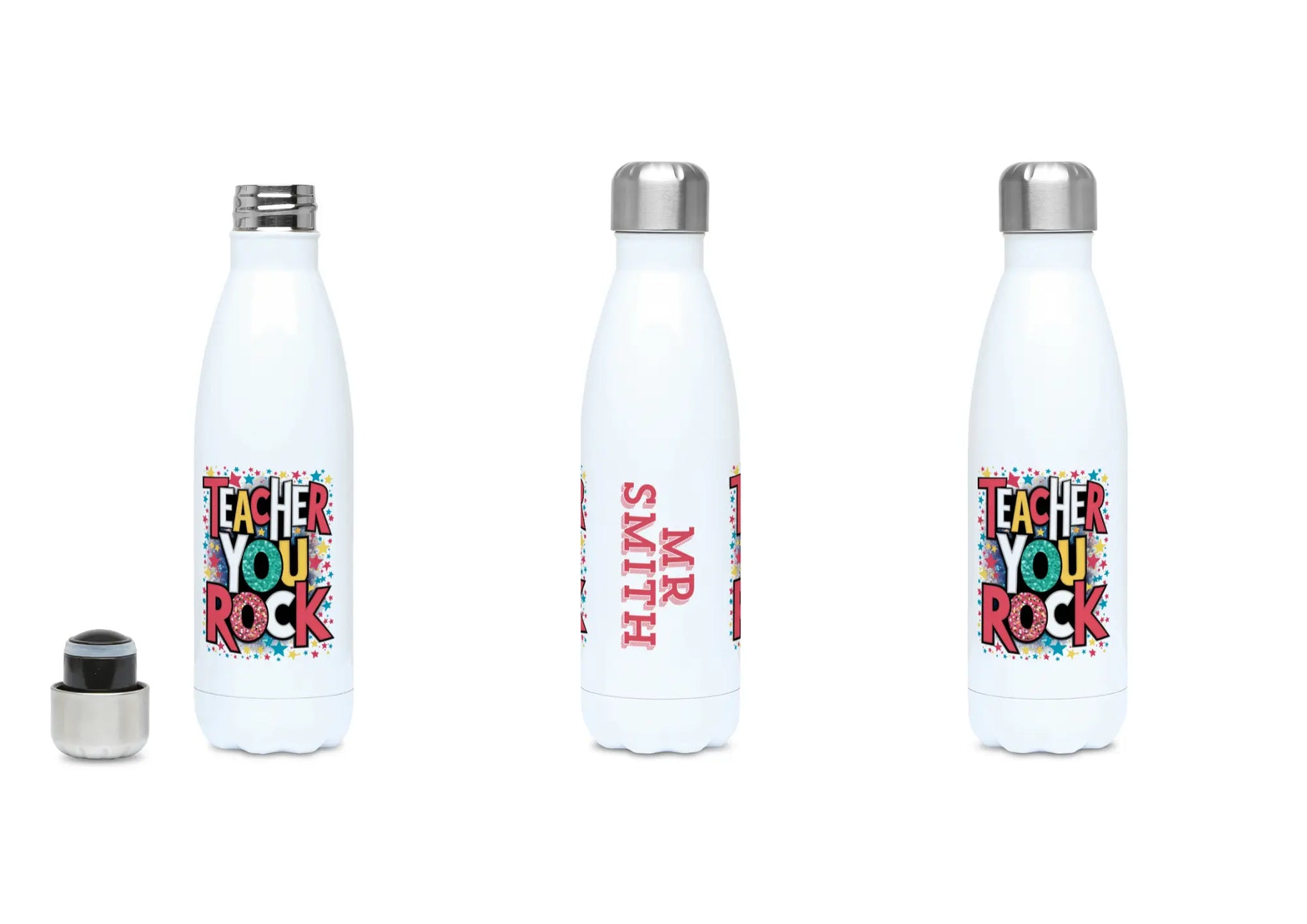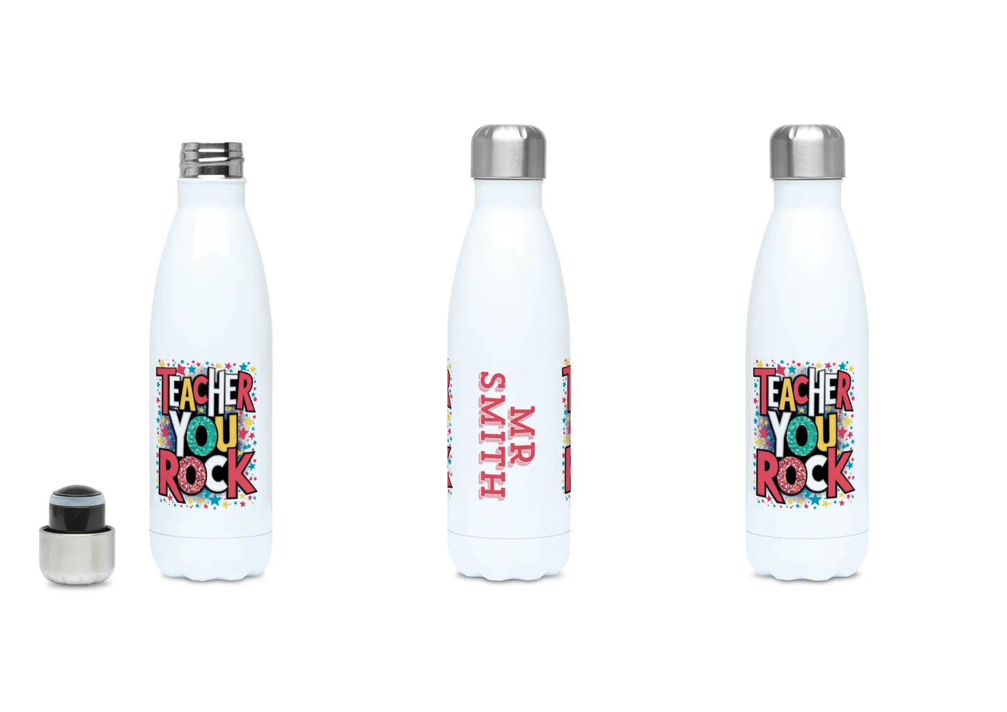 Teacher Water Bottle, Show your appreciation for an amazing teacher with our Personalised Teacher You Rock Water Bottle. Customized with their name, this bottle will keep them hydrated and smiling throughout the day. The perfect gift to thank them for all their hard work (and rockstar teaching skills)!
