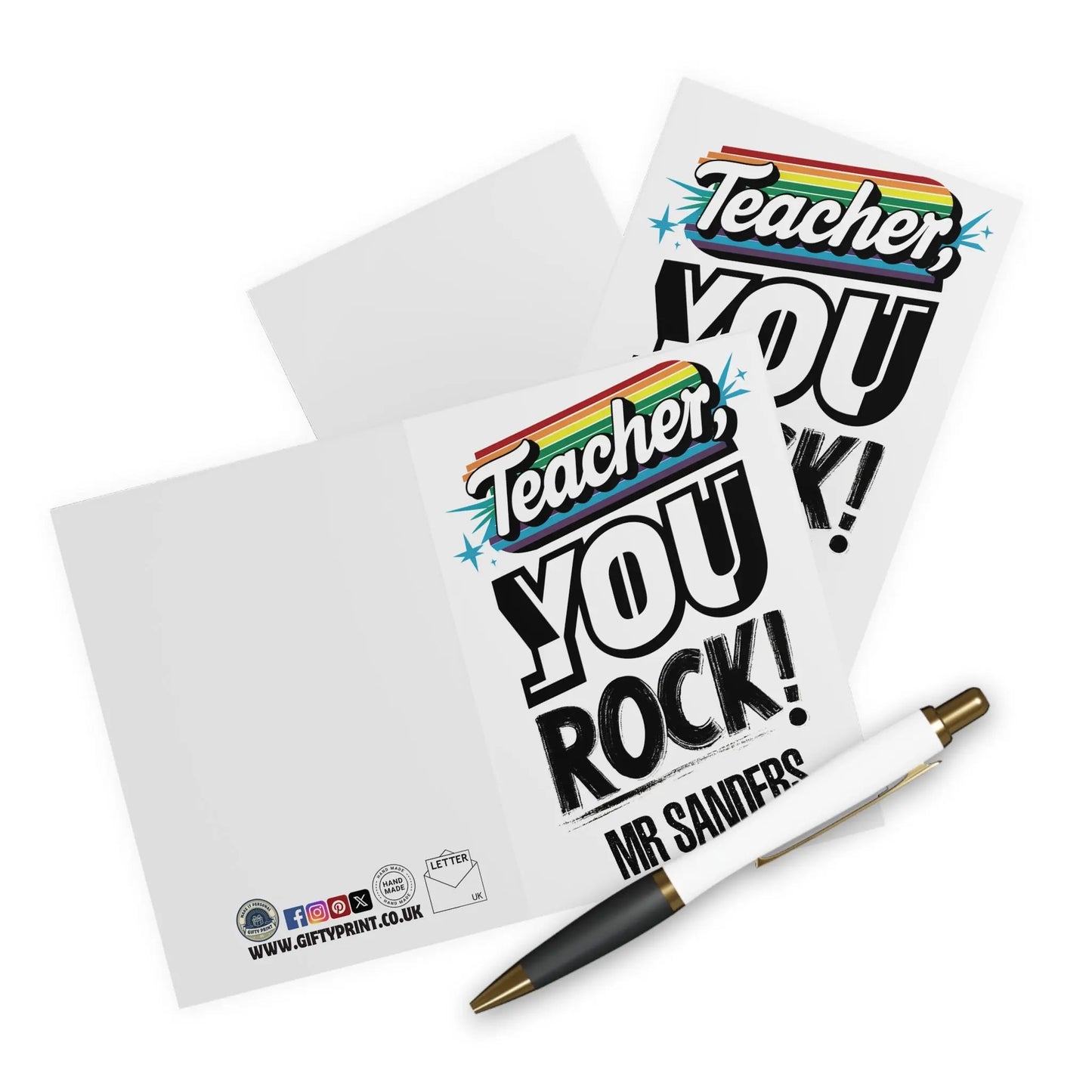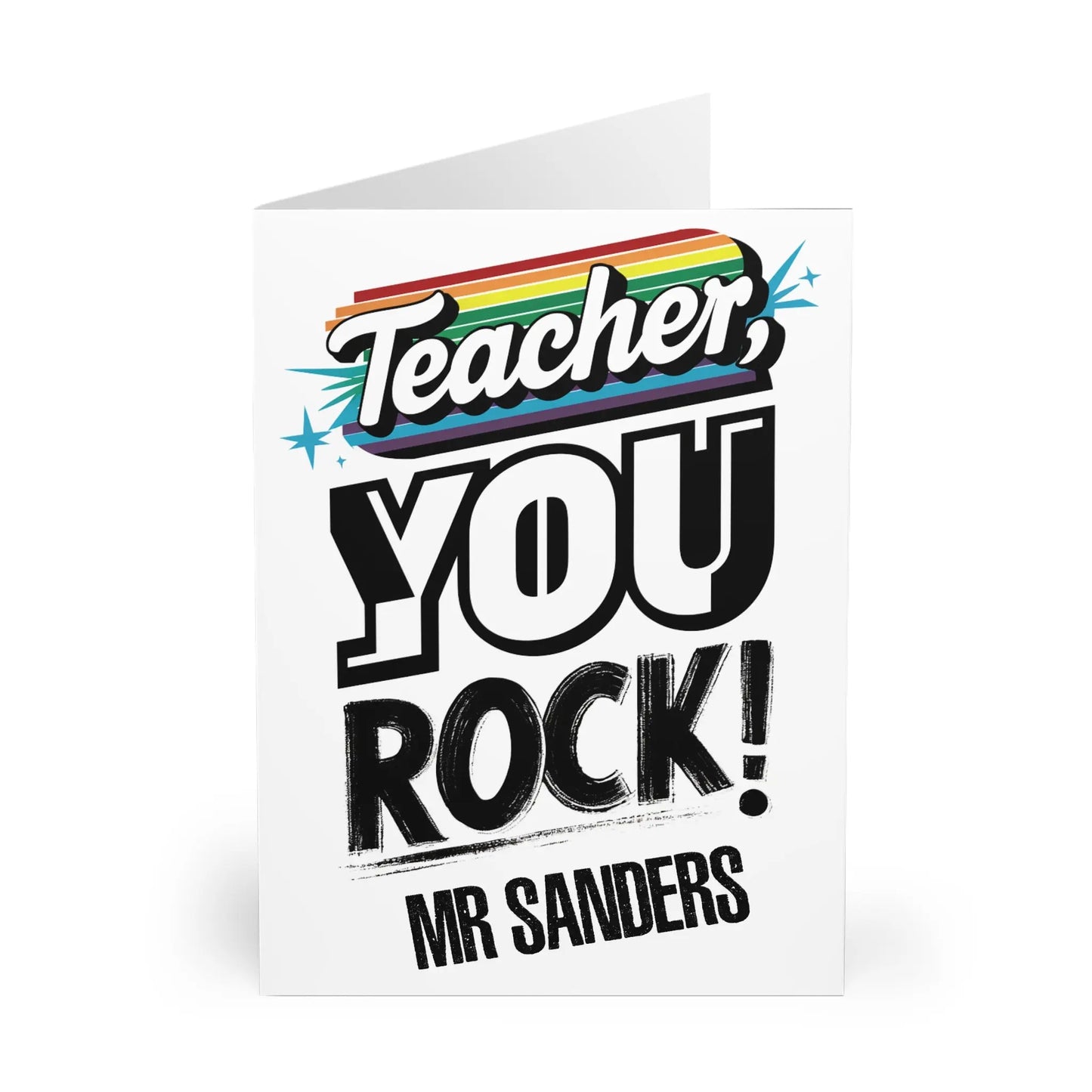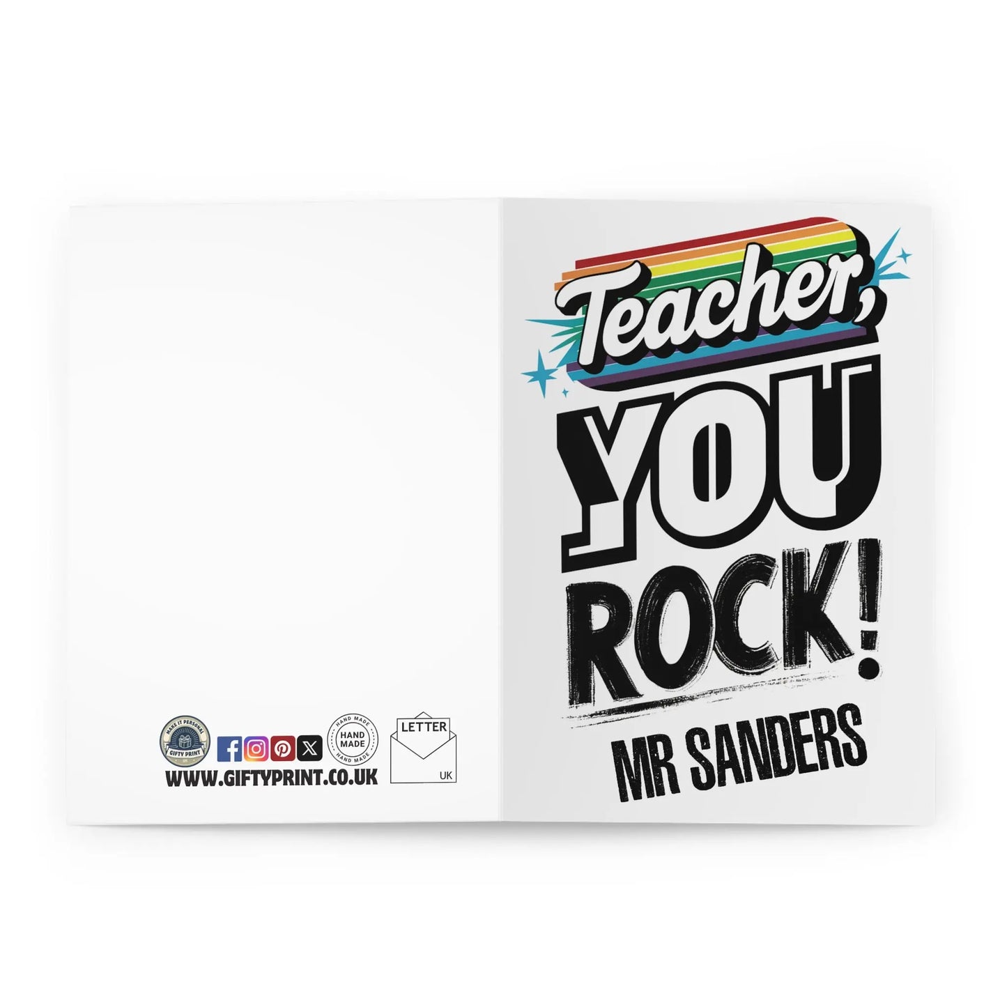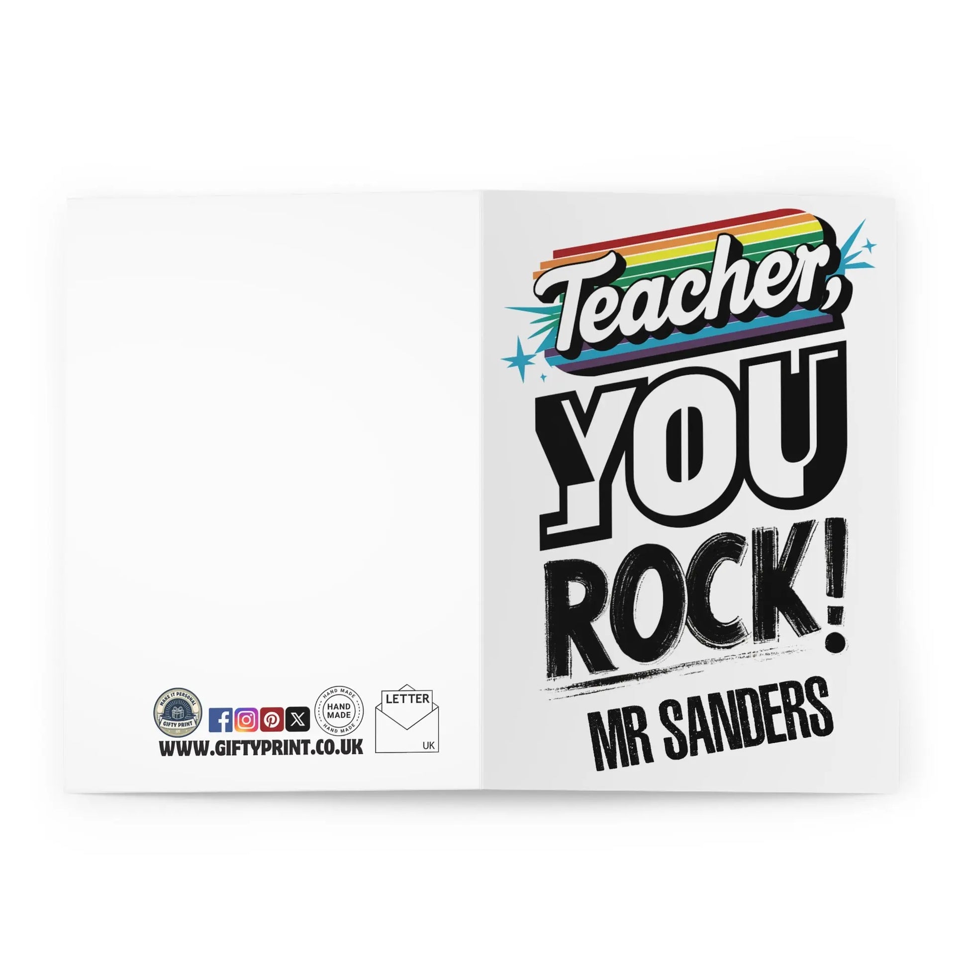 Teachers Card, Show your appreciation to your teacher with this personalised card! Let them know they rock with a customised message or name. A thoughtful and unique way to say thank you. Make their day with this special card. They'll love it, we guarantee it!