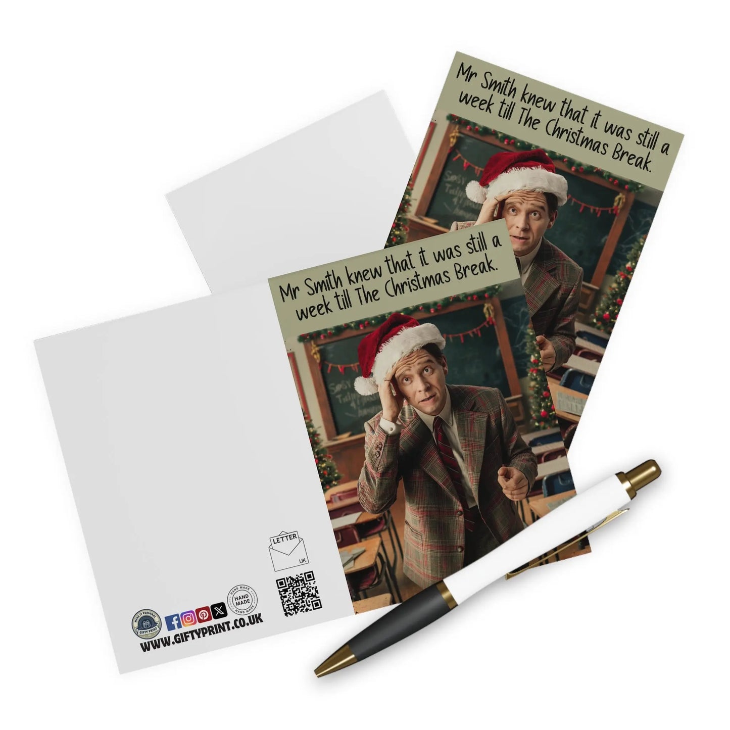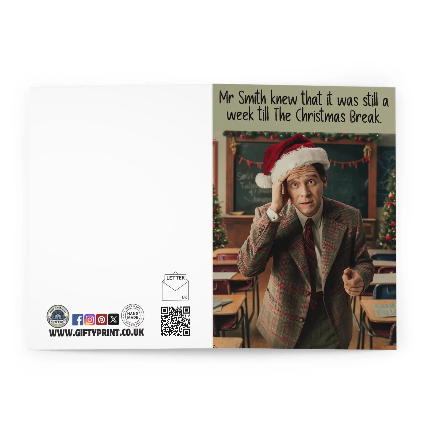 Teachers Christmas Card, Let your favourite teacher know you appreciate them with this personalised funny Christmas card! Featuring a hilarious pun, this card is sure to bring a smile to their face. Show them you know how much they deserve a break after a long week of teaching. Get yours now - they'll love it!