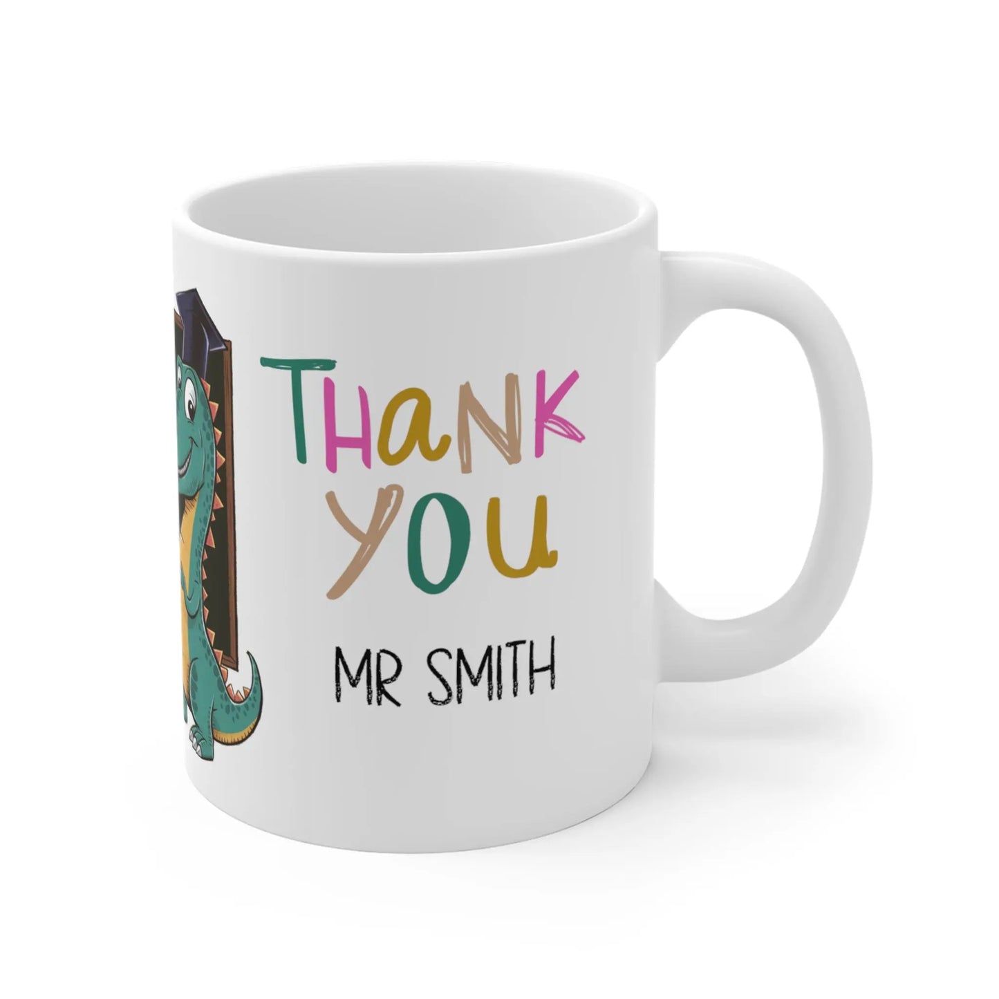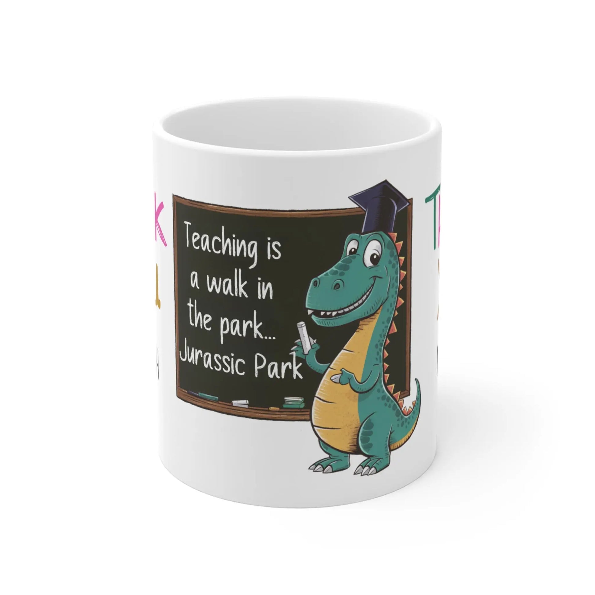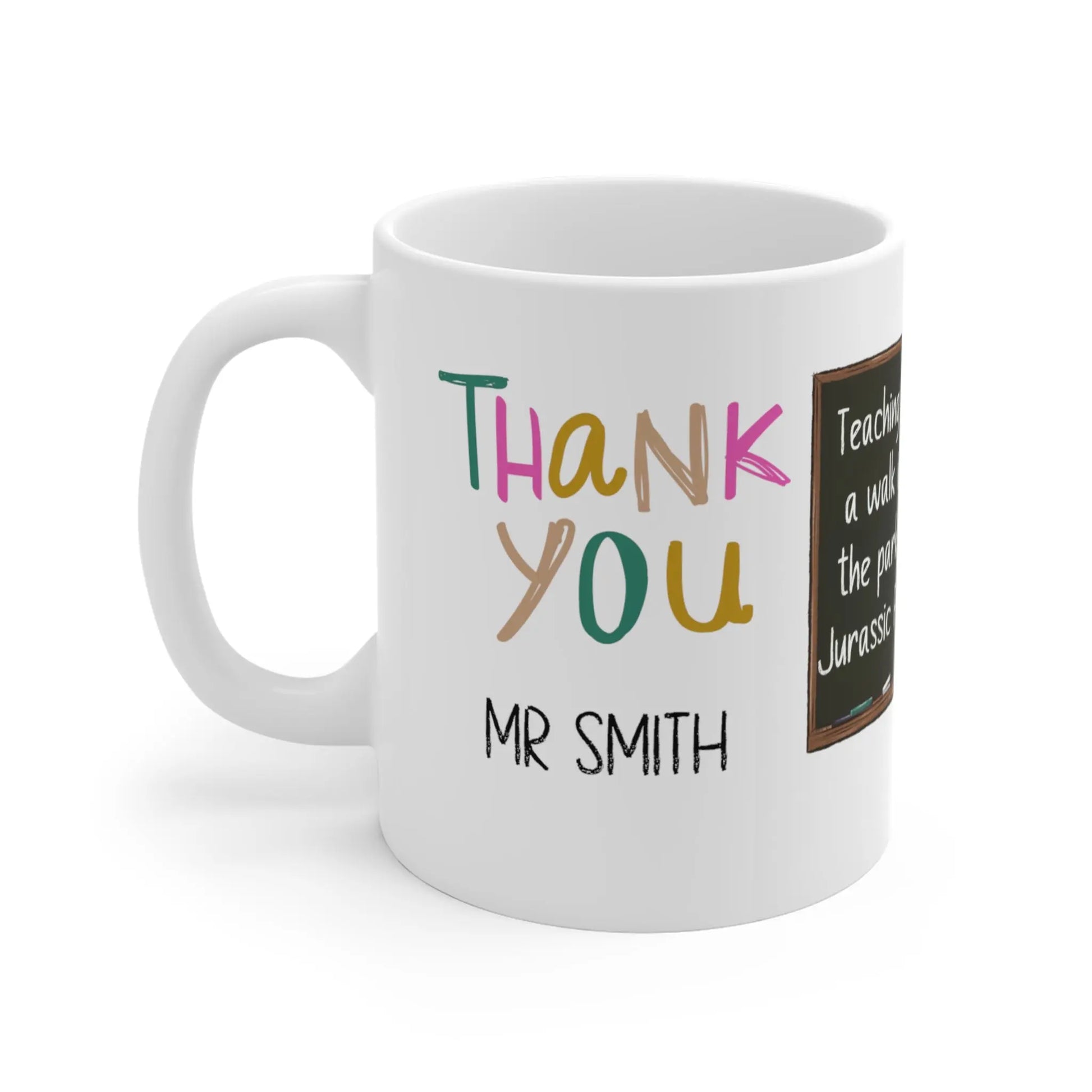 Teachers Mug, Make your favourite teacher's day with this quirky mug! Personalised with their name, it's the perfect gift for any occasion. Remind them that teaching may be a walk in the park, but with Jurassic-sized challenges! (Get it?) A fun and unique addition to their mug collection. Rawr!