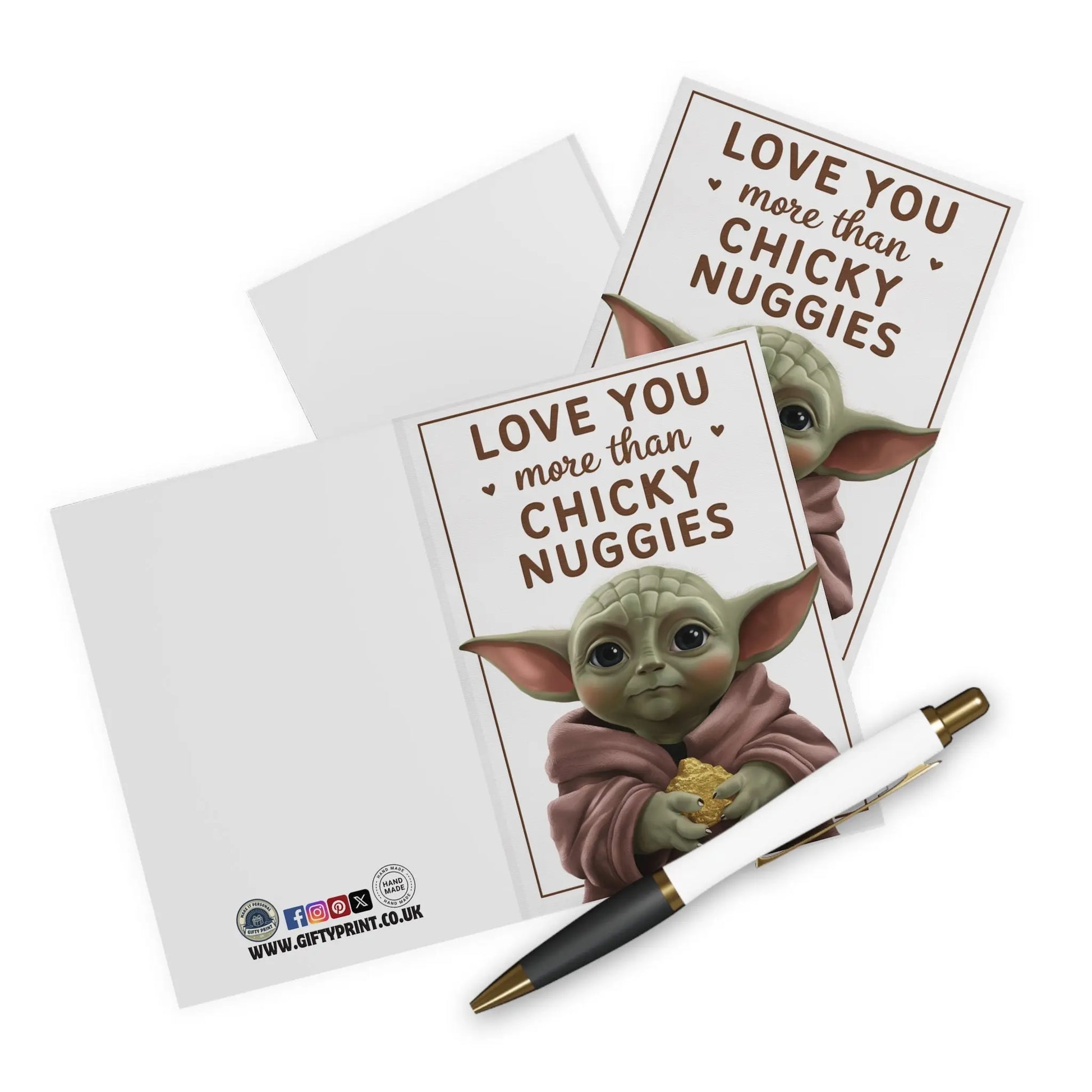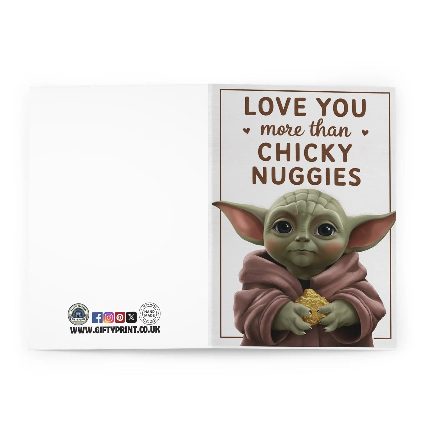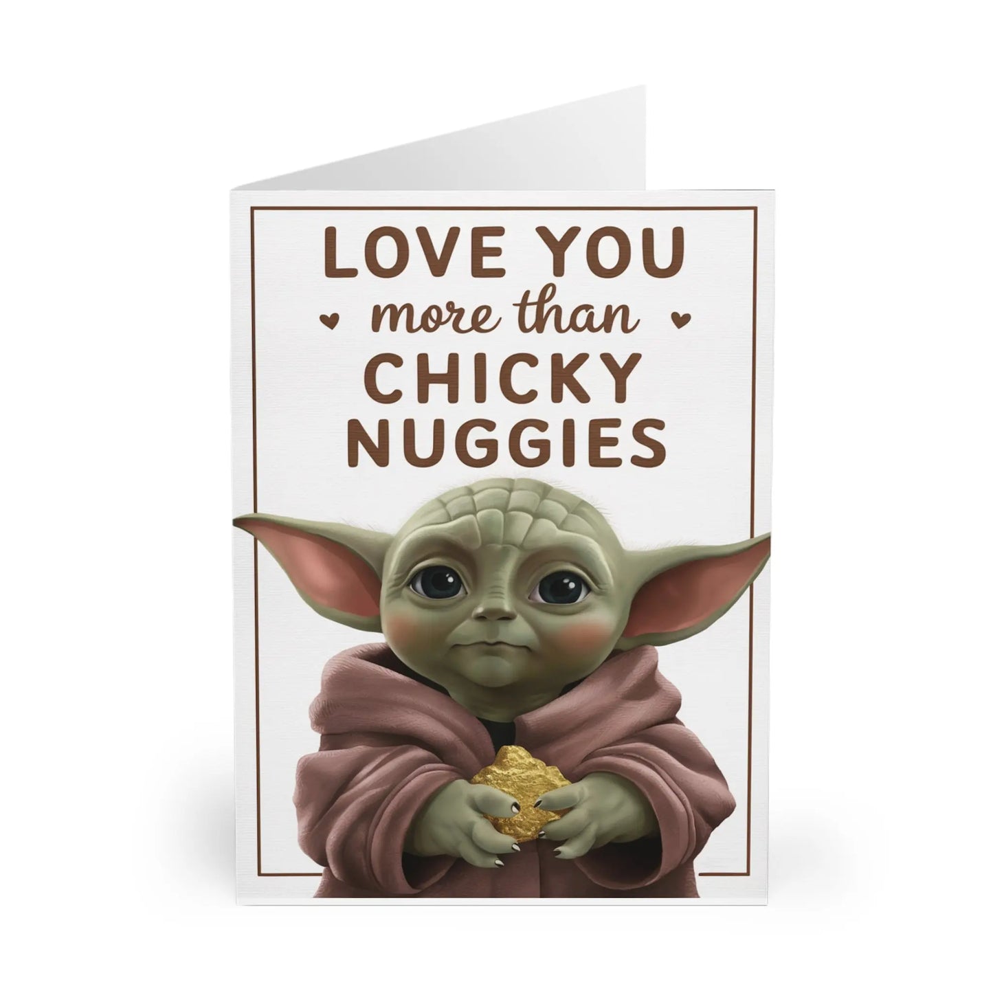 Valentines Day Card, Express your love in a playful way with our Valentines Day Card featuring Yoda! Show how much you care with this quirky card that declares "Love you more than nuggies" - a nod to both Yoda's wise words and a popular food trend. Perfect for Star Wars fans and those who don't take love too seriously.