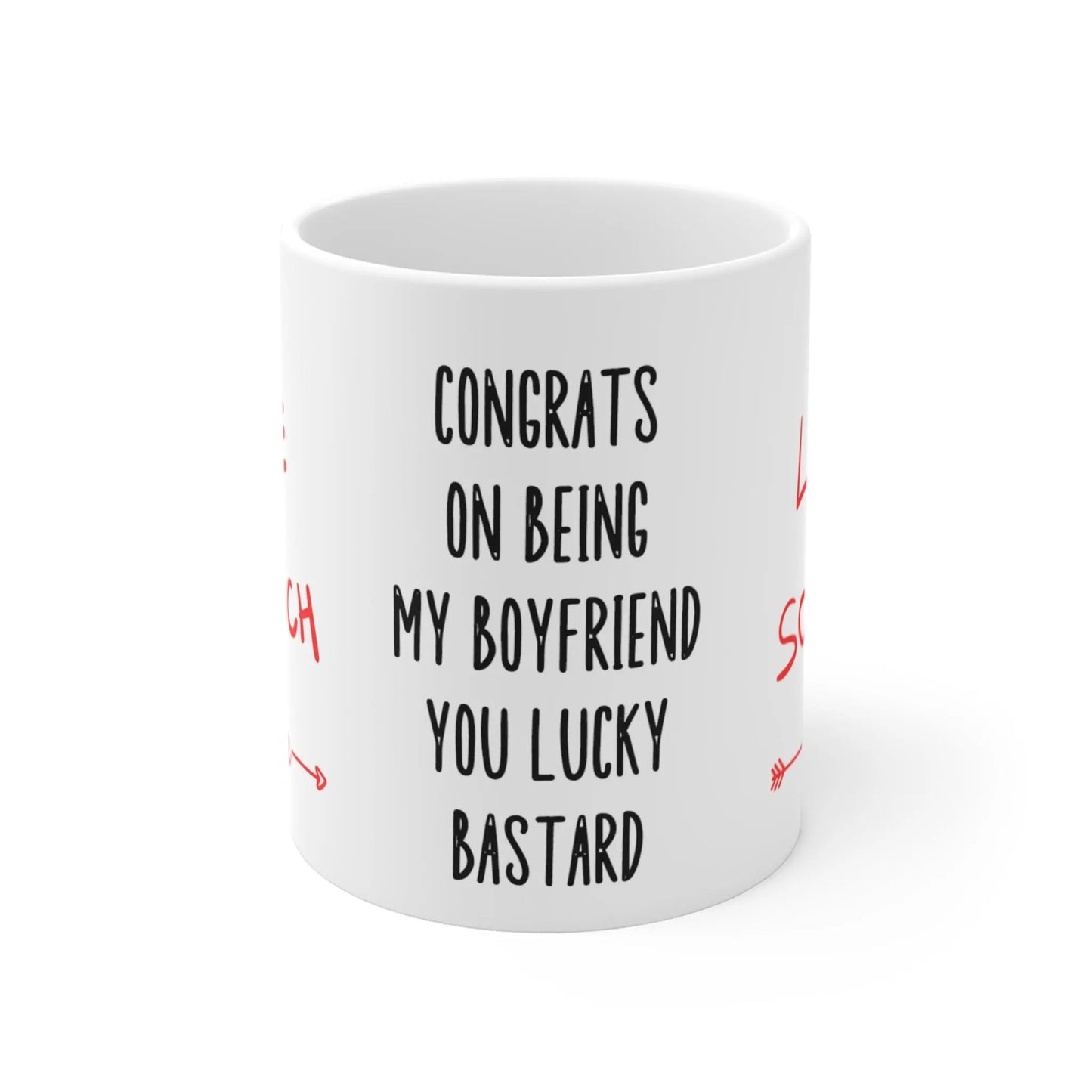 Valentines Day Mug, Get ready to make your boyfriend feel like the luckiest guy in the world with our Valentines Day Mug! Congrats on landing such an amazing guy (you lucky bastard). This mug is the perfect way to show your love while keeping things playful and fun. No cliches here, just pure awesomeness.