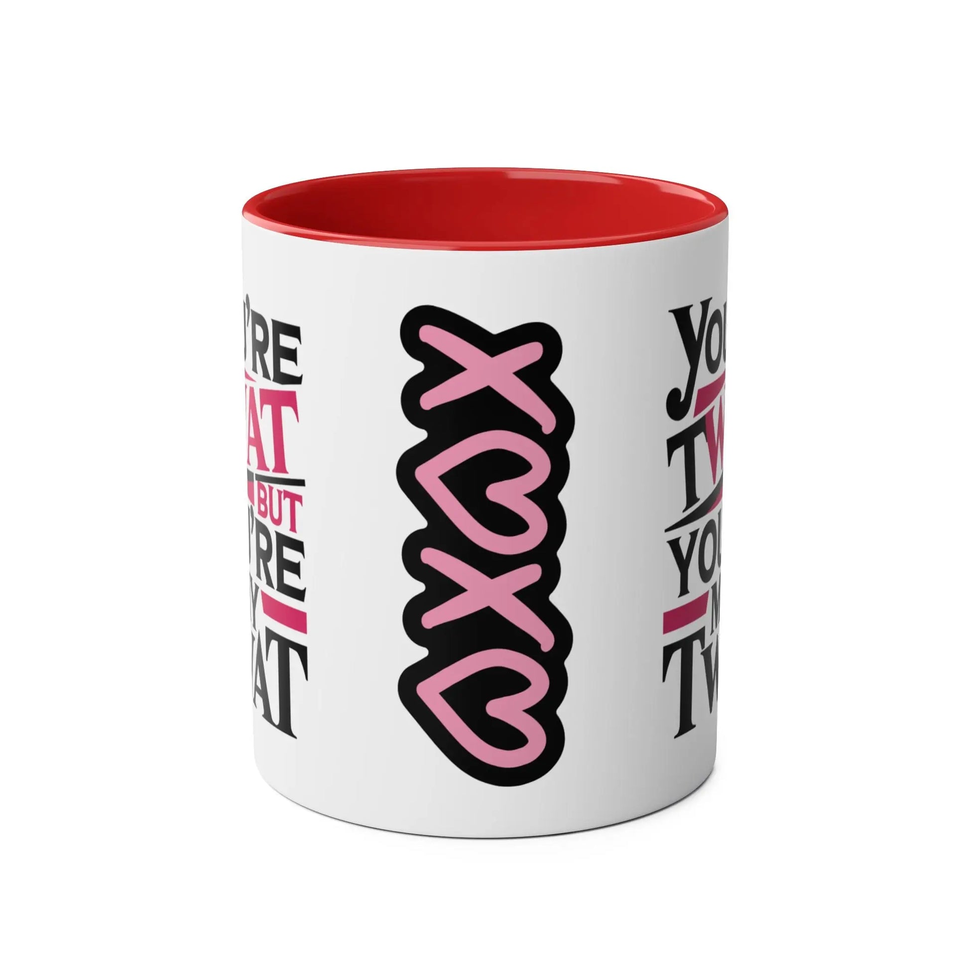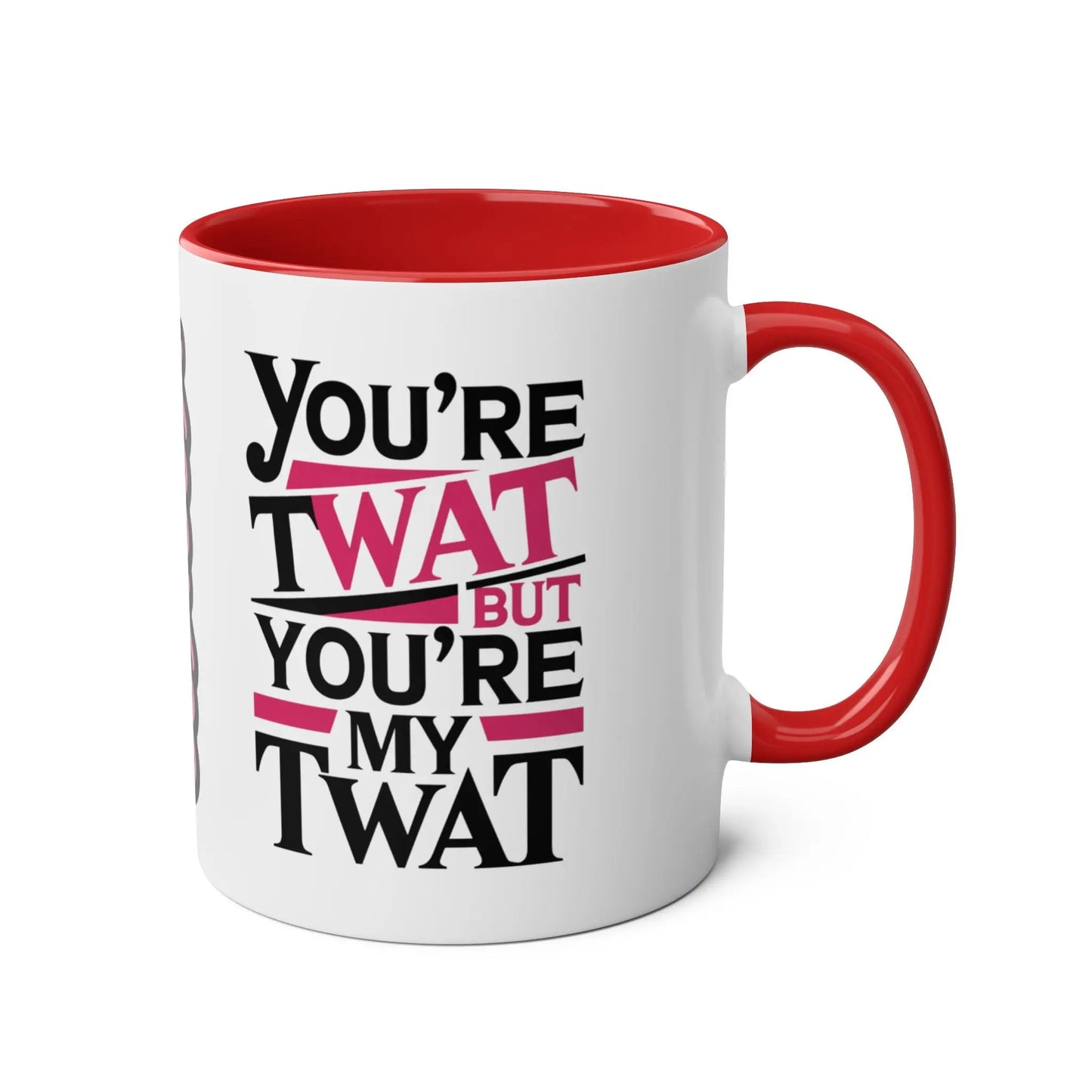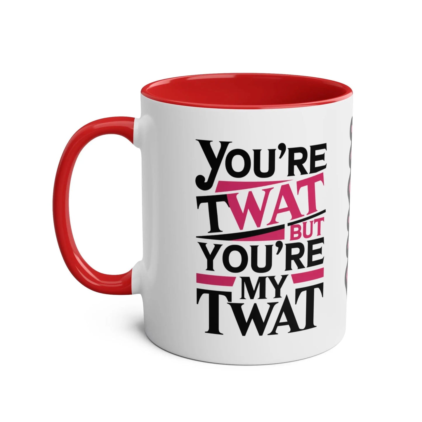 Valentines Day Mugs, Celebrate your special someone this Valentine's Day with our You're A Twat But You're My Twat Mug! Show them that even though they may be a twat, they're your favourite twat. With this quirky and fun mug, you can make them laugh and feel loved at the same time. Cheers to love and laughs!