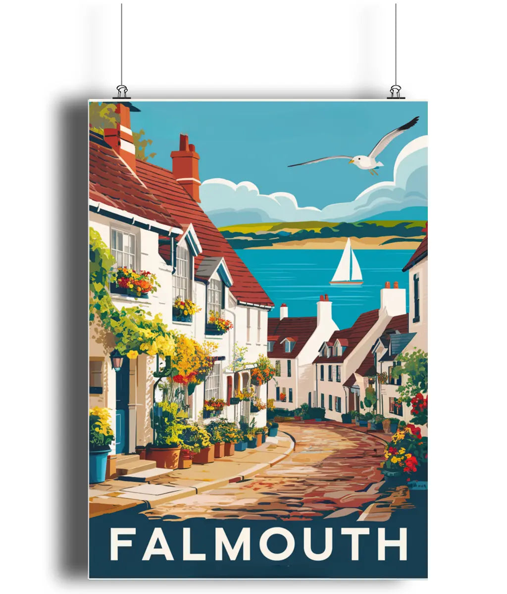 Vintage Travel Art Print, Take a trip to Falmouth with this vintage wall art print! Featuring a charming scene of colorful houses and a seaside town, it will add a touch of nostalgia and whimsy to any room. Perfect for those who love to travel or appreciate unique and quirky decor.