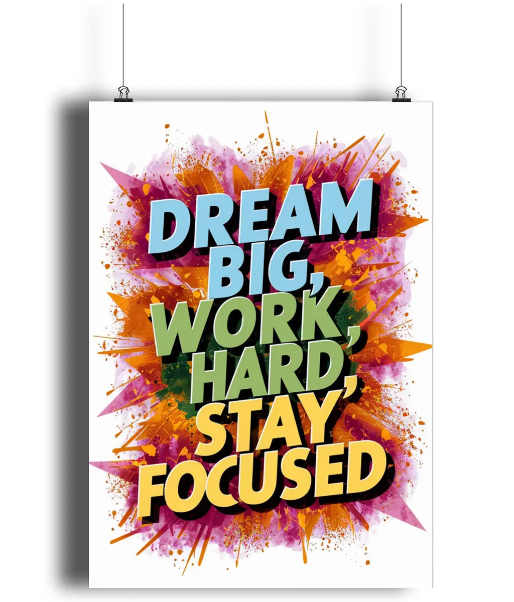 Wall Art Print, Elevate your space with our inspirational wall art print sign. Featuring the timeless reminder to dream big, work hard, and stay focused, this piece serves as a daily source of motivation. With a touch of sophistication, this print adds a luxurious touch to any room.